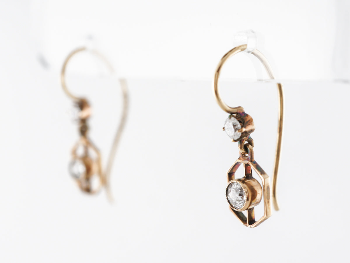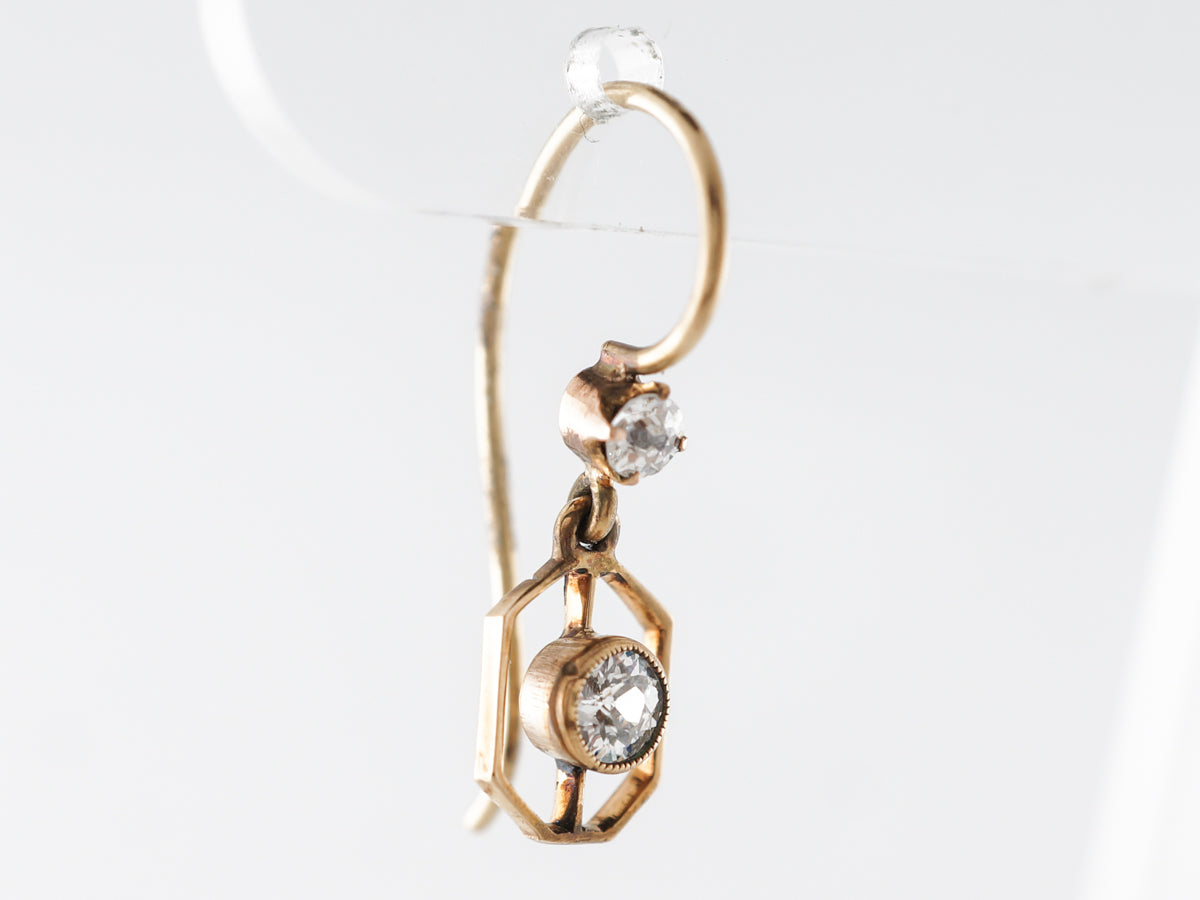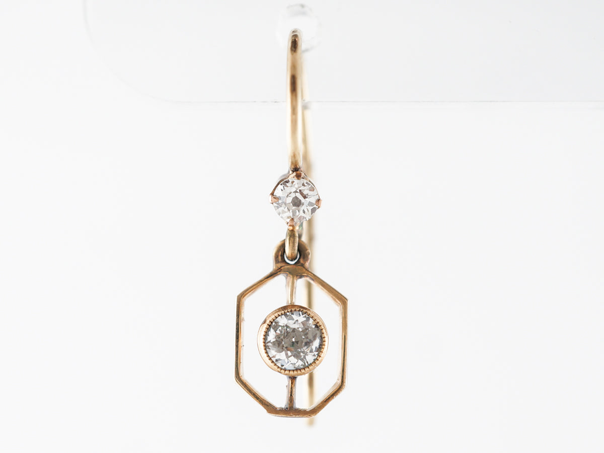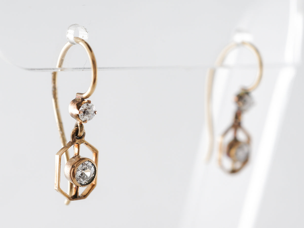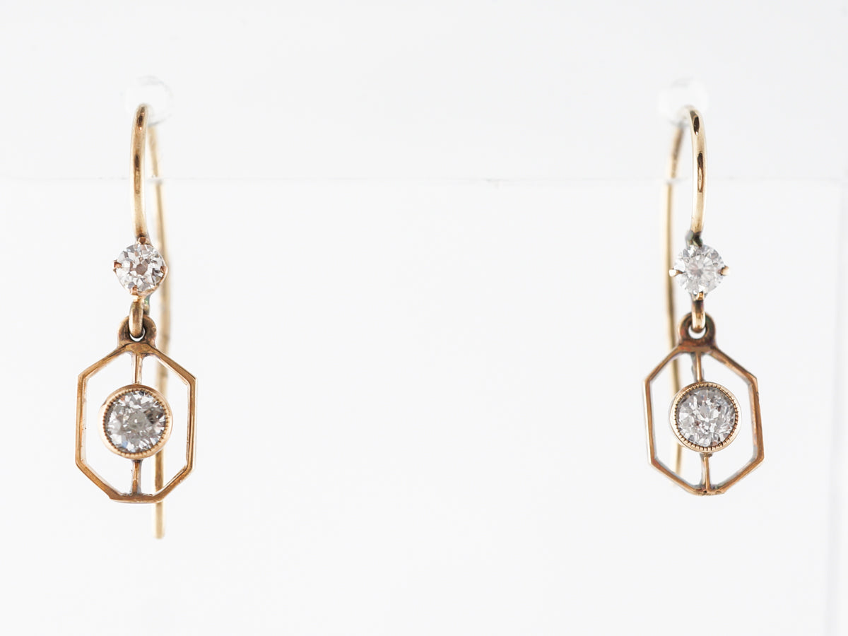 Vintage Deco Diamond Earrings 14k Yellow Gold. These fantastic Art Deco earrings feature .42 carats of diamonds and are finished in 14 karat yellow gold. The very open style dangle earrings have a .05 carat diamond bezel set and floating inside a wider golden hexagon. There is another diamond which is bead set along the wire that continues back to become the closure. These earrings are simple and beautiful and would make a perfect gift!