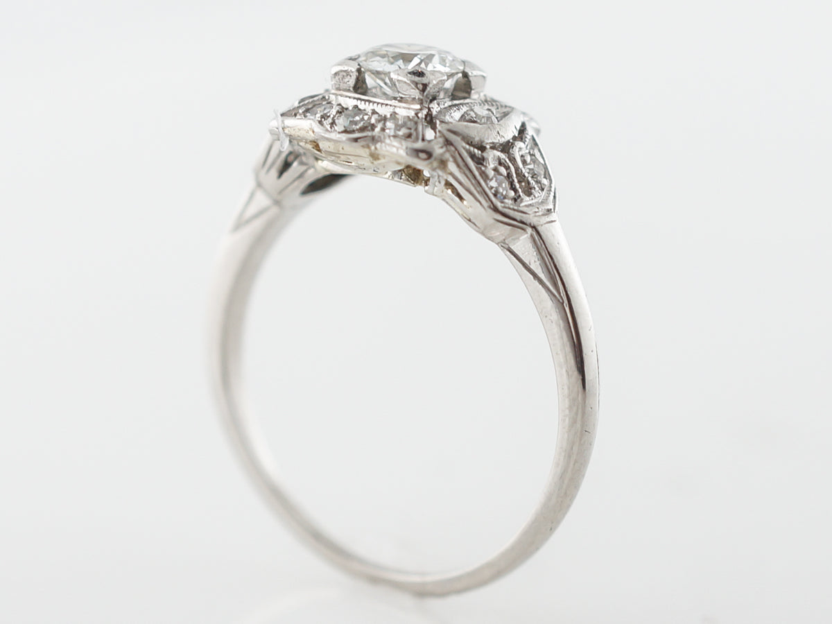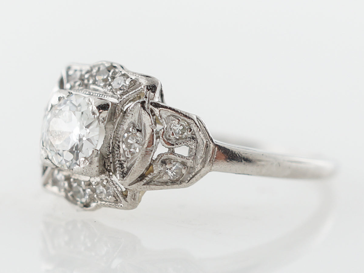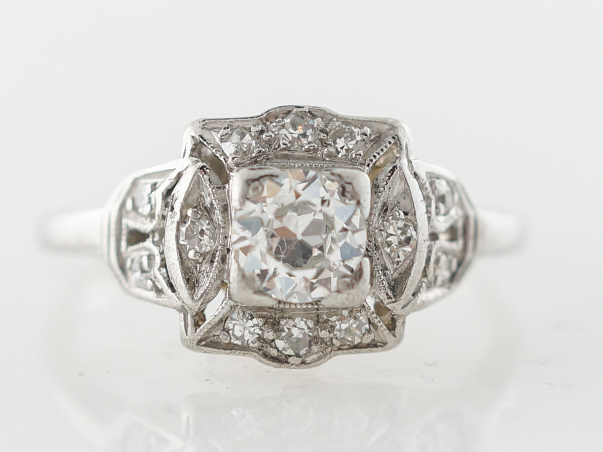 Vintage Deco Diamond Platinum Engagement Ring. This original vintage art deco engagement ring features a .44 carat old European cut diamond. The center diamond is accented by single cut diamonds on every side, providing extra sparkle with every movement. Finished in platinum, this ring sits very low to the finger making it very easy to wear.