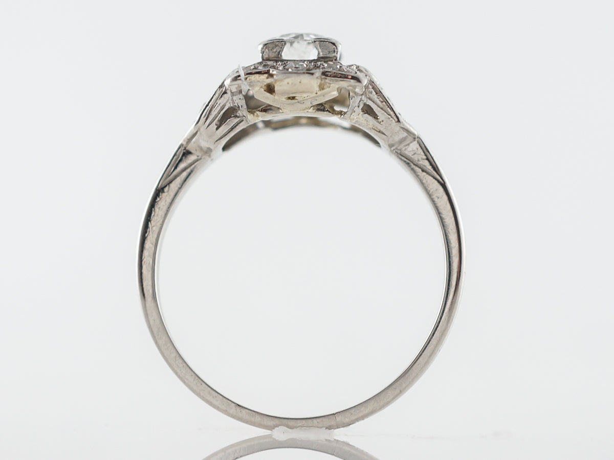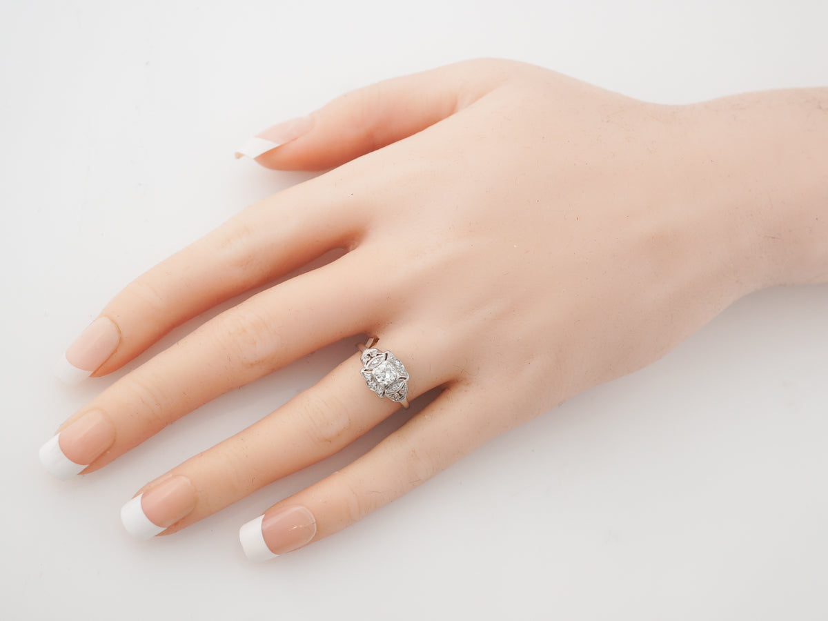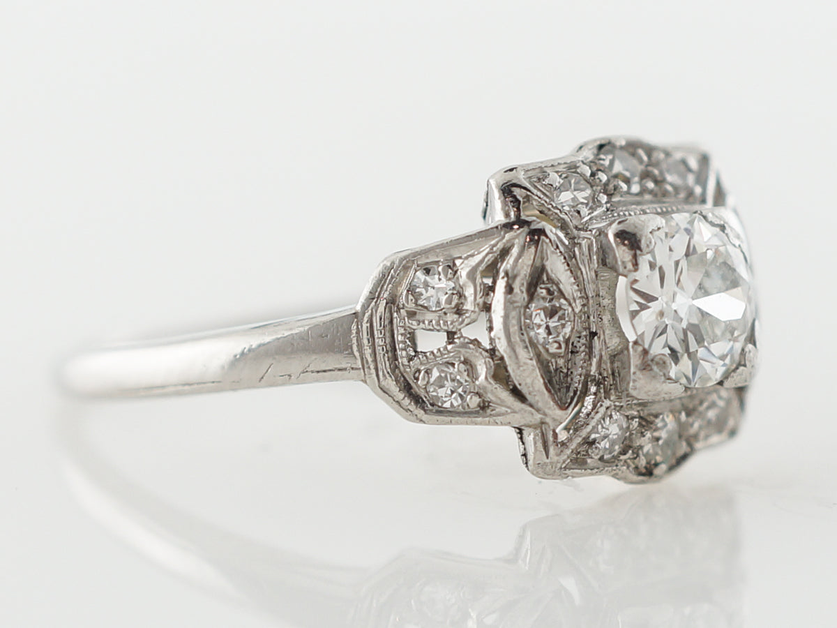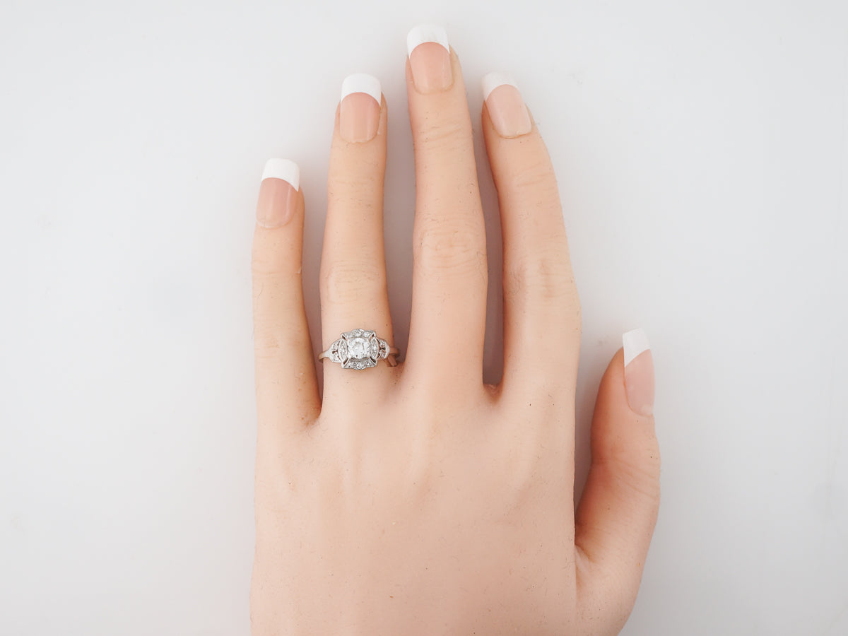 Vintage Deco Diamond Platinum Engagement Ring. This original vintage art deco engagement ring features a .44 carat old European cut diamond. The center diamond is accented by single cut diamonds on every side, providing extra sparkle with every movement. Finished in platinum, this ring sits very low to the finger making it very easy to wear.
