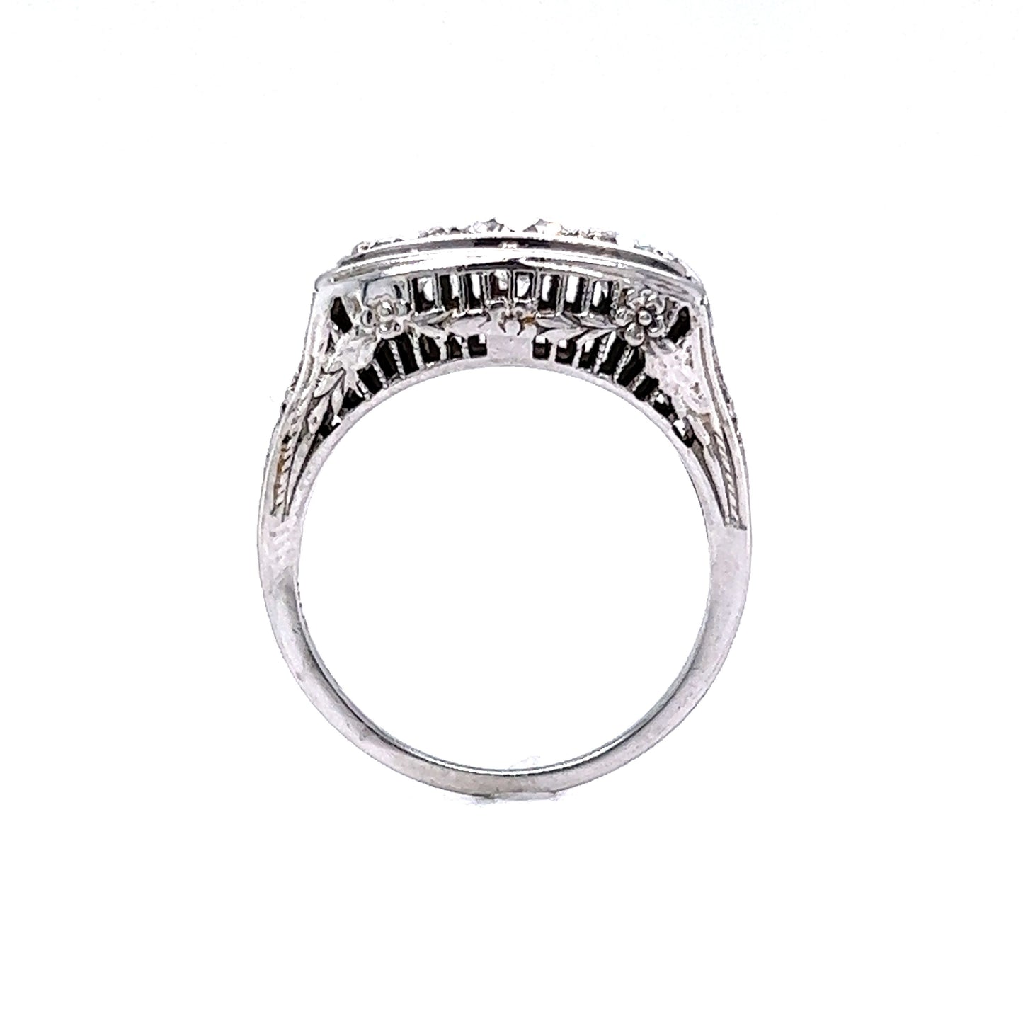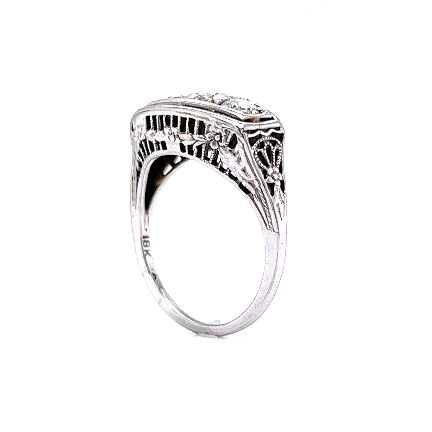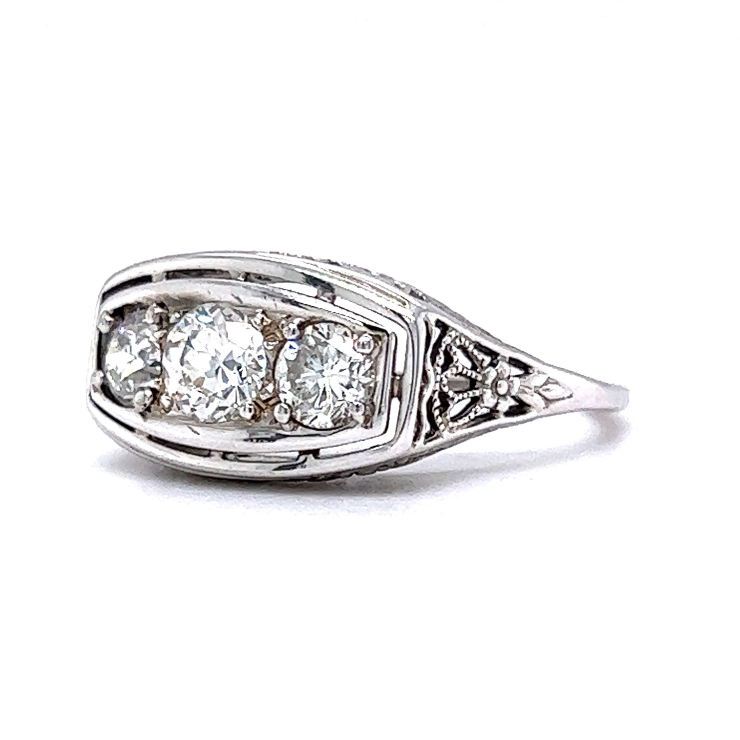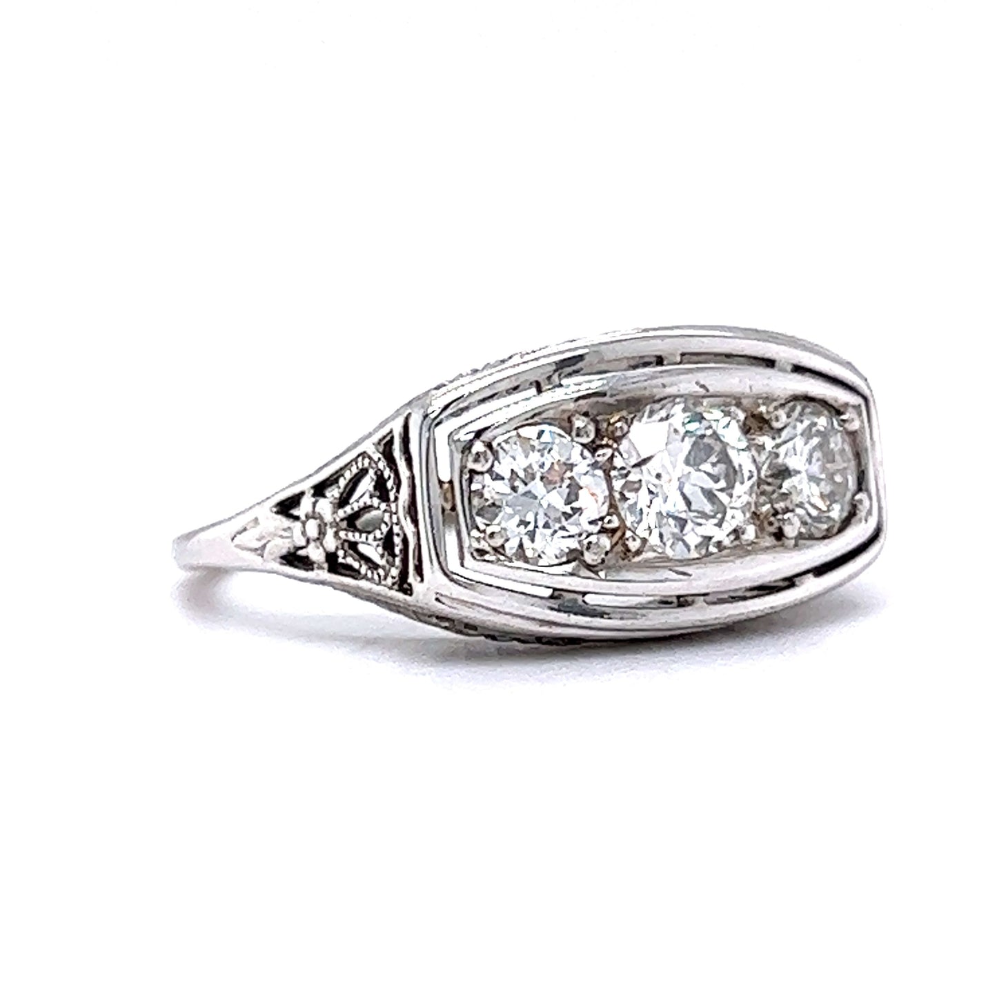 Vintage Deco Three Stone Diamond Ring in 18k White Gold. This vintage Art Deco ring features three (3) diamonds totaling .90 carats and is finished in 18 karat white gold. One of the hallmarks of the Art Deco period was celebrating the beauty of the emerging technologies of the early 20th century and there is no easier place to see it than in a ring like this. The beautiful filigree work on the shoulders and the open lines along the gallery make this a memorable Art Deco piece.