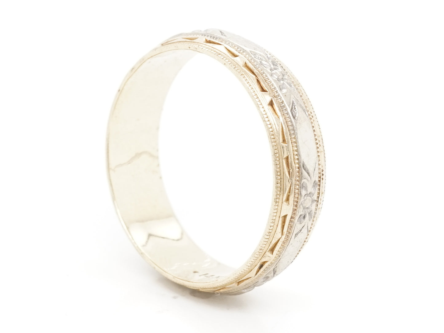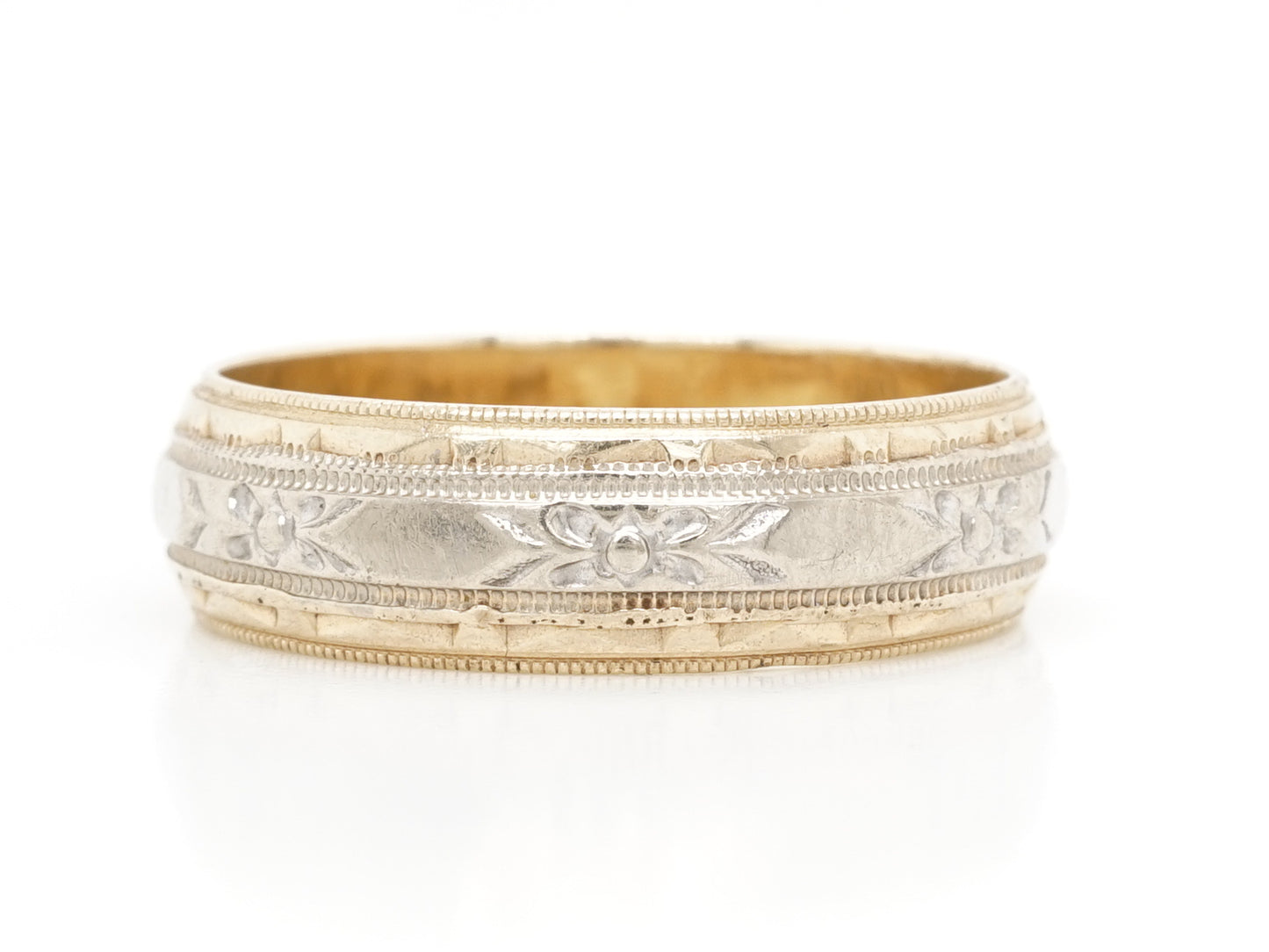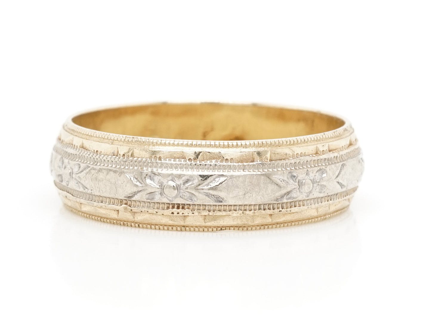 Vintage Deco Two-Tone Engraved Wedding Band in 14K. This elevated, Art Deco wedding band features a two-toned engraved design in 14k yellow and 14k white gold. Graphics of faint flowers and geometric textures decorate the exterior of the band. The center details in 14k white gold add dimension to the thick, 14k yellow gold band. For a sustainable and fashionable wedding band, this vintage ring is the perfect choice!
