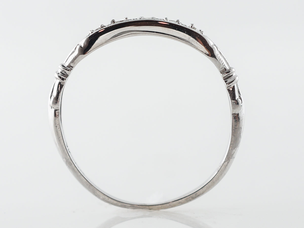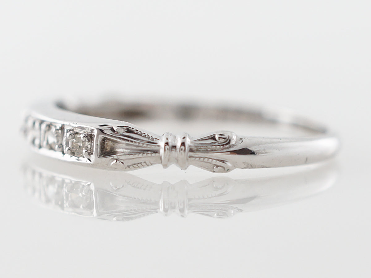 Vintage Diamond Wedding Band in 18k White Gold. This antique Art Deco wedding band showcases the recognizable angles and style of the time period. The band is made of 18k white gold and is set with .08 carats of single cut diamonds. A truly lovely band with just the right amount of antique charm.