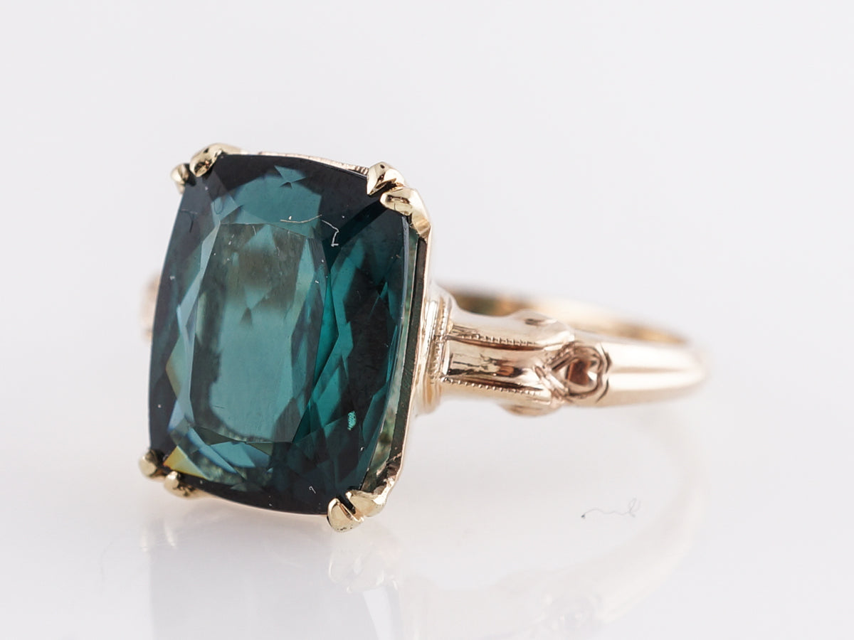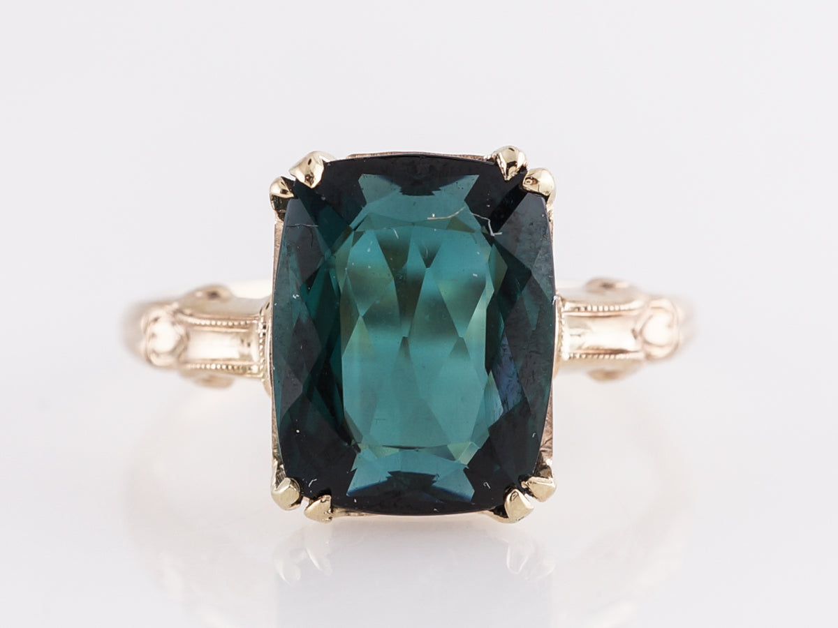 Vintage Emerald Cut Tourmaline Cocktail Ring in 14k. This vintage Victorian engagement ring features a beautiful 2.96 carat blue/green tourmaline. The color of the gemstone has wonderful tone and saturation. The stone is set with double prongs and sits above shoulders with lovely engravings and milgrain details.