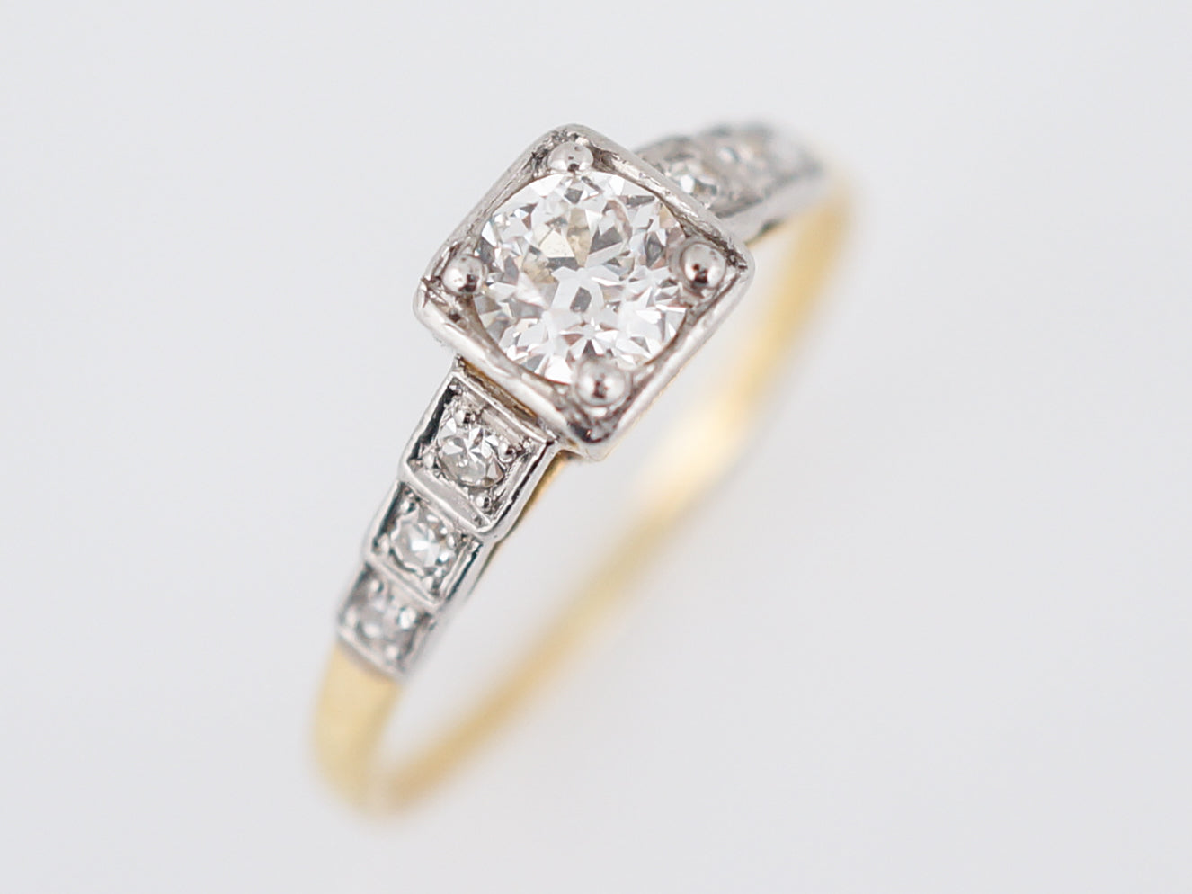 This lovely antique Art Deco solitaire engagement ring setting focuses around a .38 carat old European cut diamond. To either side of the stone youll find three (3) single cut diamonds in a graduated step design. The ring features both 14 karat yellow white gold creating a gorgeous contrast.