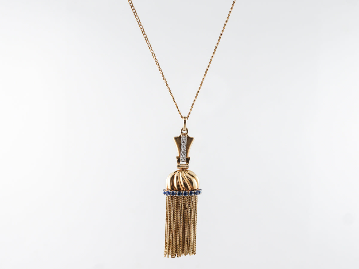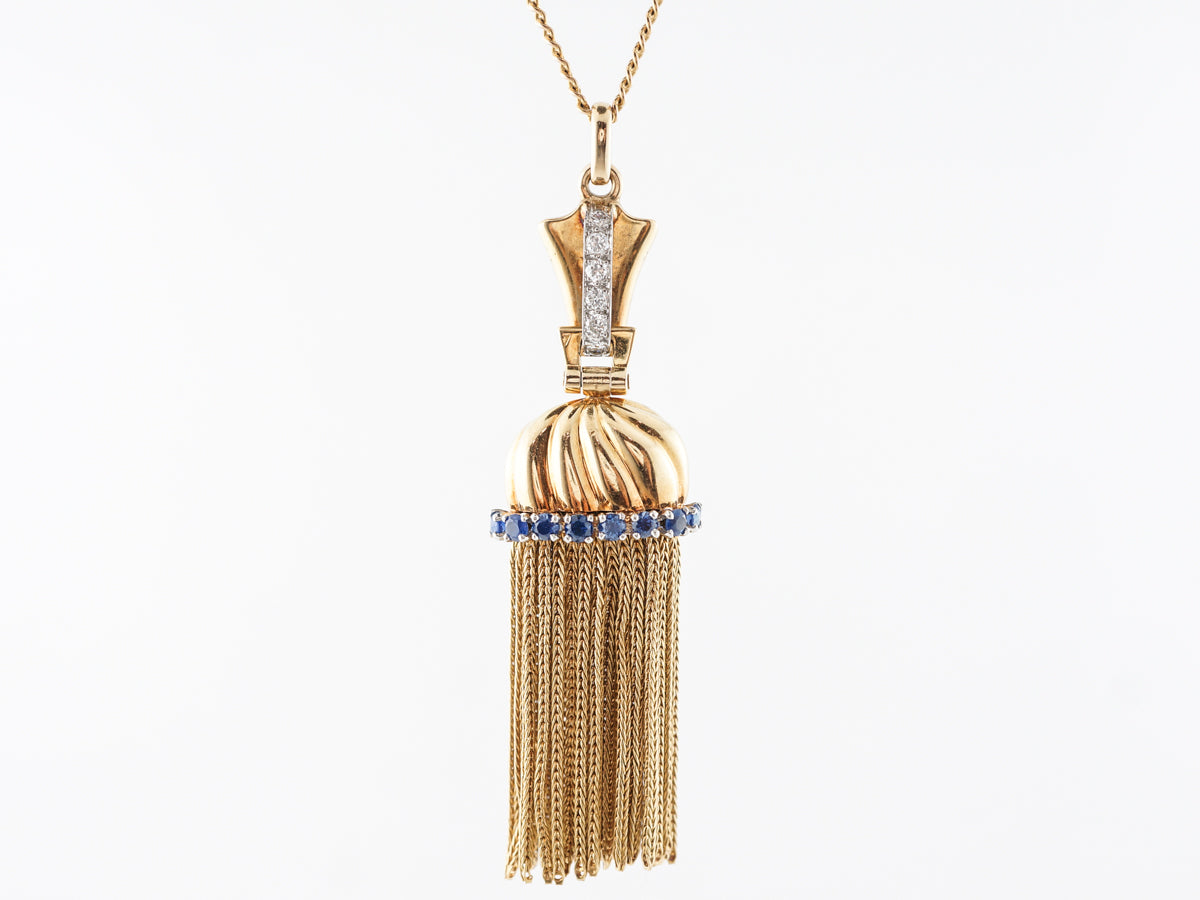 Vintage French Retro Diamond Sapphire Tassel Pendant in Yellow Gold. This retro tassel pendant finished in 18 karat and 14 karat yellow gold features .24 carats of diamonds and .10 carats of sapphires. The tassels hang below a border of beautiful sapphires that separates them from a polished dome of yellow gold and a line of accent diamonds that connects to a chain. This would fit very well with a number of our vintage yellow gold chains.