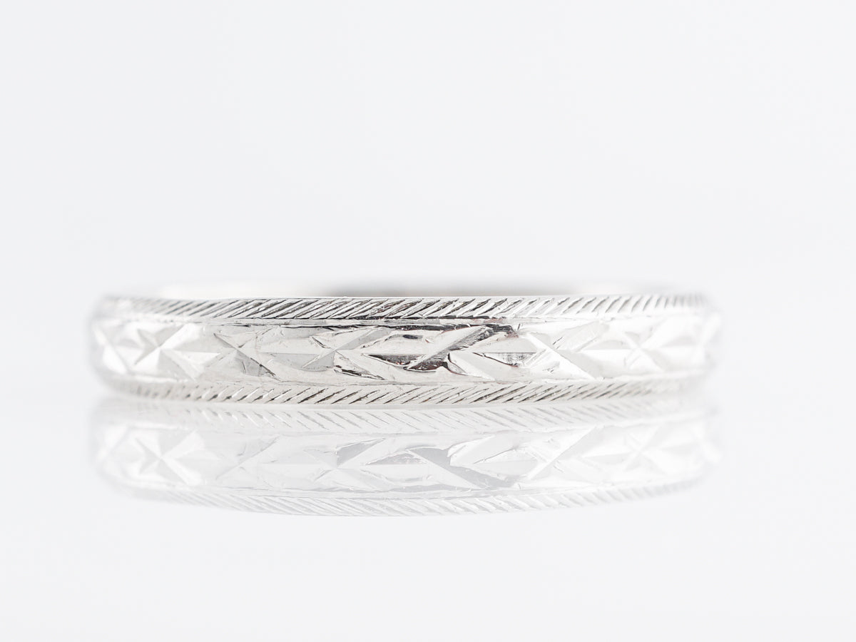 Vintage Geometric Engraved Wedding Band in Platinum. This vintage wedding band is a sound choice for your special day. This Art Deco ring has an engraved, geometric pattern that is outspoken and architectural. A quintessential wedding band that is a balance of style and practicality. This ring is perfect for anyone who wants a band they can trust to last.