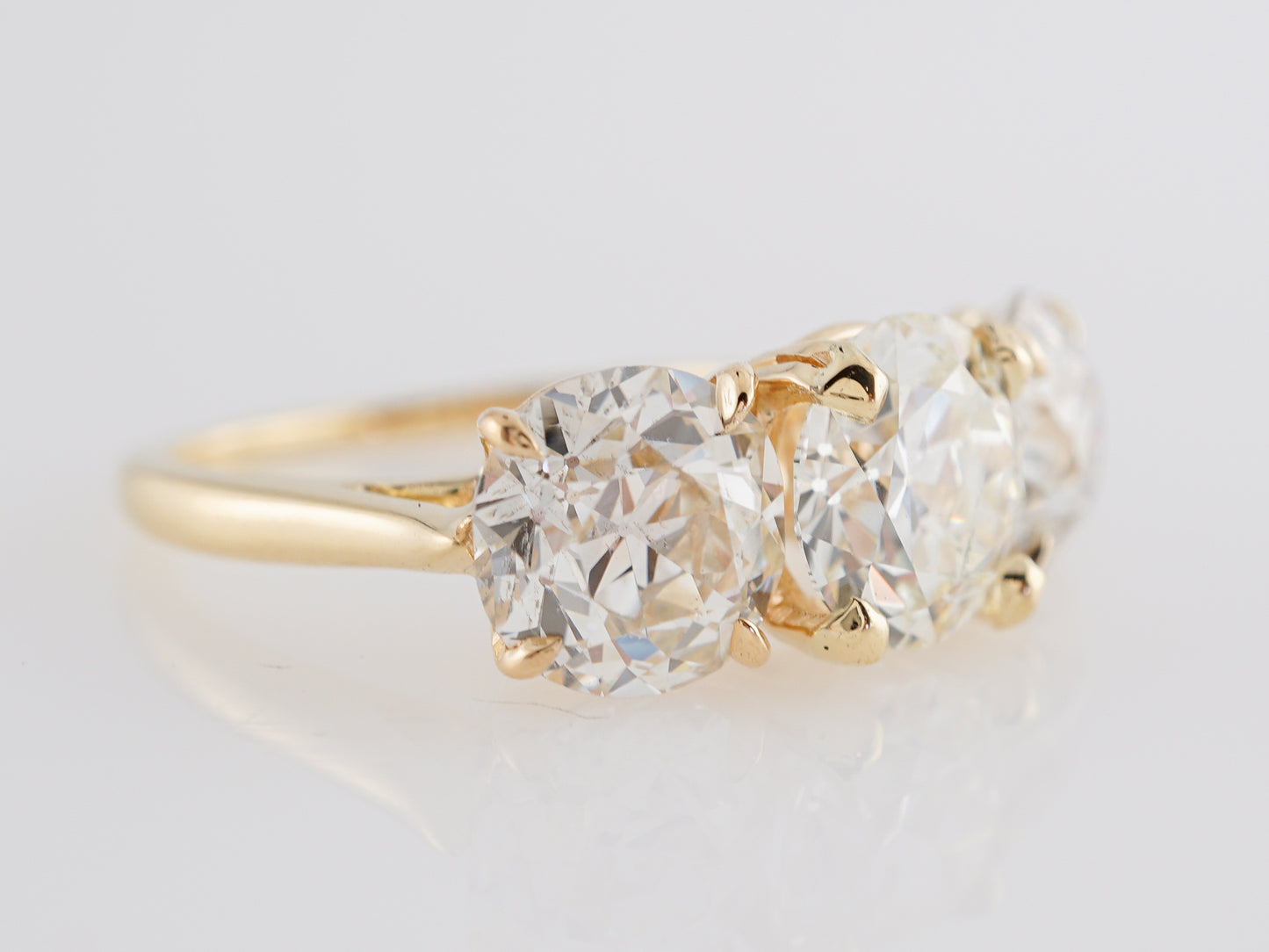 Vintage Harry Winston Three Stone Diamond Engagement Ring 14k. This GIA-certified, three stone engagement ring was made by world renown jeweler, Harry Winston. Featuring a glittering, 1.32 carat Old European cut center diamond in 14k yellow gold and accented by two additional Old European cut gems on both sides, this ring is fit for a queen! Each genuine natural diamond is prong set in a luxurious basket mounting of 14k yellow gold. The total diamond weight of the three stone ring is 3.75 carats and reaches 6.44 mm above the finger. This special engagement ring showcases quality, clarity, and an appealing sparkle that is sure to mesmerize.