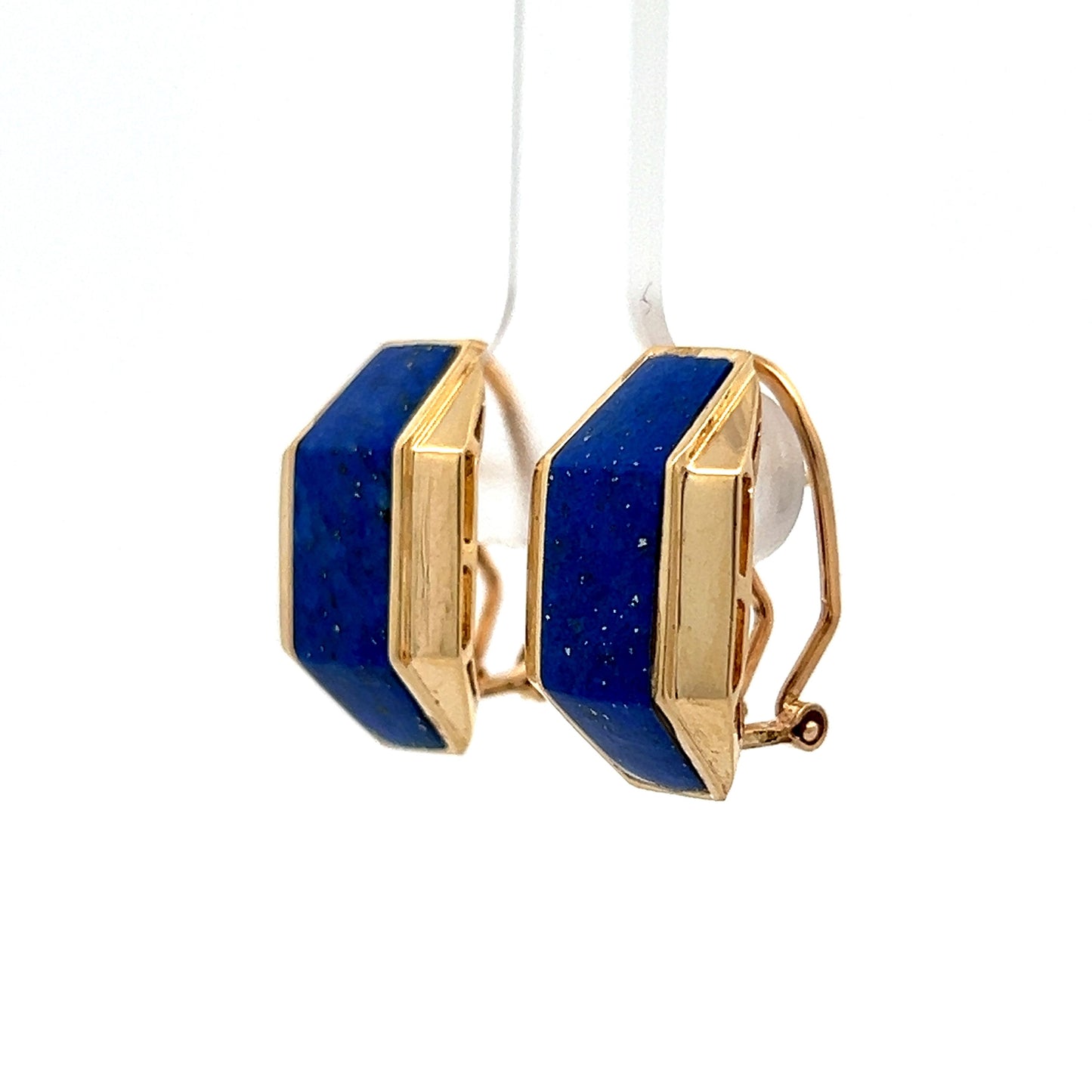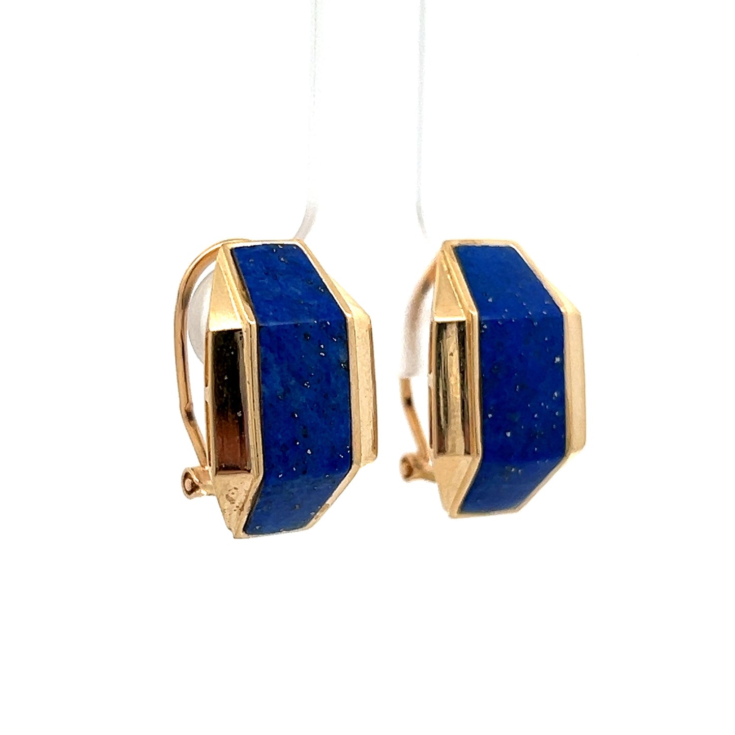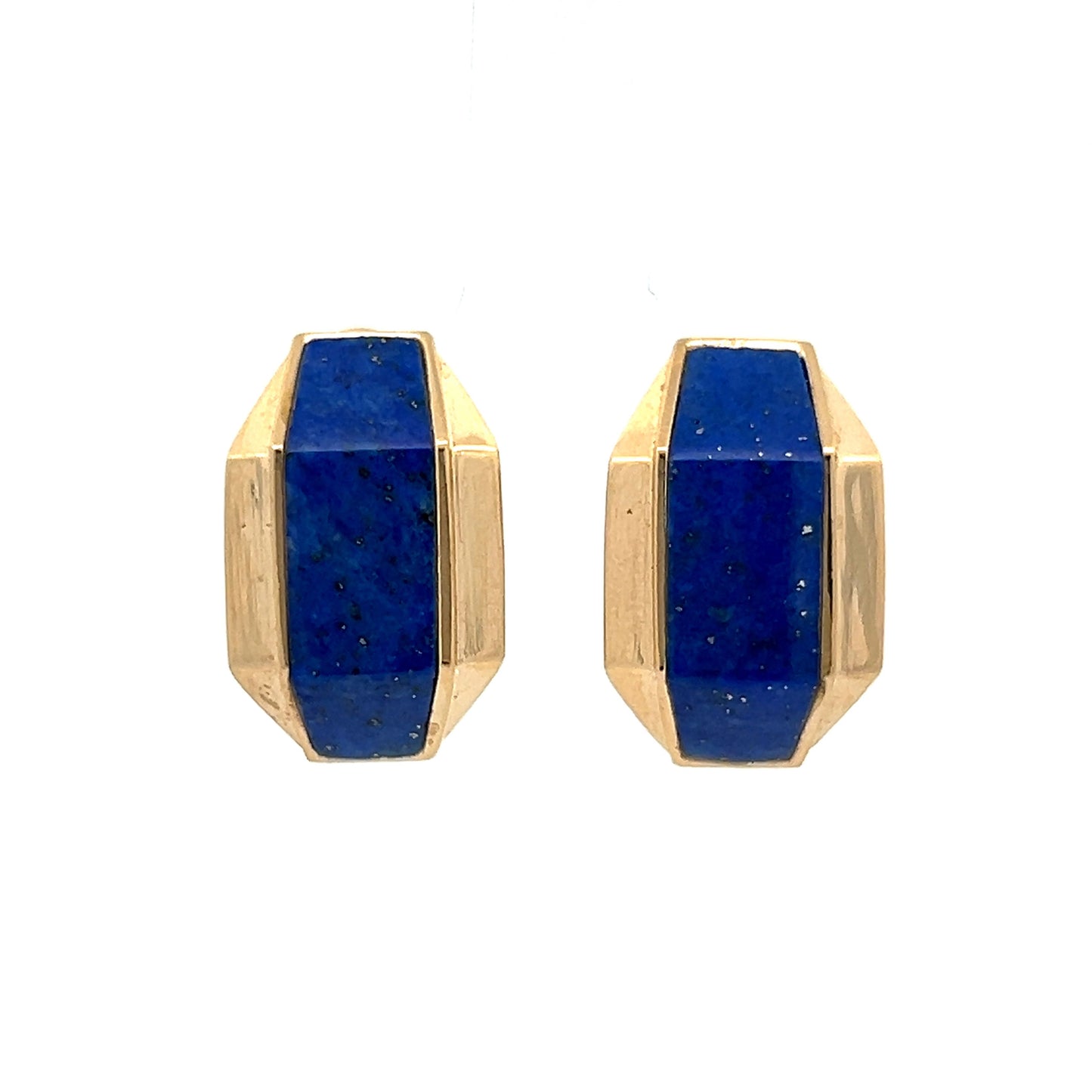 Experience vintage style with these stunning geometric stud earrings from the mid-century era. Crafted in 14 karat yellow gold, these earrings features beautiful cabochon cut lapis lazuli as the centerpiece. The polished yellow gold setting perfectly complements the deep blue hue of the lapis, creating a striking contrast.