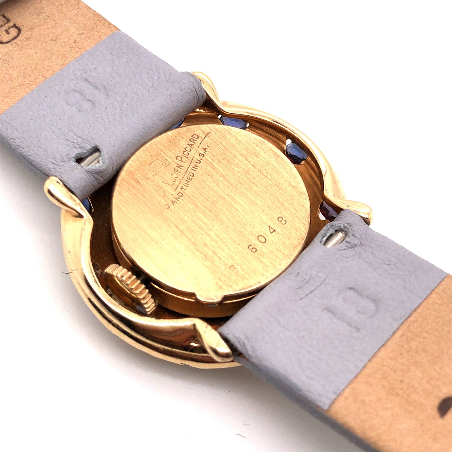 Vintage Lucien Piccard Sapphire Pearl Watch in 14k Yellow Gold. This custom Mid-Century Lucien Piccard watch features .99 carats of blue sapphires and seed pearls finished in 14 karat yellow gold. Eleven (11) .09 carat blue sapphires and eleven (11) pearls surround the face of the watch. The sapphires have a medium-dark blue hue and are finished in 14 karat yellow gold. Set on a new lavender strap, this watch is a collector’s item that will make for a lovely anniversary gift!
