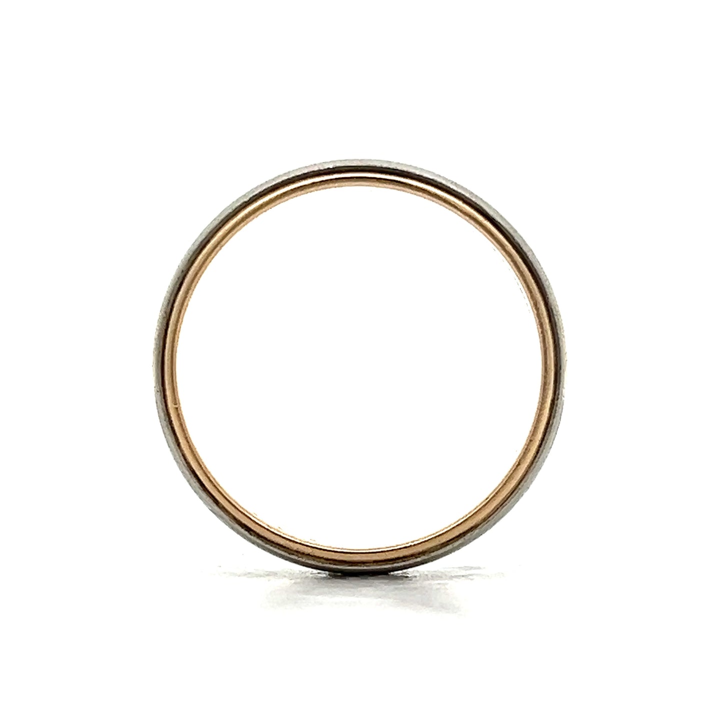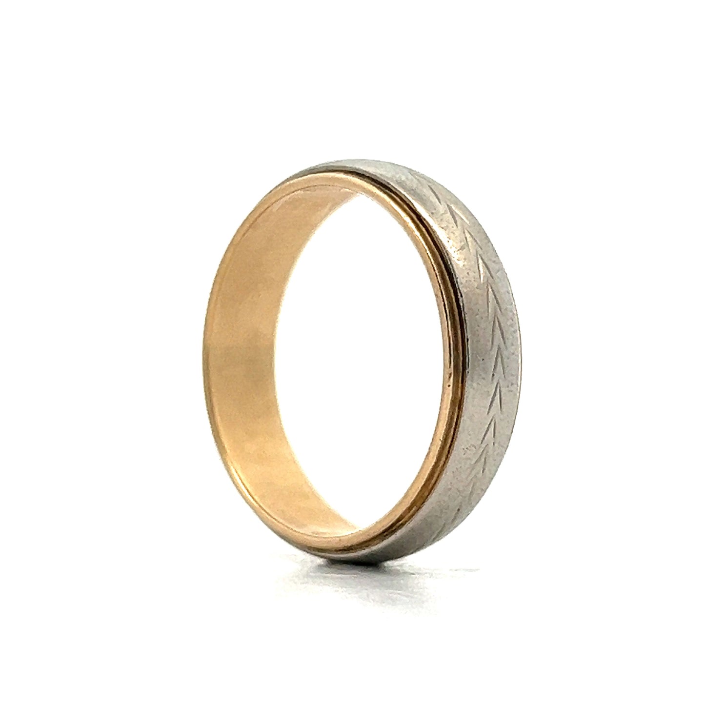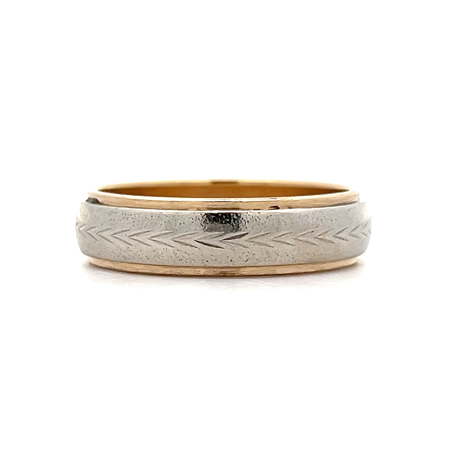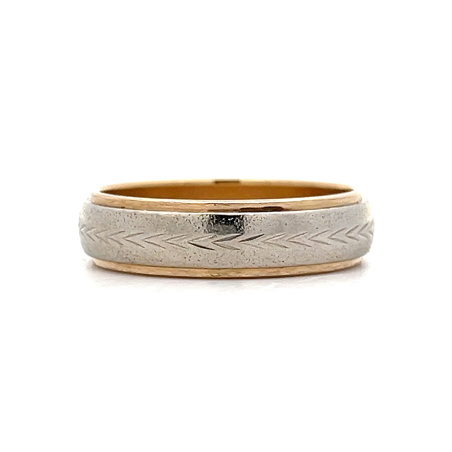 This vintage Mid-Century wedding band features a gorgeous two-tone design. The interior of the ring is finished in 14k white gold and has a thin chevron engraved pattern running down the center. The outer edges of the band are finished in 14k yellow gold and combine with the white gold for a unique and eye catching look. The band measures 4.65 mm wide and is perfect for somebody looking for a little bit more than a plain wedding band.