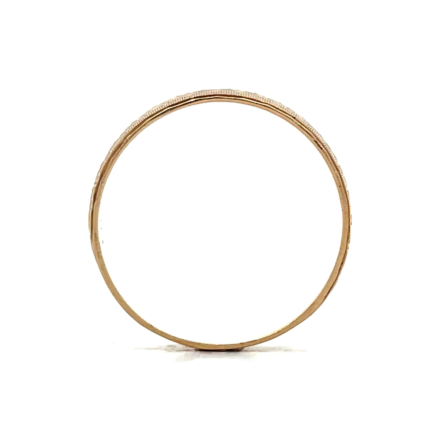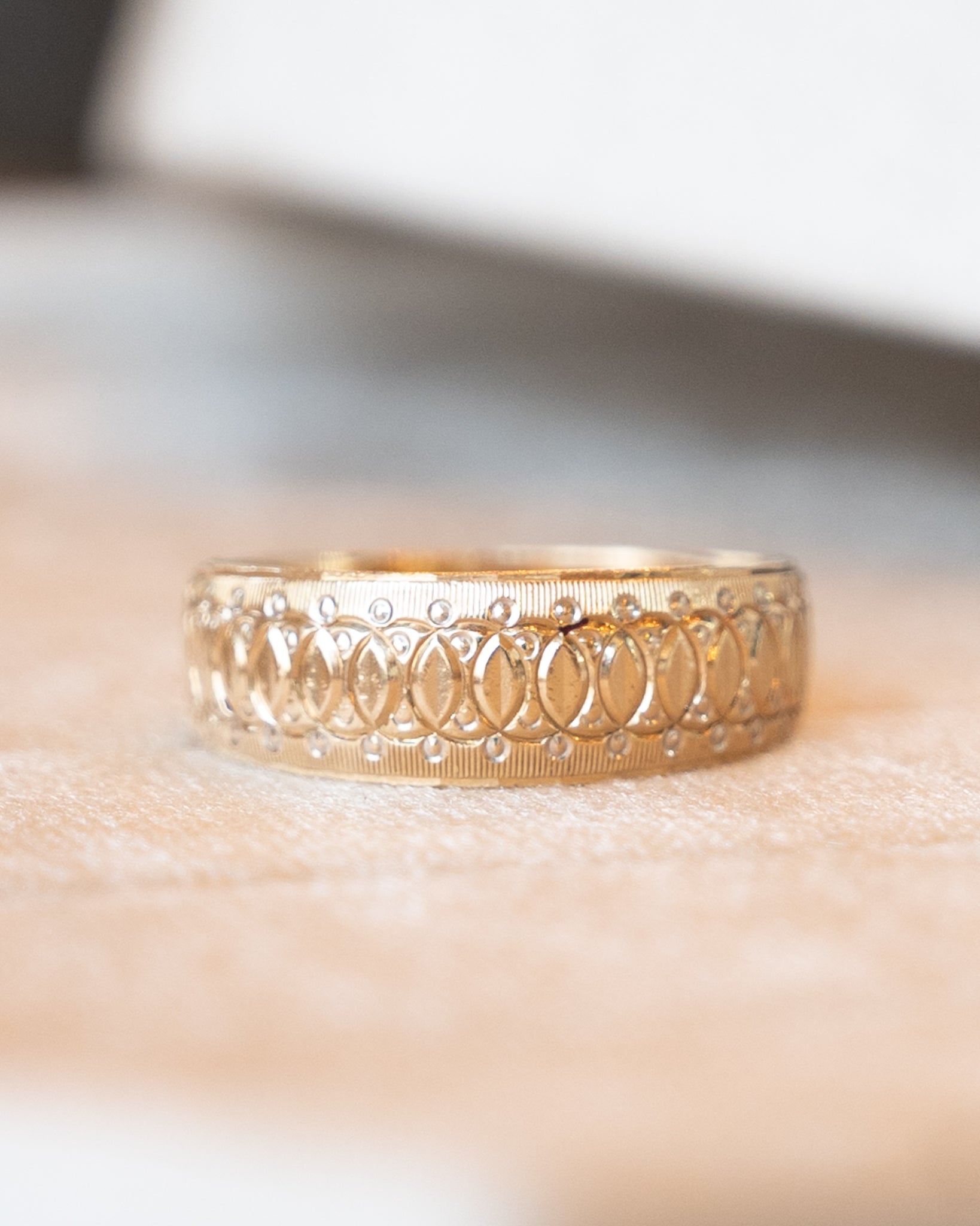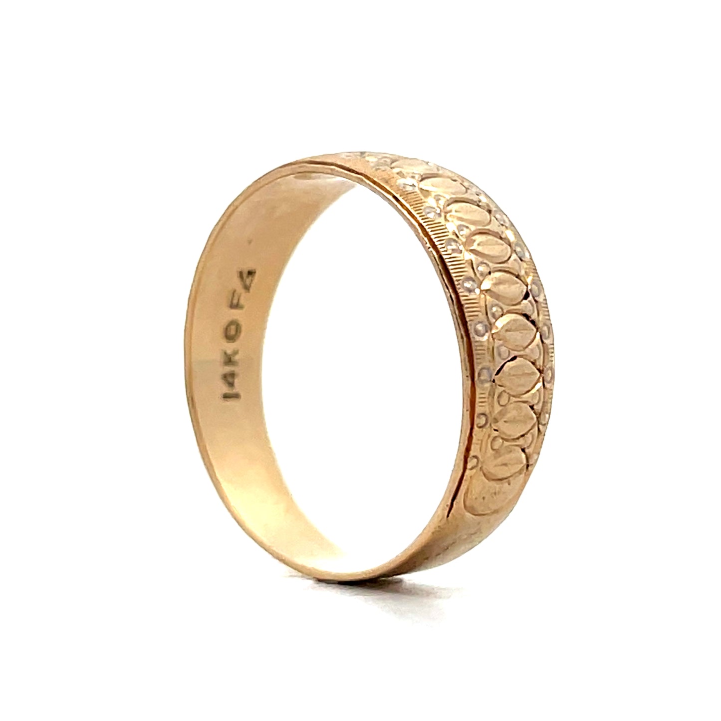 This Mid-Century men's wedding band is made from 14 karat yellow gold with overlapping circular pattern engravings and ridge-textured details. The band features a tapered design that measures 7.8mm at its widest point and narrows to 4.8mm. The engraved patterns and textured gold create depth and visual interest that reflects the distinctive Mid-Century aesthetic.