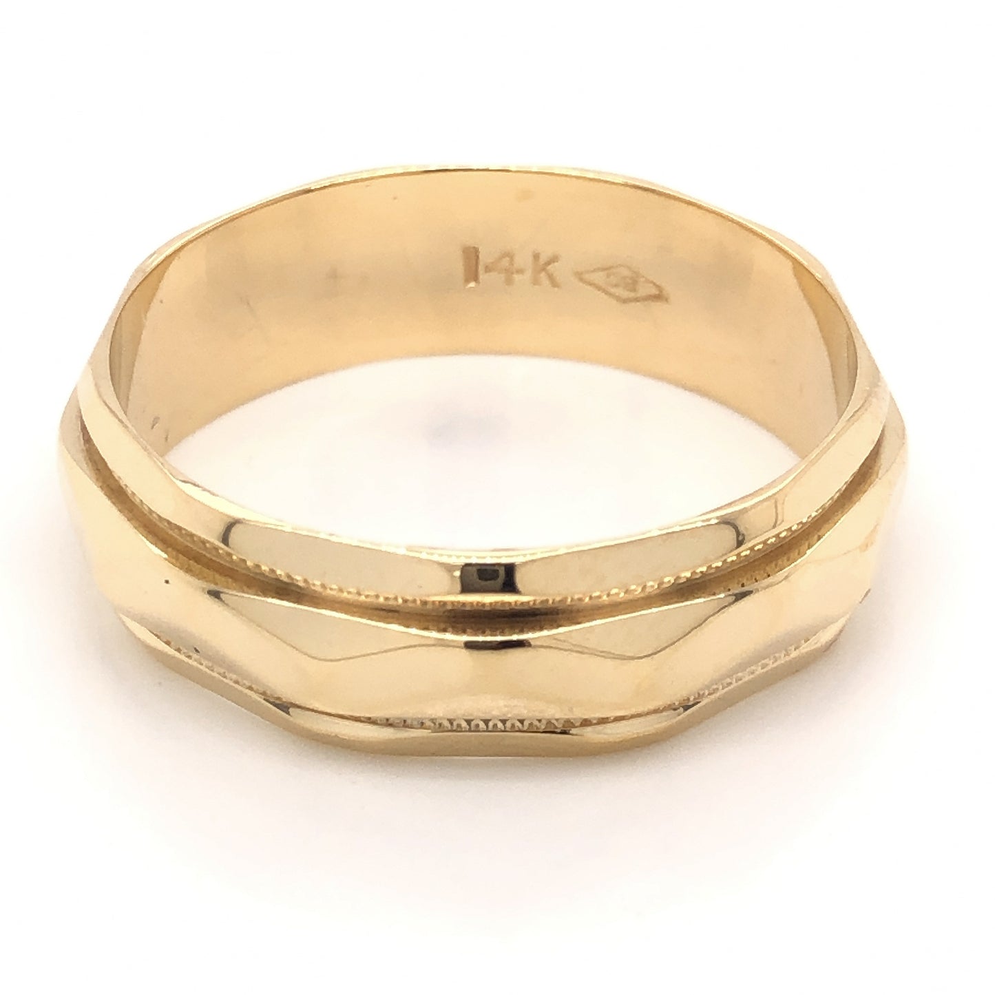 Vintage Mens Geometric Wedding Band in 14k Yellow Gold. This Mid-Century men’s wedding band measures 6.56mm wide and is finished in polished 14 karat yellow gold. A soft, geometric design and milgrain trim decorate the front of the ring. This ring is a perfect men’s wedding band with a classic style and a touch of tasteful texture!