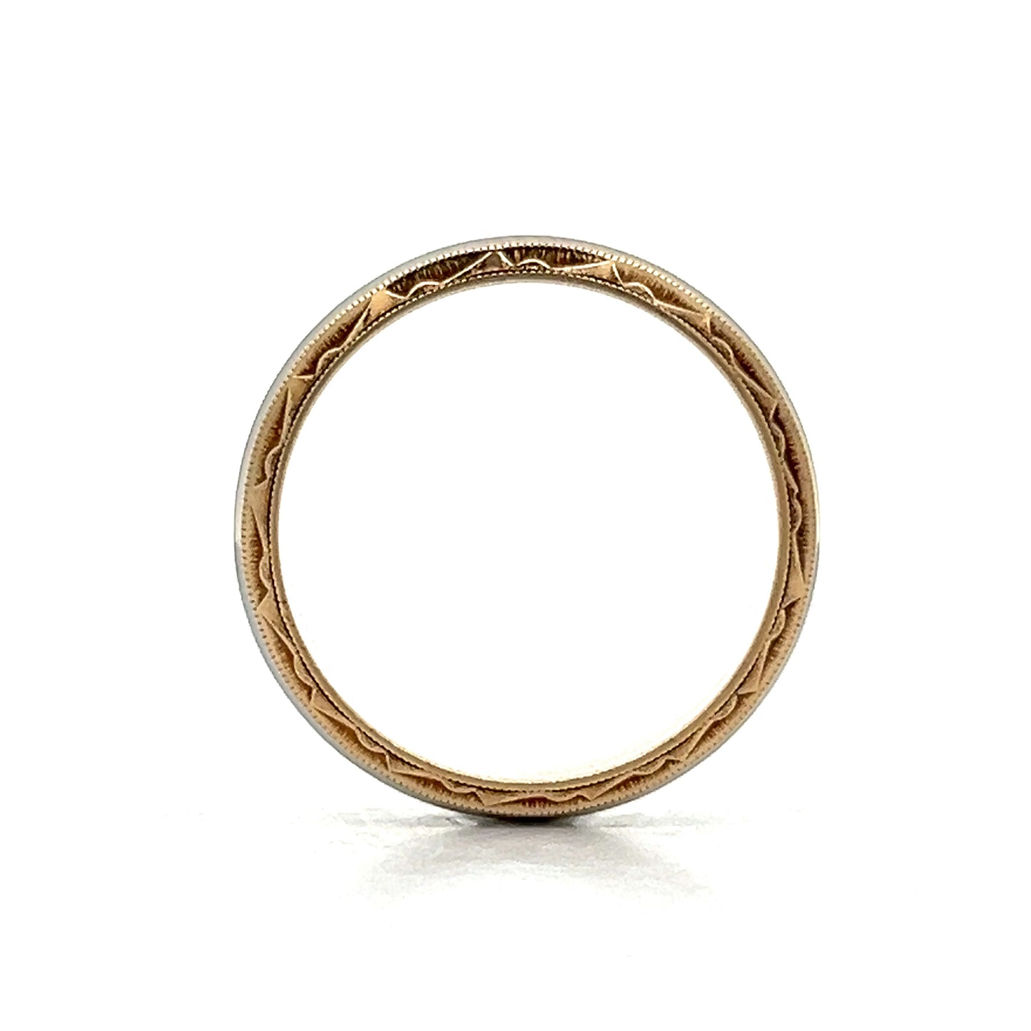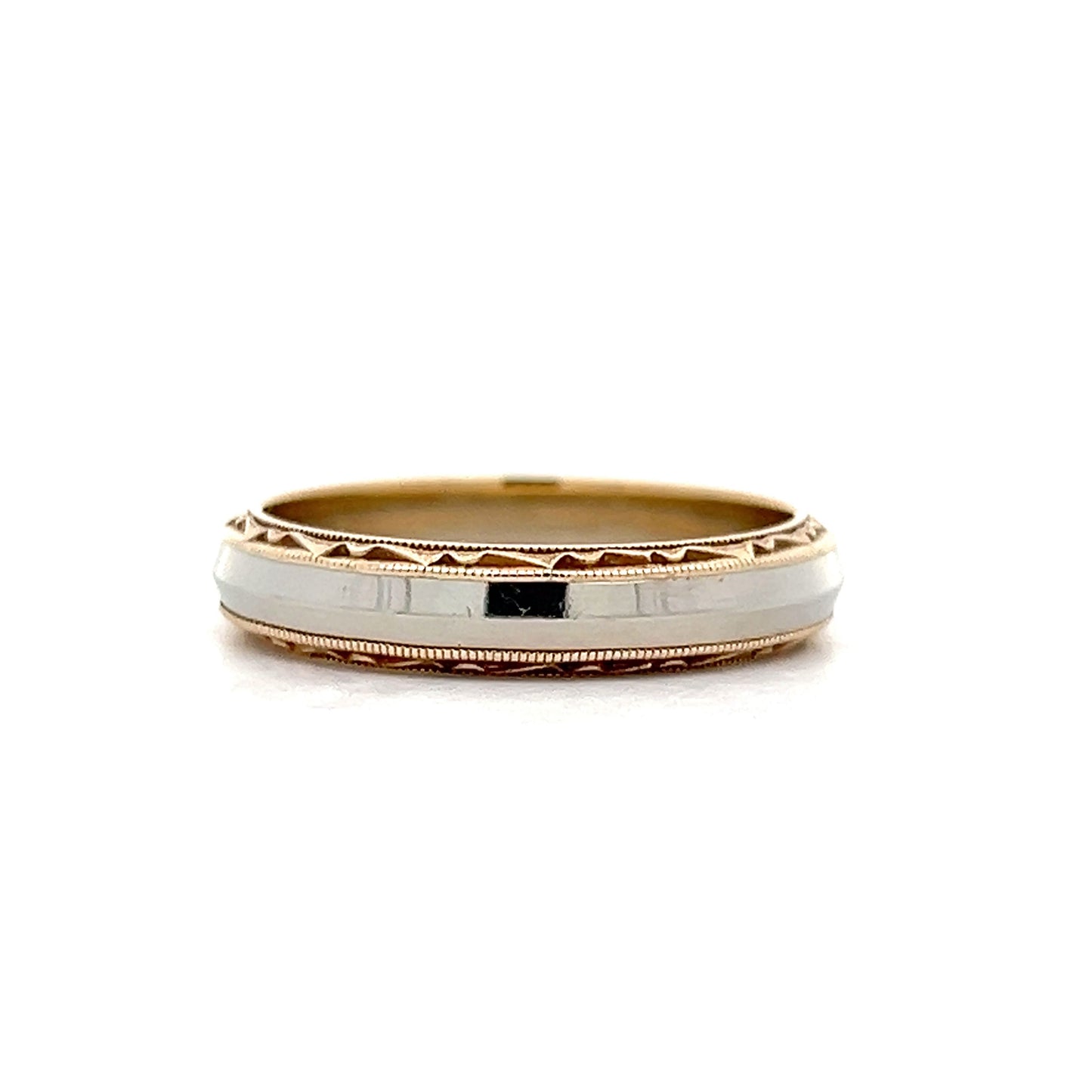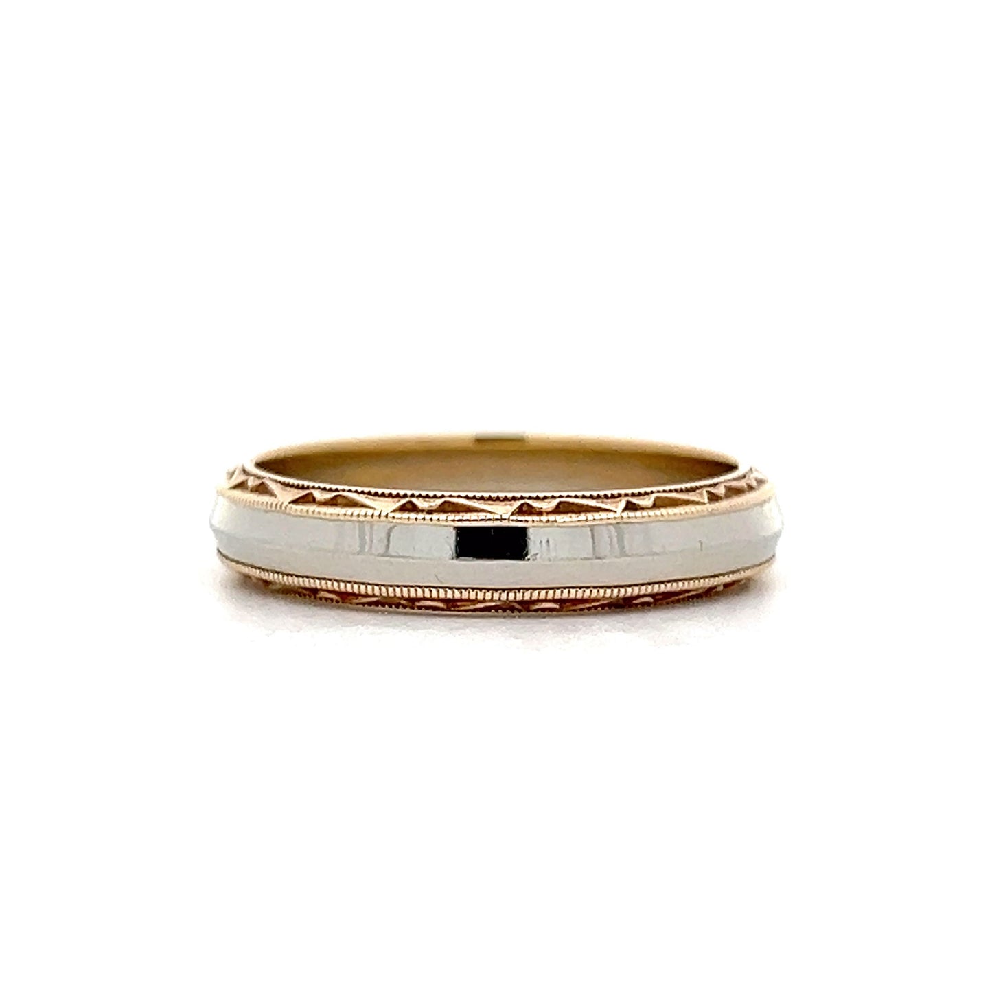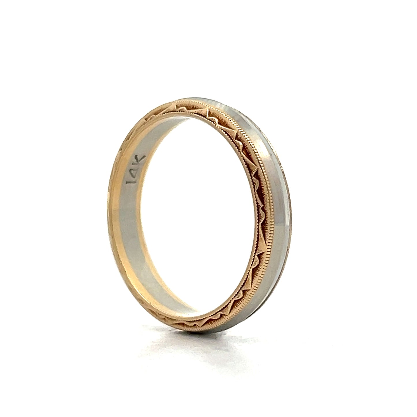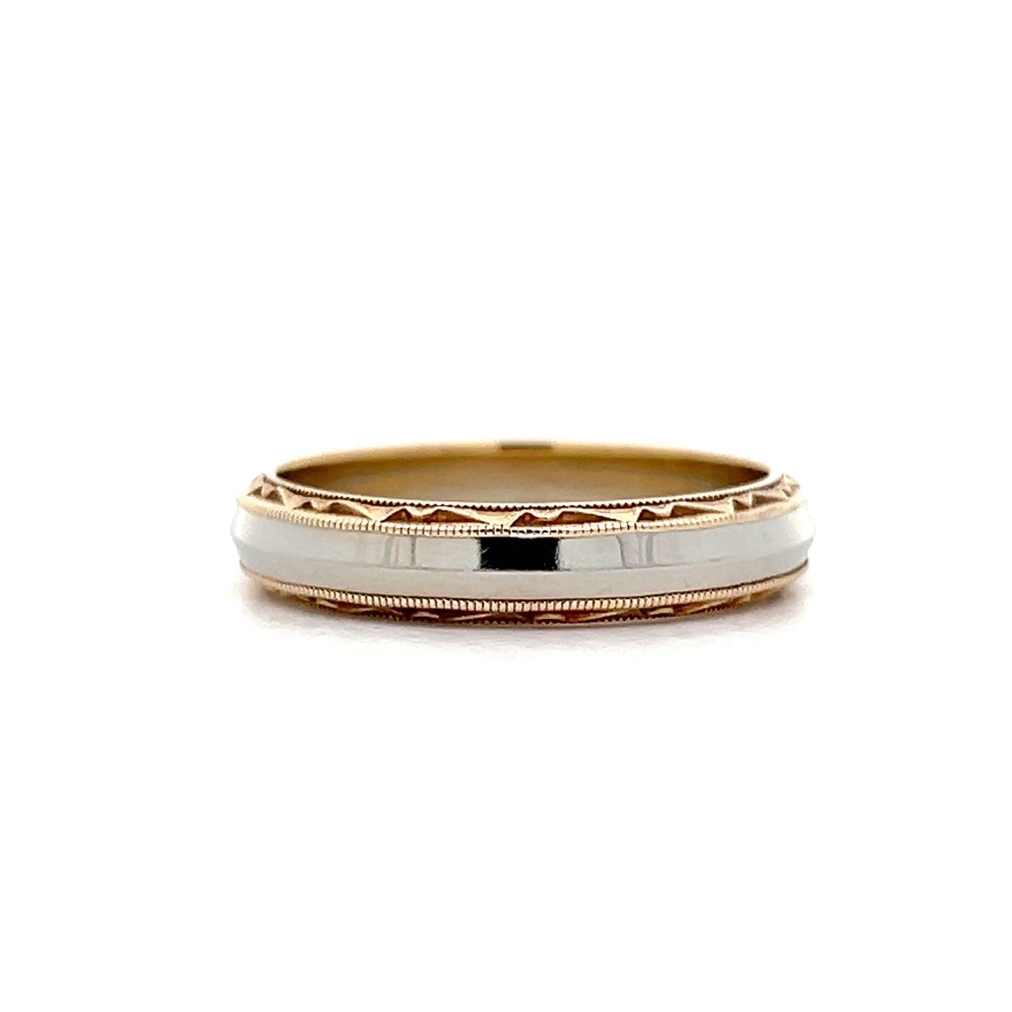 This men's wedding band combines retro and antique aesthetics with a two-tone design of 14 karat white gold in the center and 14 karat yellow gold along the edges. The knife edge design adds a bit of texture, while the engraved sides and milgrain edge detail enhance its artistry. This wedding band blends classic elements with refined details, making it a unique compared to modern rings.