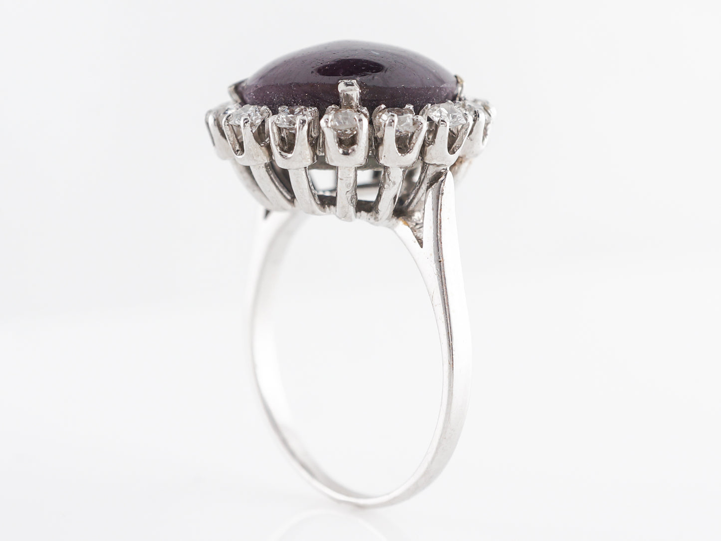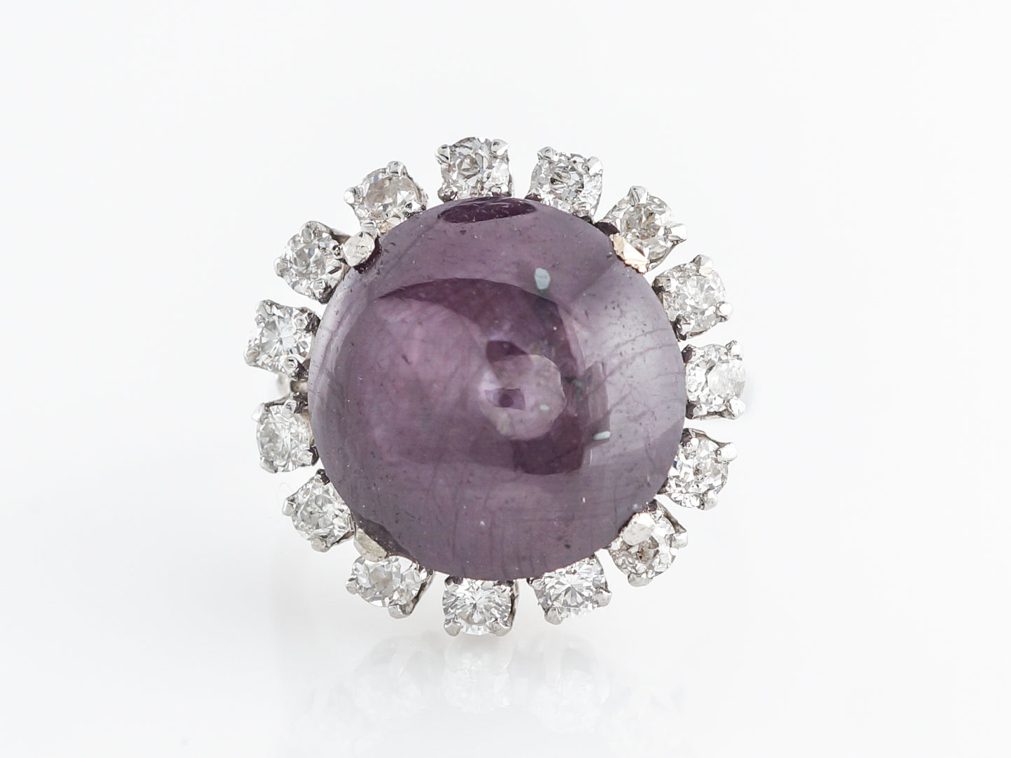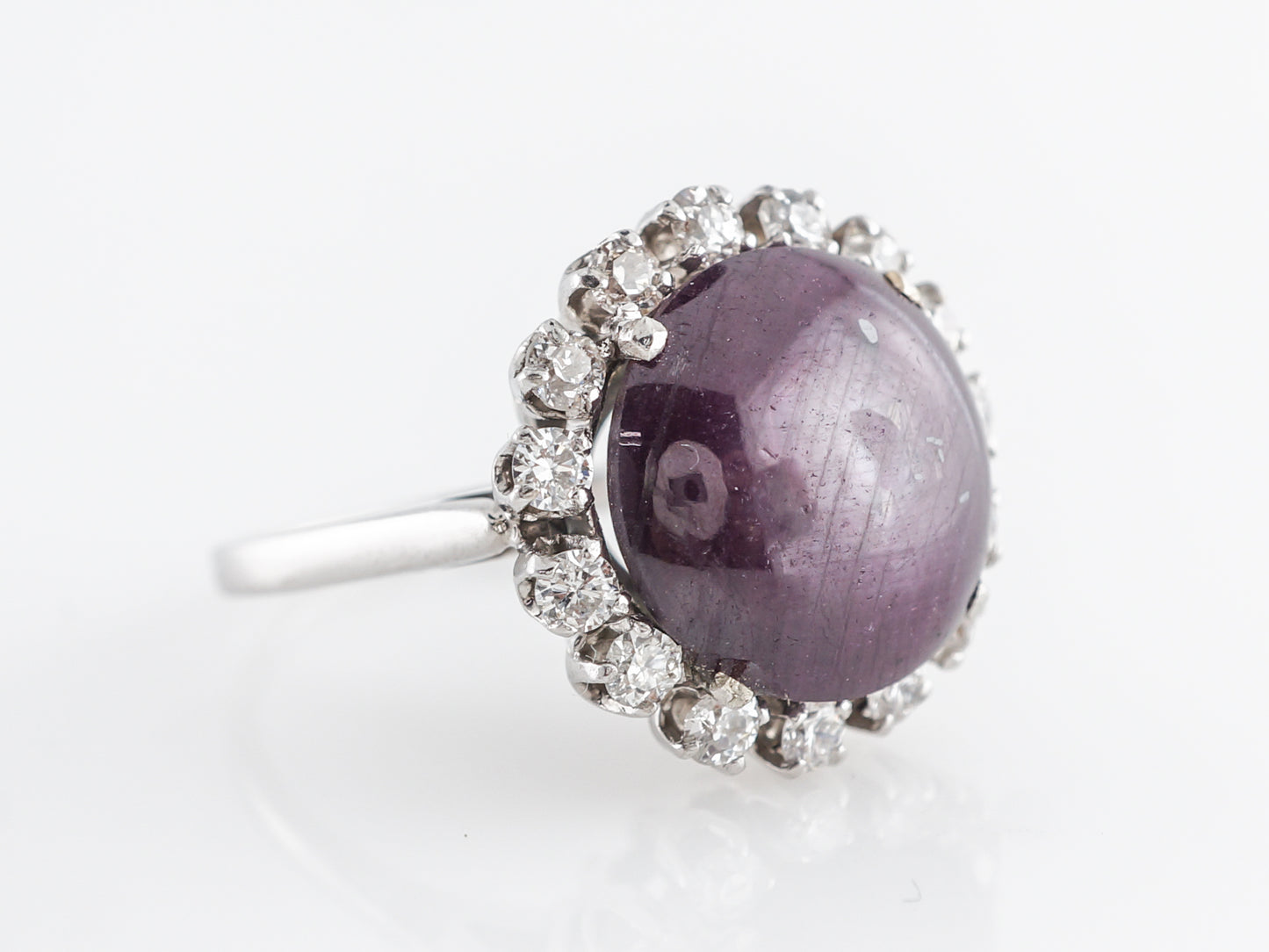 Vintage Mid-Century Star Ruby Cocktail Ring in 14k. This amazing Mid-Century ruby cocktail ring is set in 14 karat white gold with .60 carats in a diamond halo. The enchanting 12 carat cabochon cut ruby has the most amazing reddish-purple color that contrasts well with the white gold and diamonds. For a show-stopping vintage cocktail ring you cant go wrong with this!