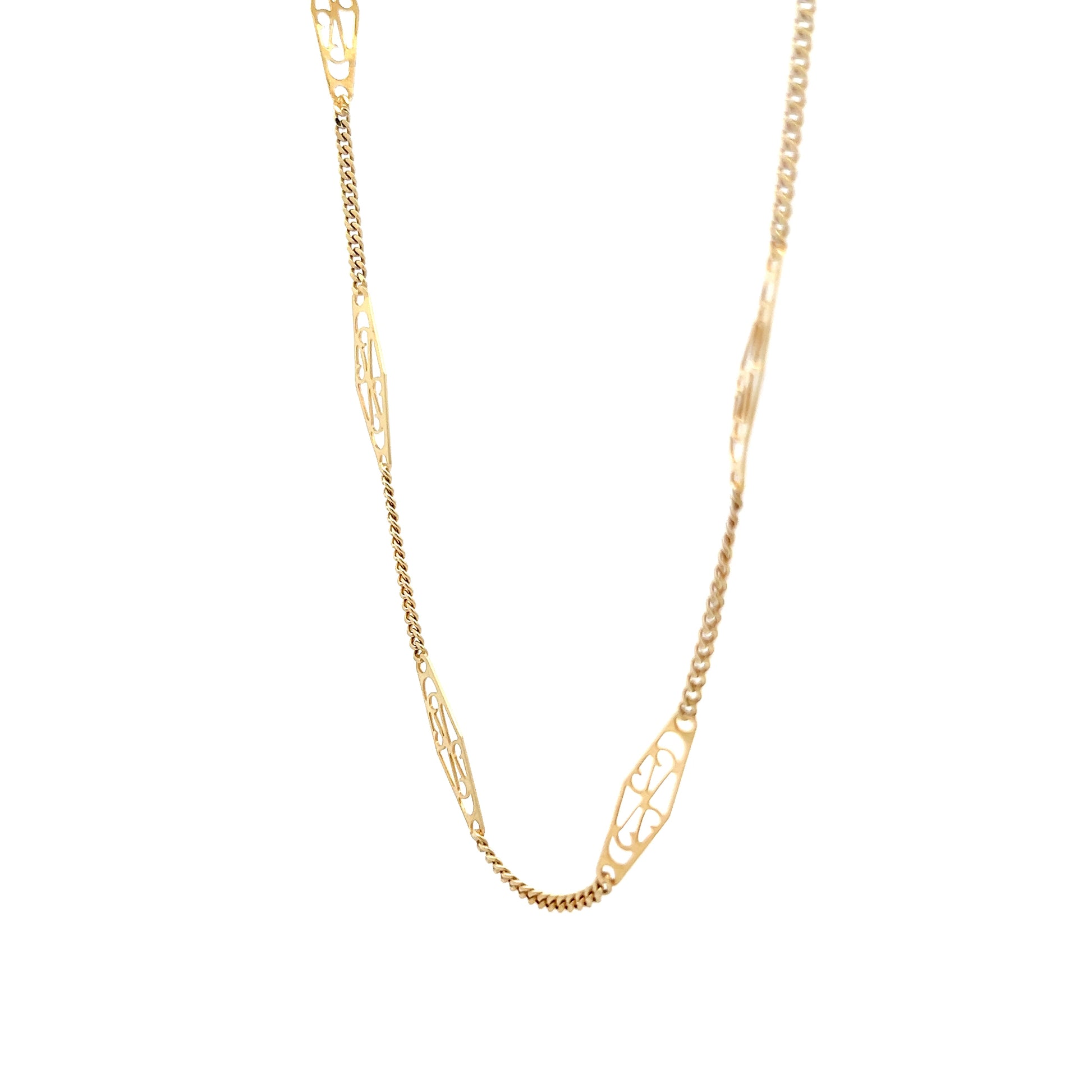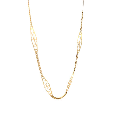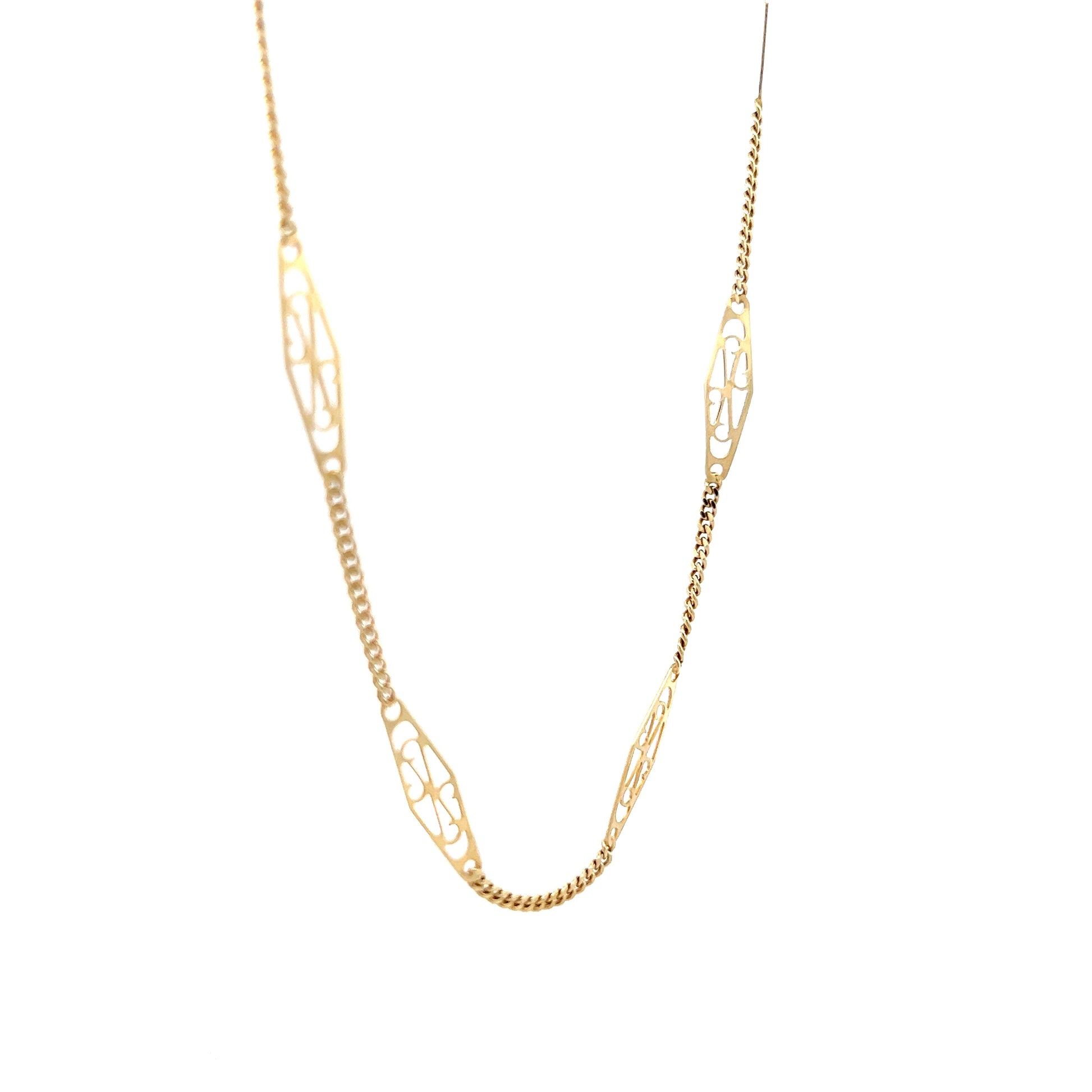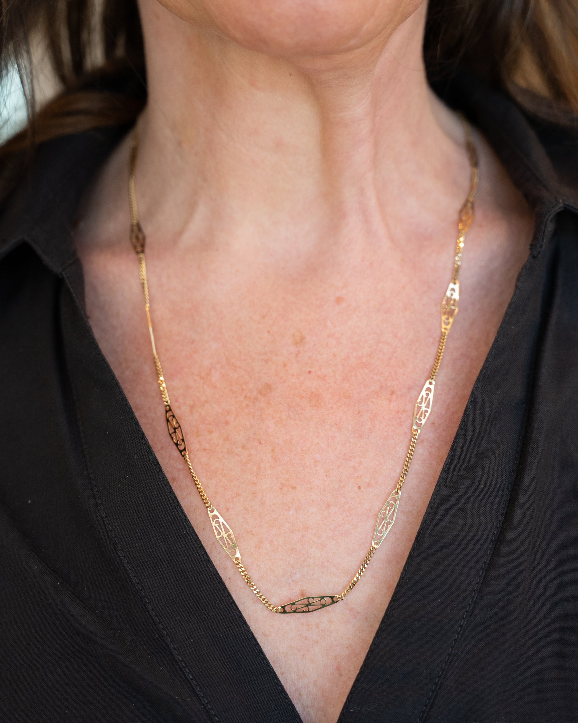 The Mid-Century Chain Necklace features ornate triangular links made from 14 Karat Yellow Gold with a warm golden color. This piece measures 24 inches in length, which allows for different styling options. The gold links create an interesting pattern that gives the necklace its visual interest. This necklace can be worn alone or combined with other pieces for different looks.