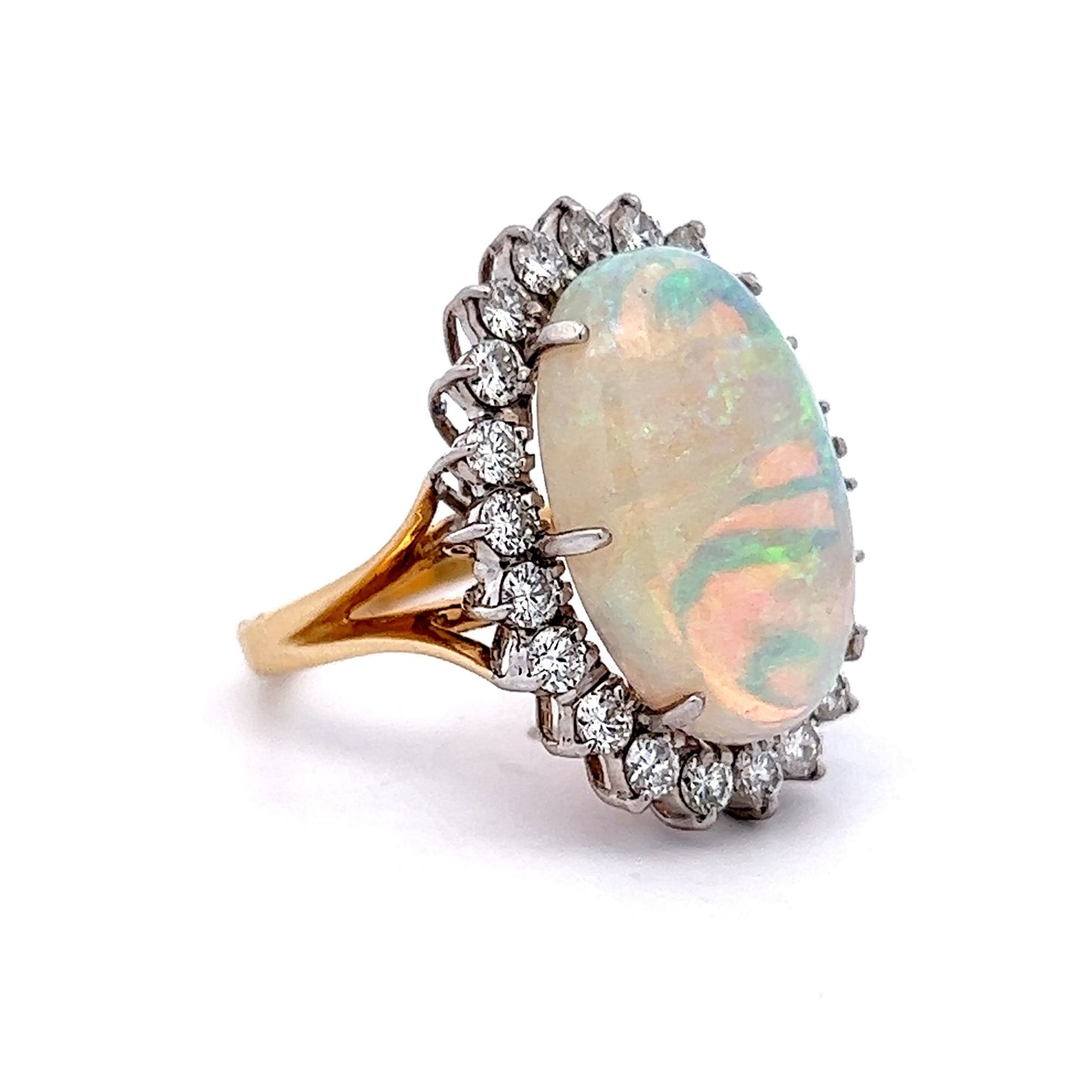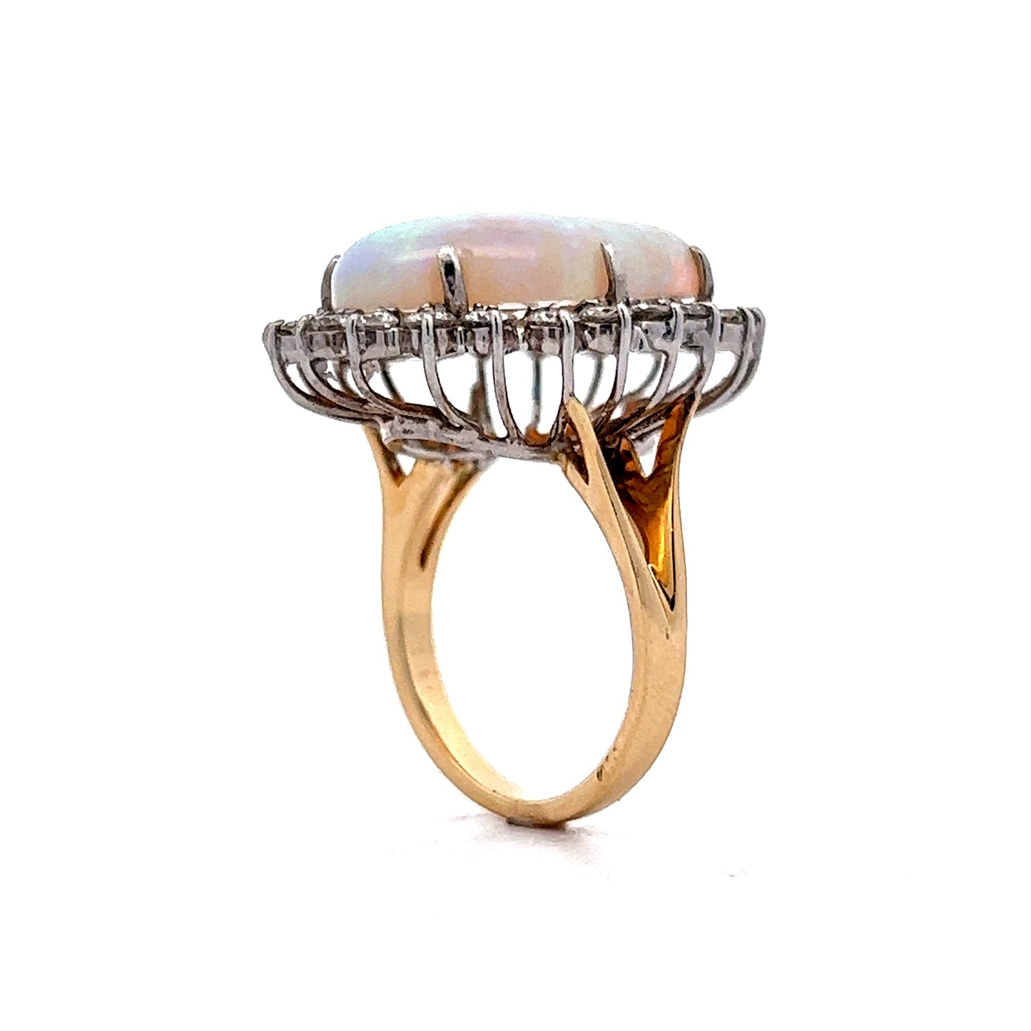 This Vintage Opal Diamond Cocktail Ring features a 10.86 carat cabochon cut opal in 14 karat yellow gold. A Mid-Century masterpiece. The opal showcases a fiery, iridescent display of colors.  The opal is accented by a halo of twenty-two (22) near colorless diamonds. The diamonds are set in 14 karat white gold prongs. Finished on a radiant 14k yellow gold band, this Mid-Century right hand ring checks all the right boxes and would make a fabulous addition to any jewelry collection!