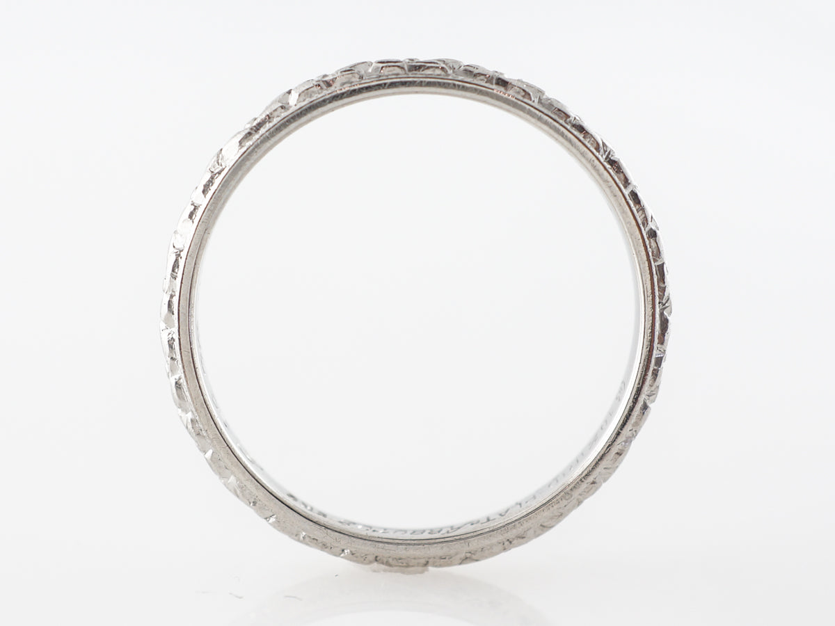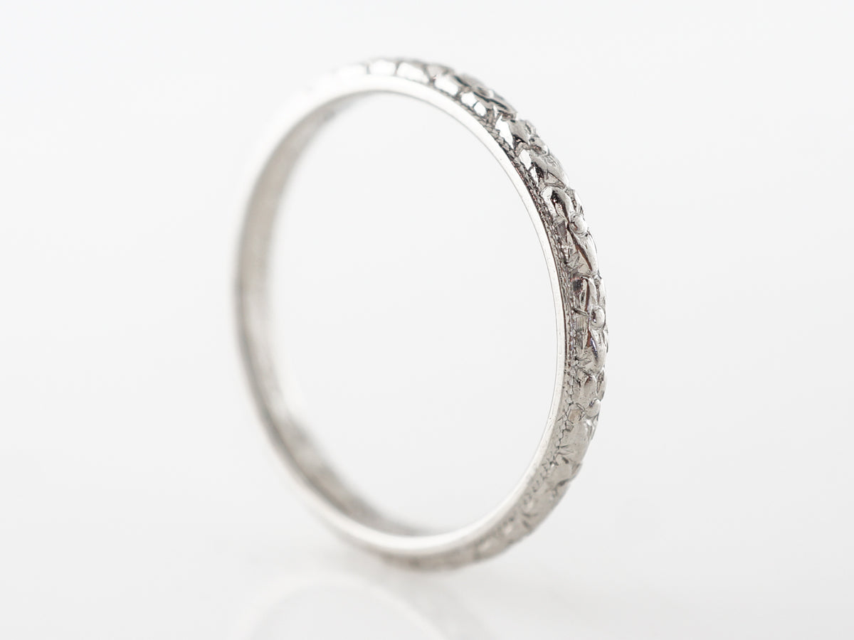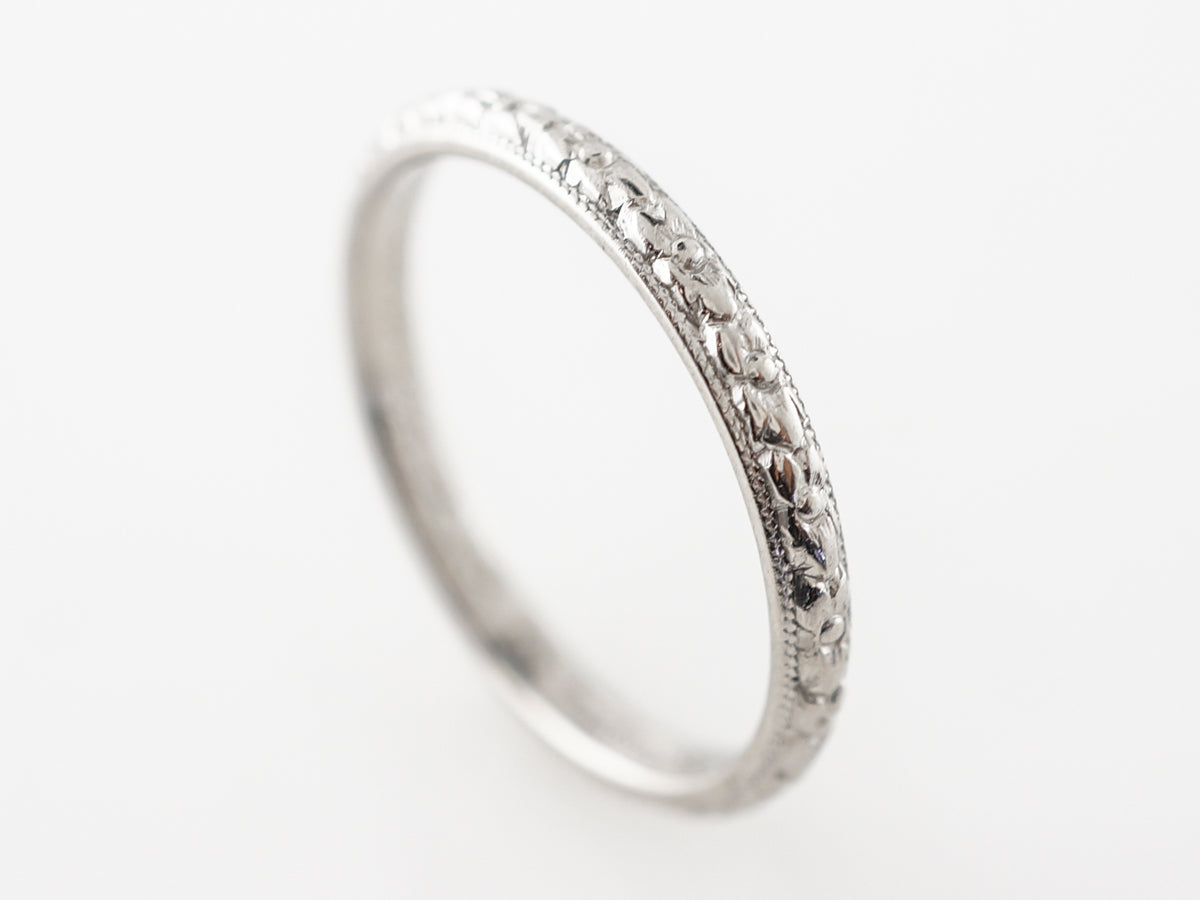 Vintage Orange Blossom Engraved Wedding Band in Platinum. This vintage art deco orange blossom wedding band is made in platinum. It has a pattern of orange blossom that run the length of the band and is bordered by milgrain detail. This band would pair well with an engagement ring or make a great addition to a stack of bands.