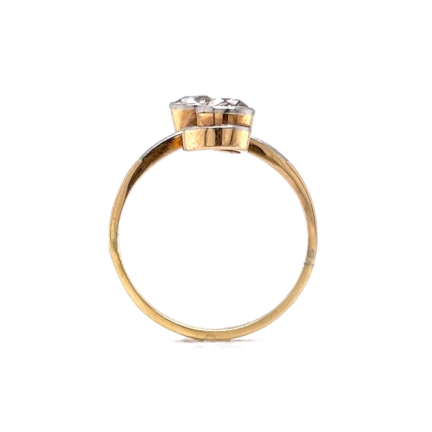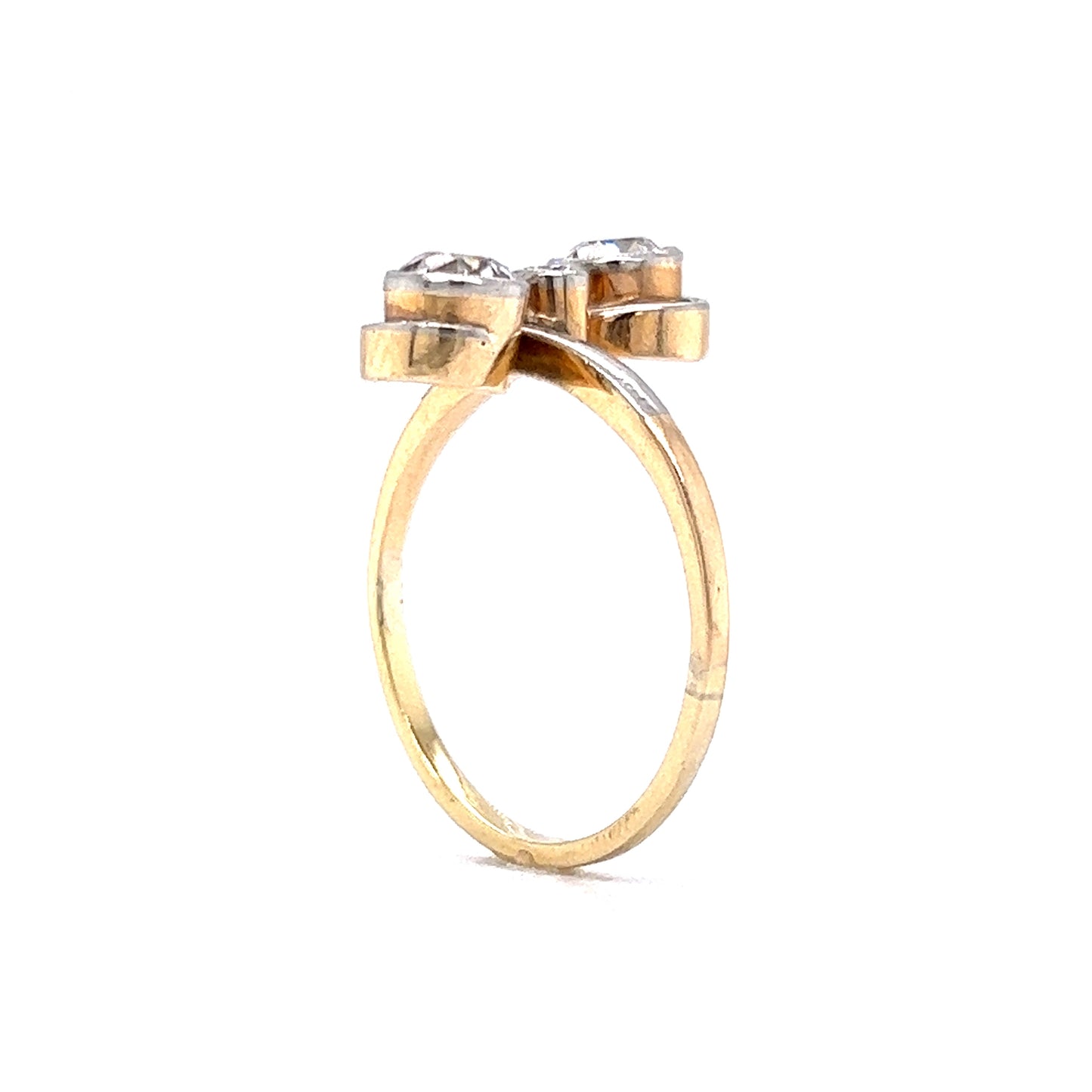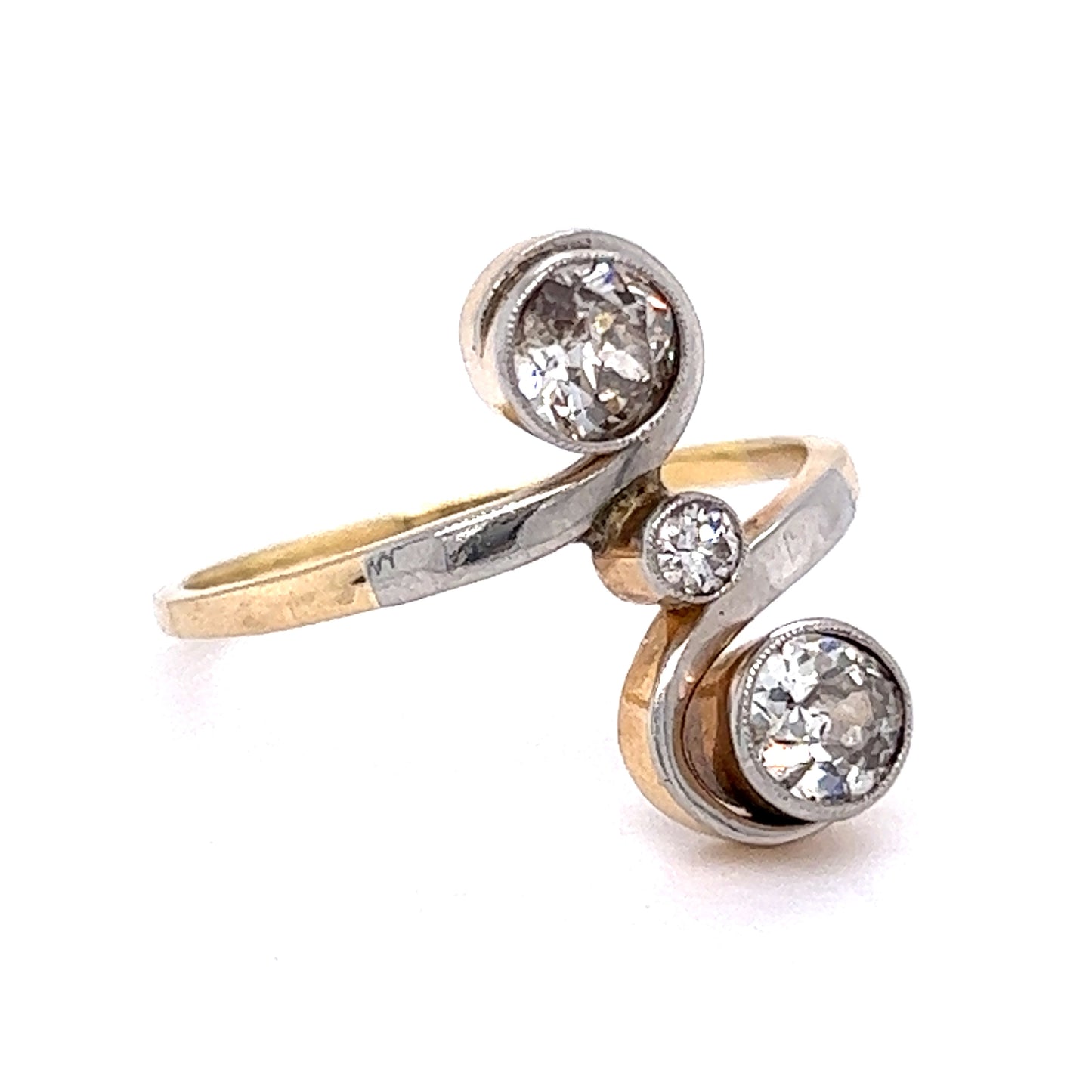 This vintage Retro right hand ring features 1.10 carats of Old European cut diamonds finished in platinum and 14 karat yellow gold. The primary diamond is .47 carats and features a faint, warm hue. The accent OEC diamond weighs .55 carats. A secondary accent diamond weighing .08 carats is mounted at the center of the swirling bypass band. The collection of Old European cut diamonds have a soft glittering effect and delicate fire that brings attention to the head of the ring. Each diamond is bezel set on a two-toned platinum and 14k yellow gold band.