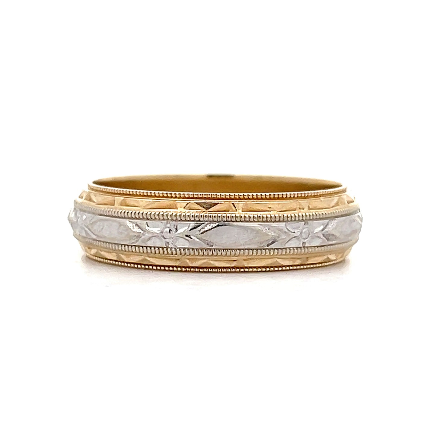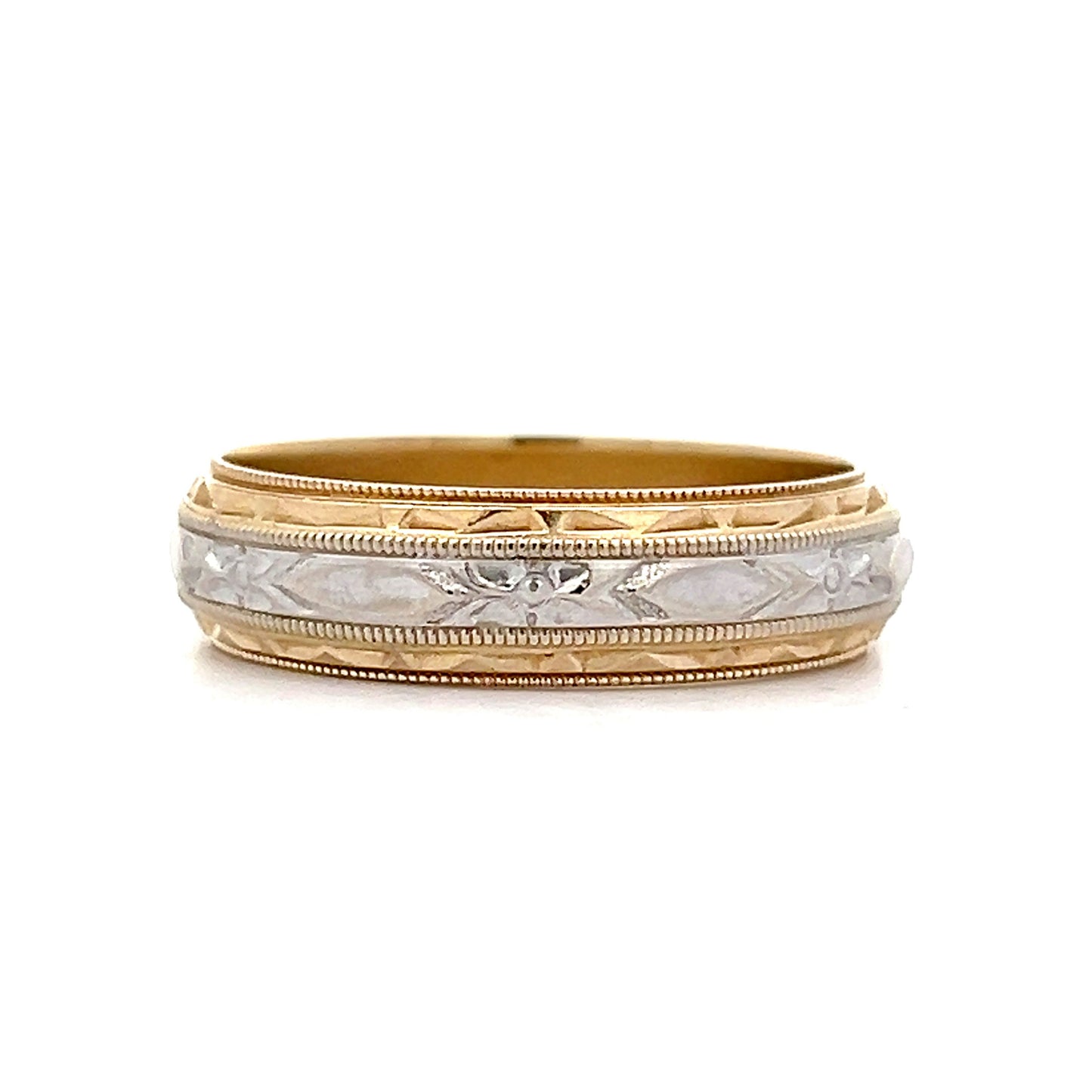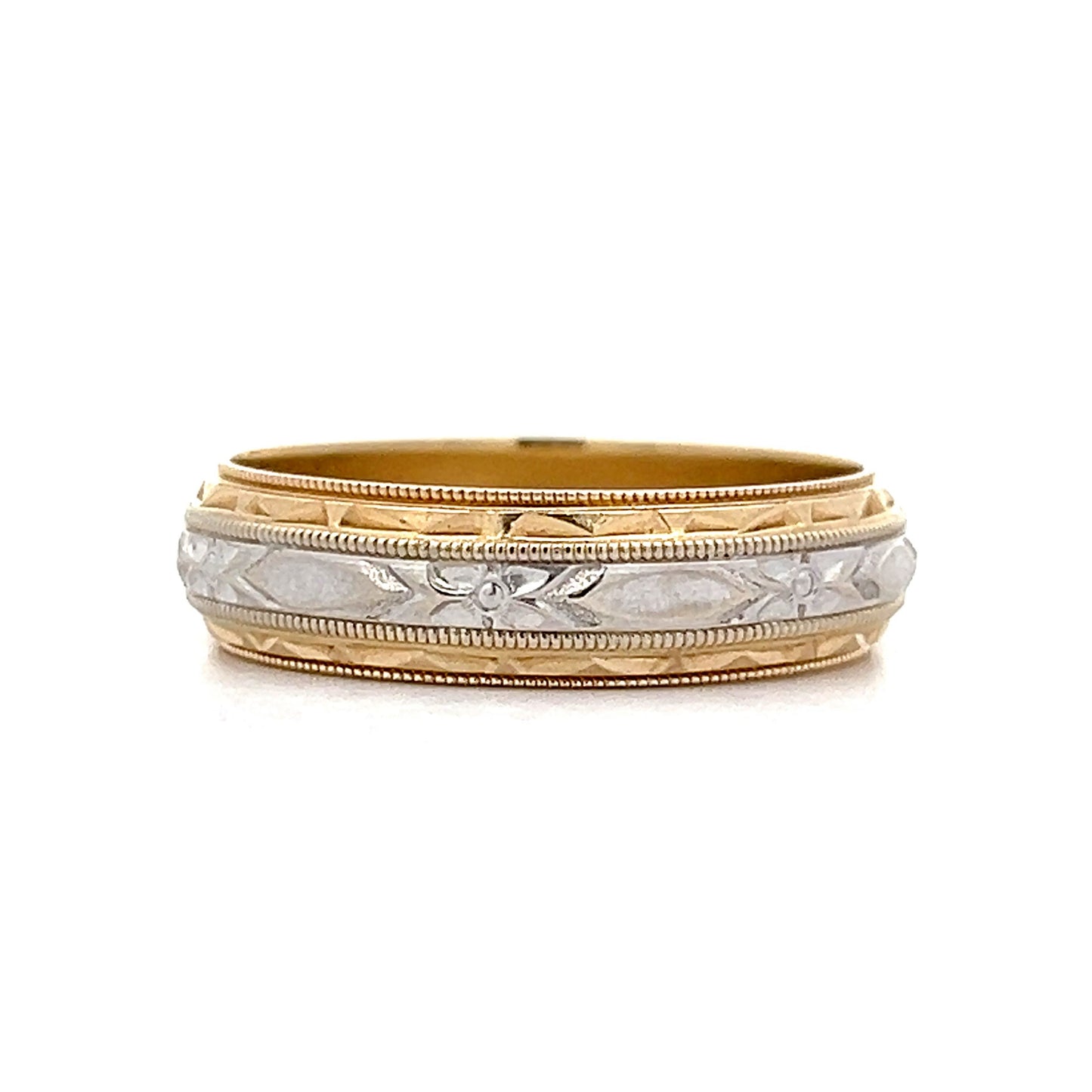 This vintage Retro wedding band is a gorgeous piece from the 1940's. The two-tone band is finished in 14k yellow gold with a 14k white gold center. The interior section of the band features crisp orange blossom engraving around the entirety of the ring. The outer edges feature scalloped cut outs as well as four rows of milgrain. The ring has incredible texture and is in wonderful condition for it's age. This band is perfect for somebody looking for a fancy wedding band and it's truly a one-of-a-kind piece.