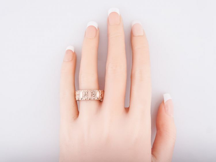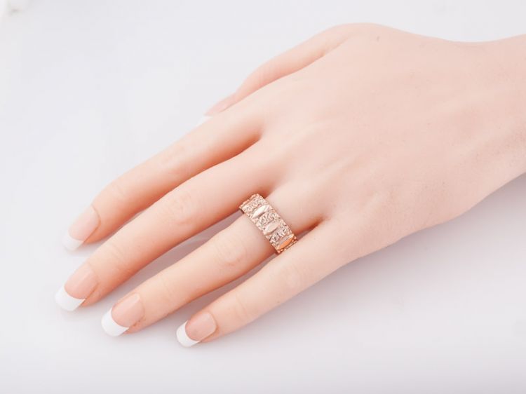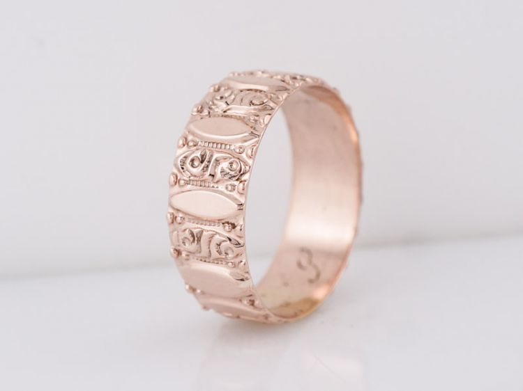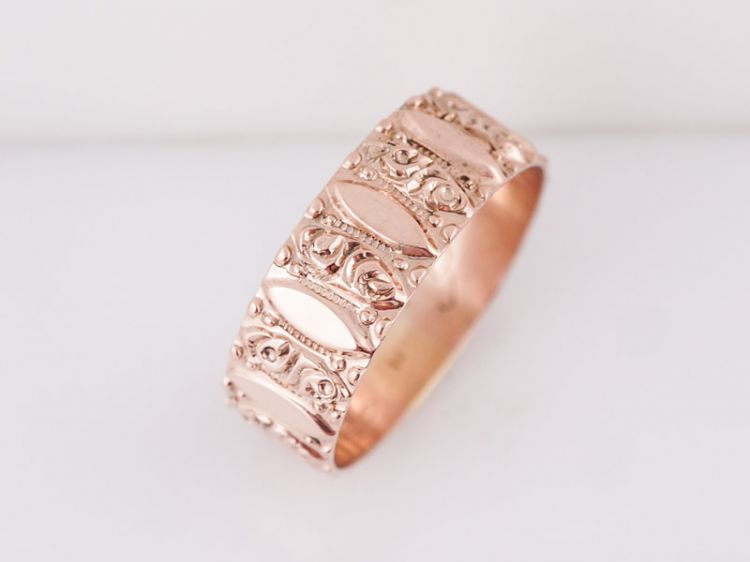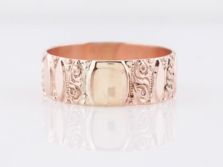This vintage mens band was made in the Retro era. The band is 7.40 mm wide and it is made in 14k rose gold. This ring has a pattern of smooth and ornate navette shapes with small beads of metal between them.