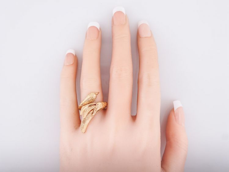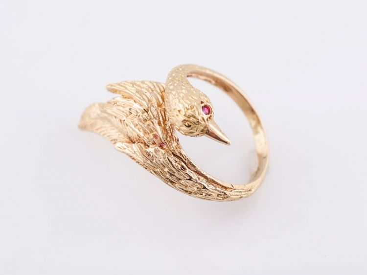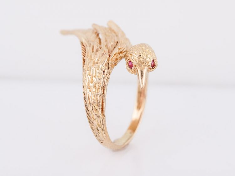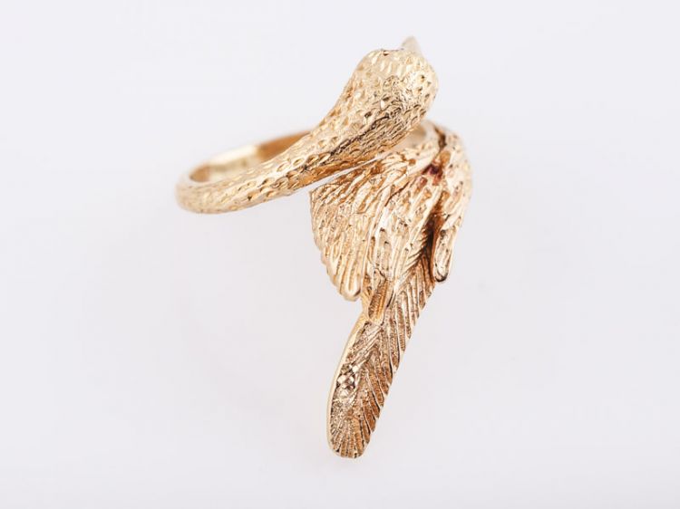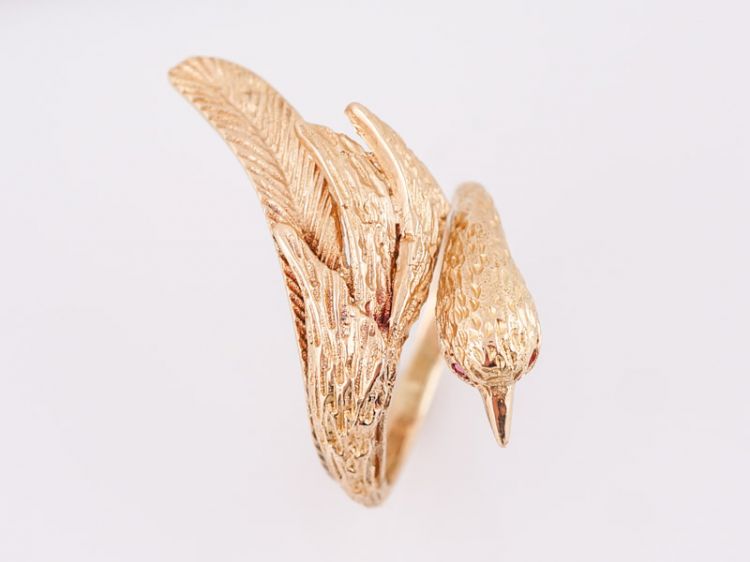 The bird in this Mid-Century ring looks like its in motion because of the way it wraps around the finger. The detailed texture on the birds head and wings make it a realistic rendering. Both of the birds eyes have rubies set into them. Each ruby weighs .02 carat.