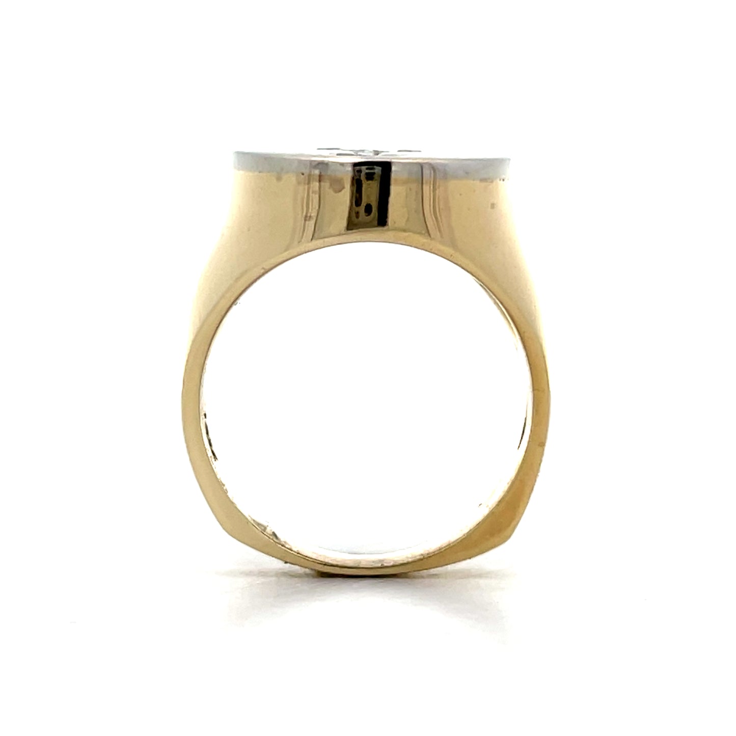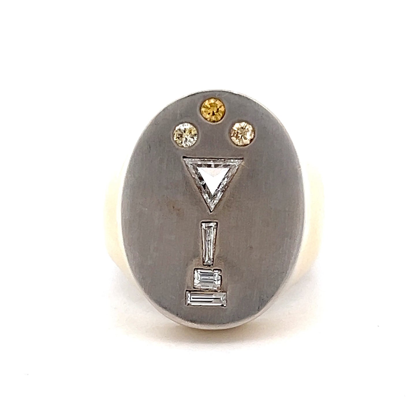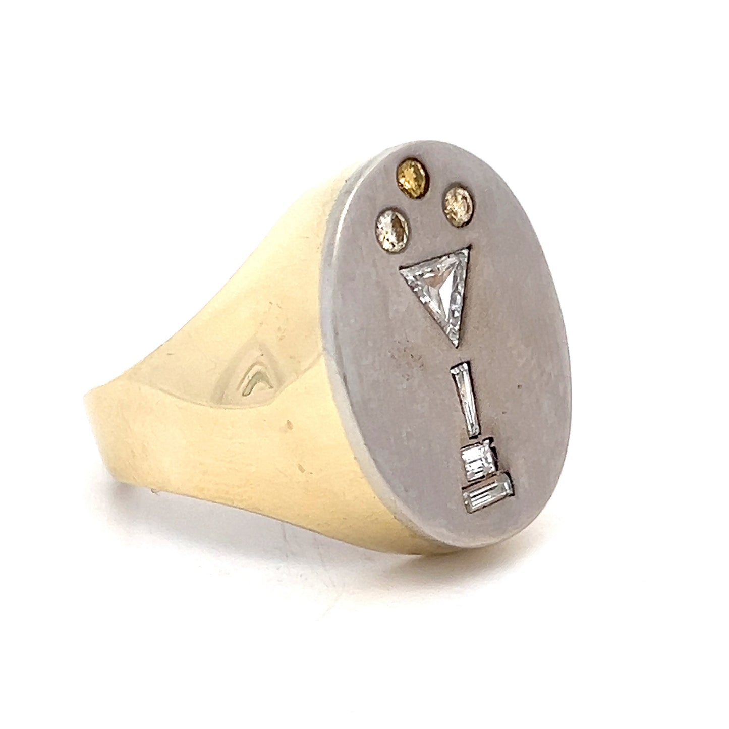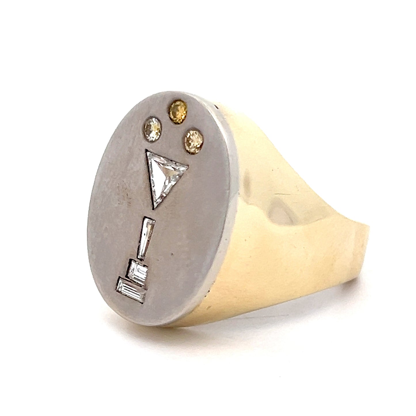 This vintage, Mid-Century era mens ring is the definition of a conversation piece. This larger signet style ring has a variety of cuts and shapes of diamonds that together create a martini glass and olives. This mixed metal ring is a combination of 14k white and yellow gold. This fun piece gives a whole new meaning to the term cocktail ring.