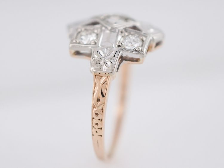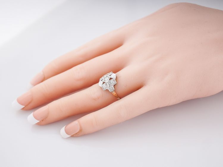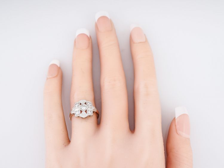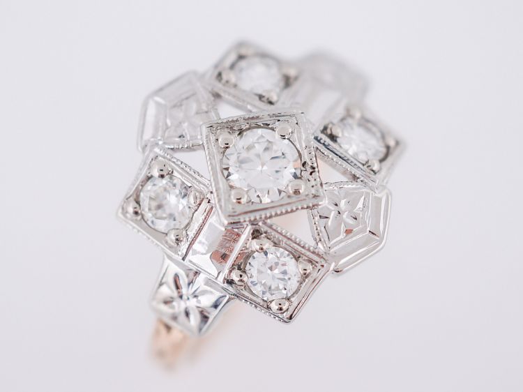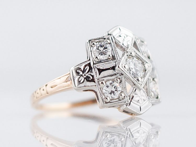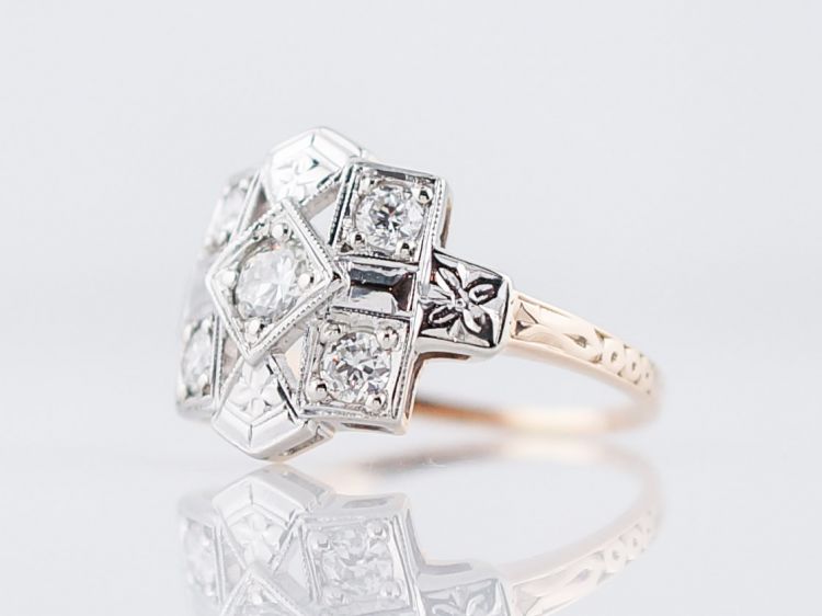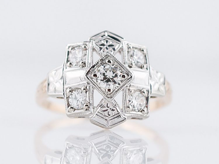 This lovely vintage ring was made in the Retro era. The band is 14k yellow gold and the center is made with 14k white gold. This ring has a shield shape composed of round brilliant diamonds along with floral motifs and geometric shapes in the metal. The negative space inside the sheild adds to the unique design.