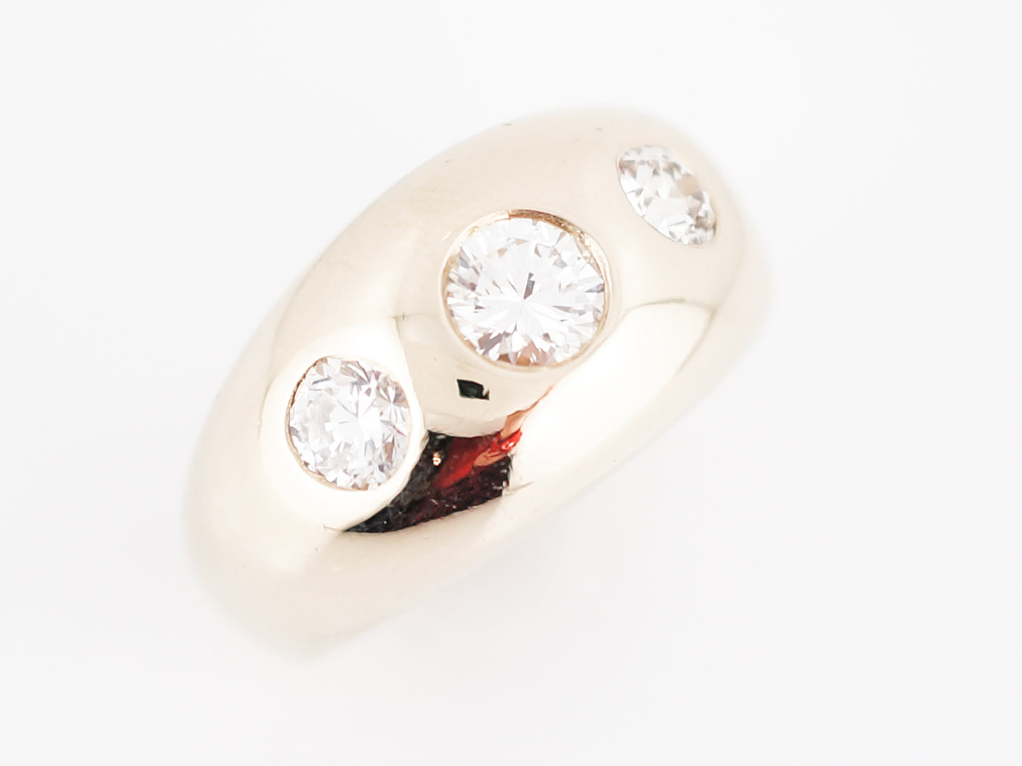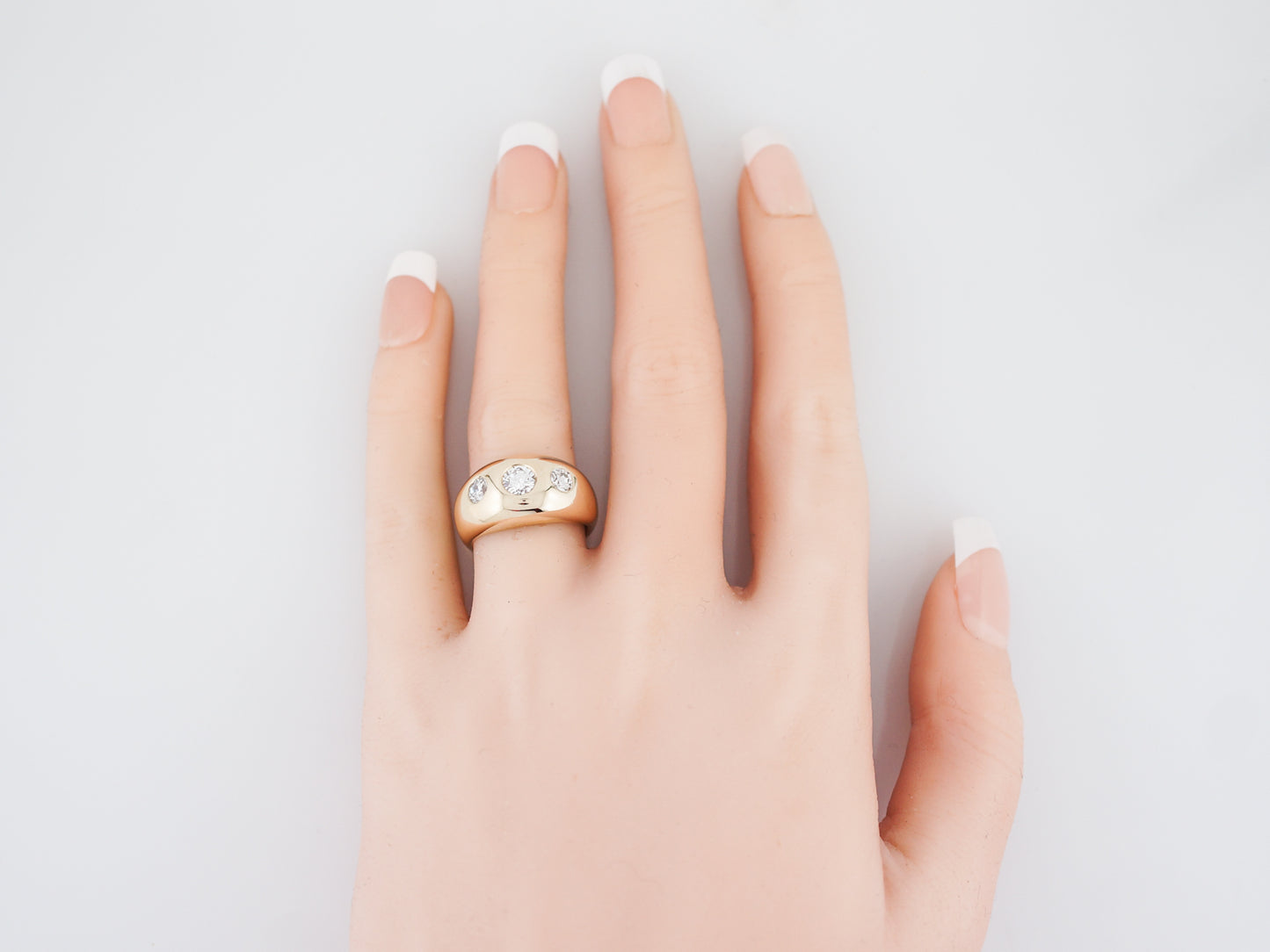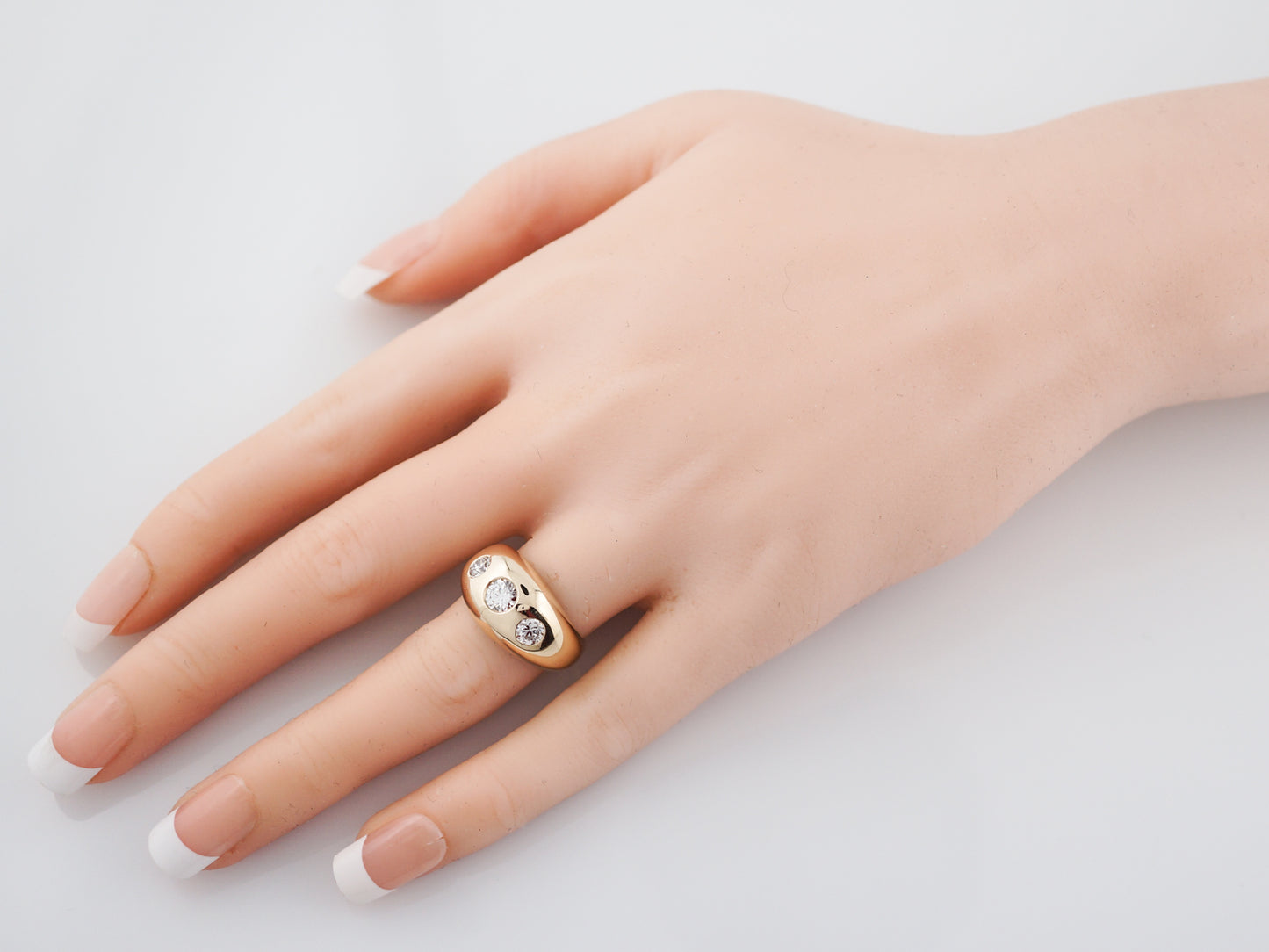 This cool, Retro era ring has a dome shape with diamonds set flush into the 14k yellow gold setting. This means you never have to worry about it catching on things, its and easy to wear and comfortable. The round brilliant cut diamonds in this ring are high quality, they are near colorless and shine from every viewing angle even though they are set into the metal. This ring measures 10.73mm in width. It has a modern look and could be worn by a man or a woman.
