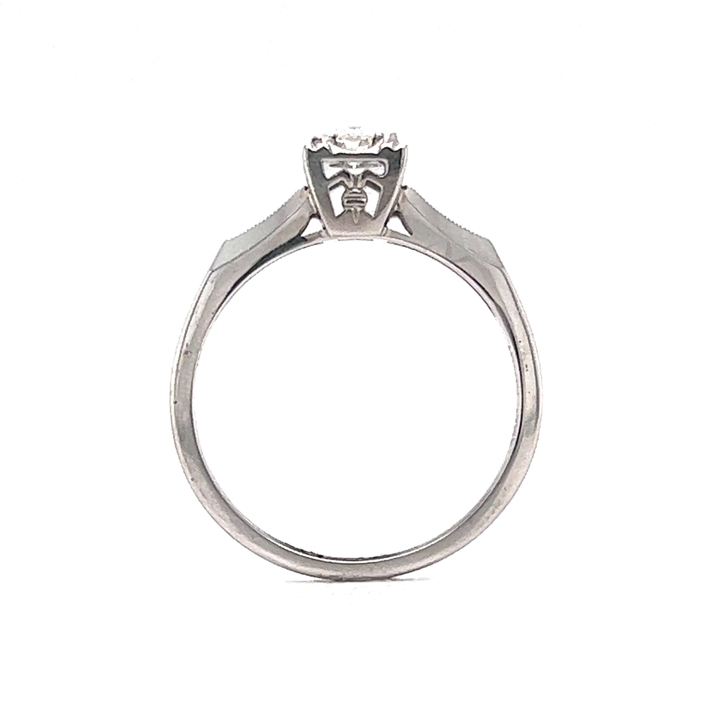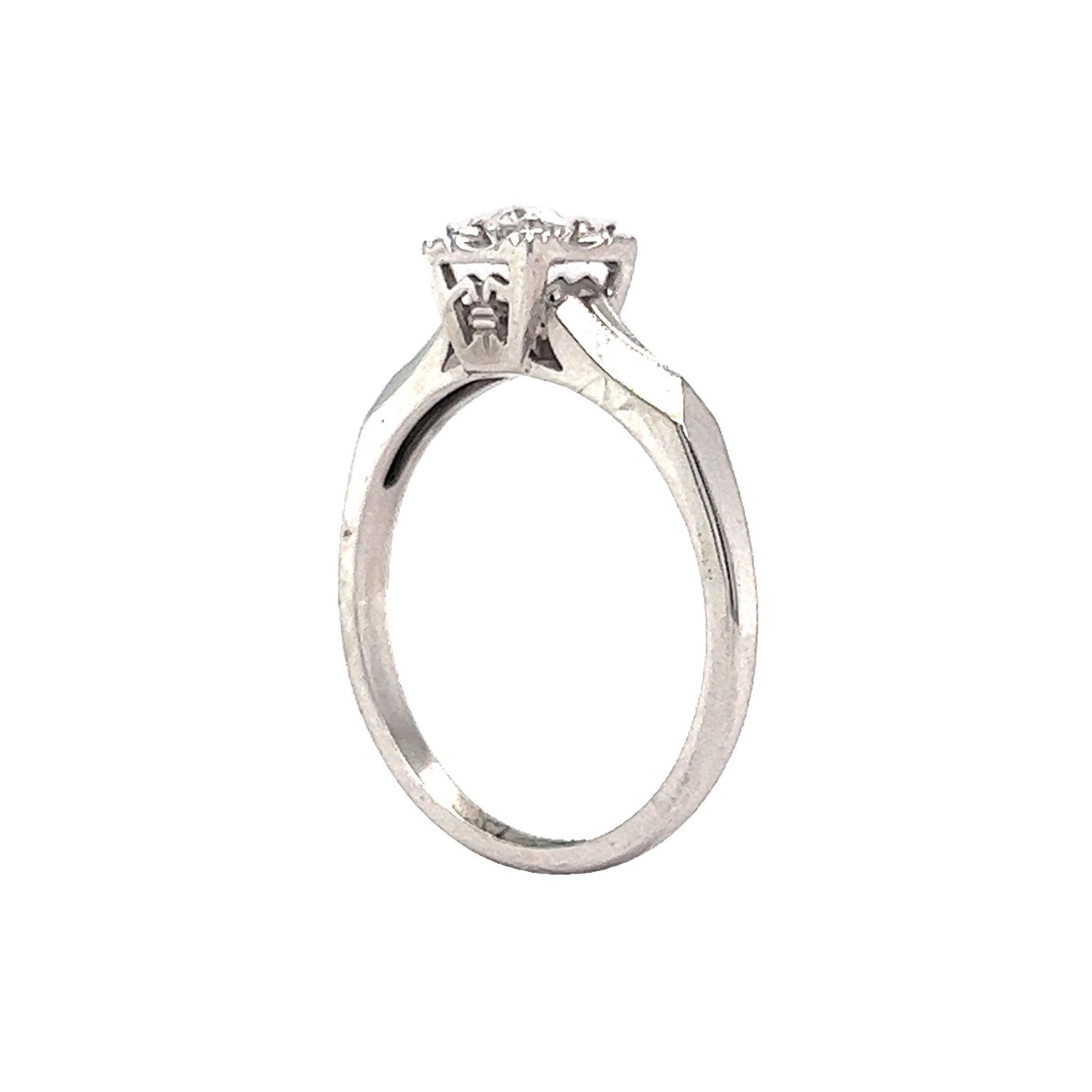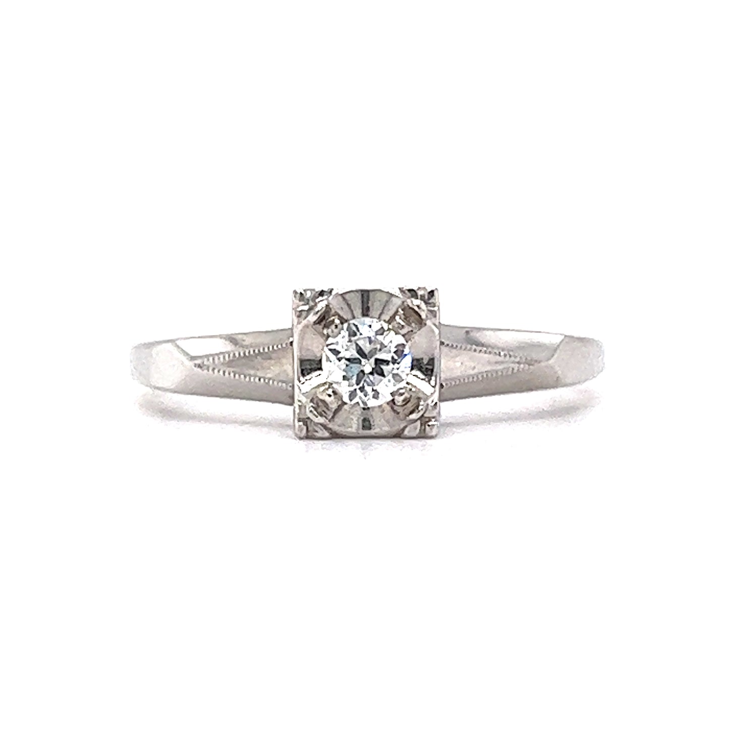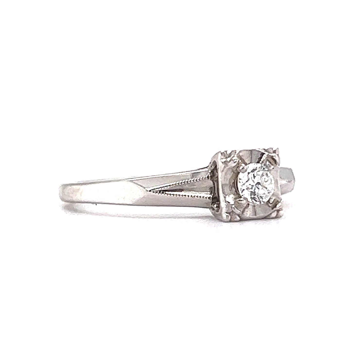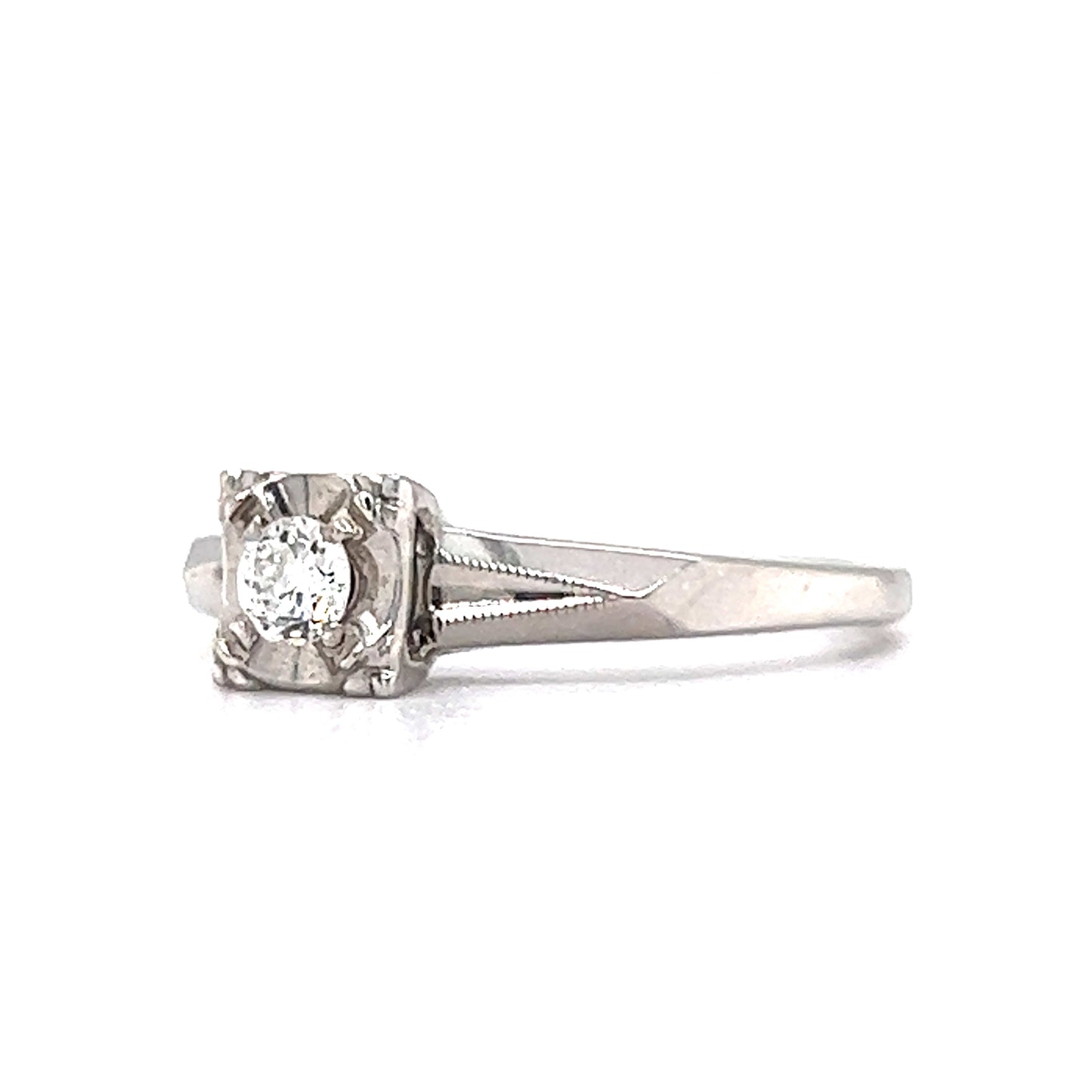 This vintage Mid-Century diamond engagement ring features a .16 carat Round Brilliant cut diamond in 14 karat white gold. The diamond sits upon a very Retro designed square section. Geometric romantic. The shoulders are raised with a sharp angular design that connects with the simple white gold band. Retro Engagement Rings are unique and environmentally responsible.