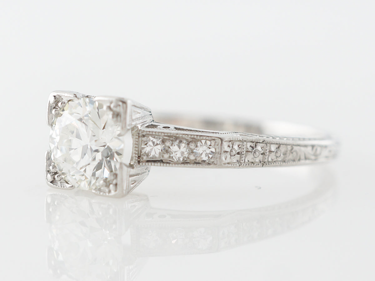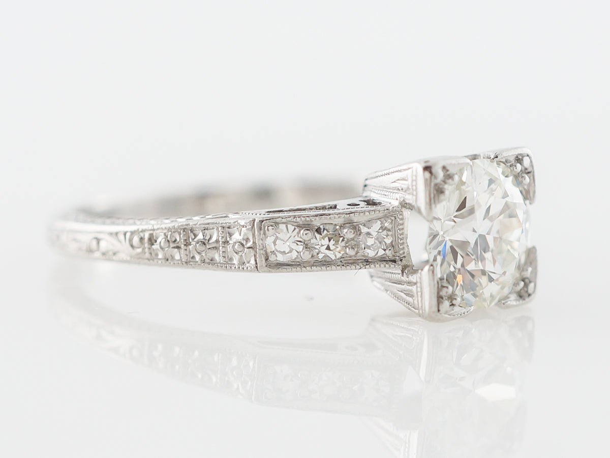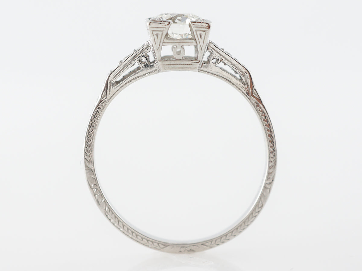 Vintage Square Prong Diamond Engagement Ring in Platinum. This classic Art Deco square prong diamond engagement ring is incredibly detailed and features a spectacular Old European cut diamond at the center. The fine detail down the entire shank is truly special, with flowing engravings down all three outside edges. The shoulders are adorned with six .015 carat accent diamonds that are bead set, with extremely fine milgrain detail outside of them. This is a beautiful example of skilled craftsmanship from the Art Deco era!
