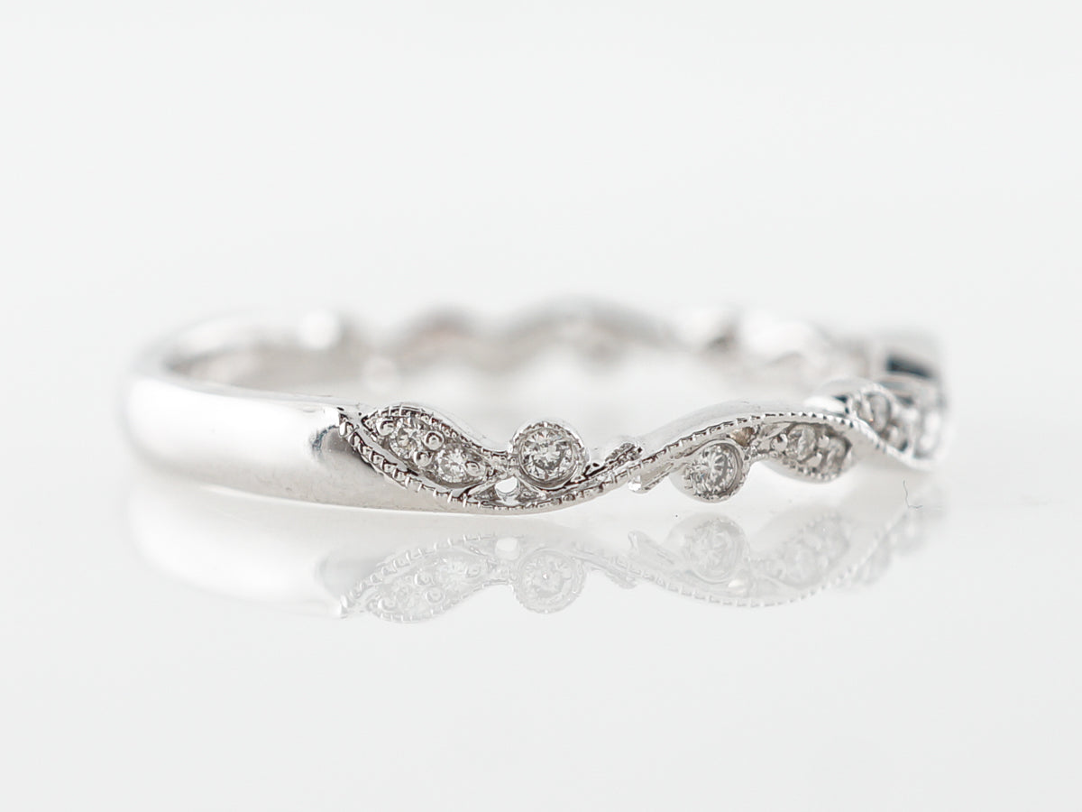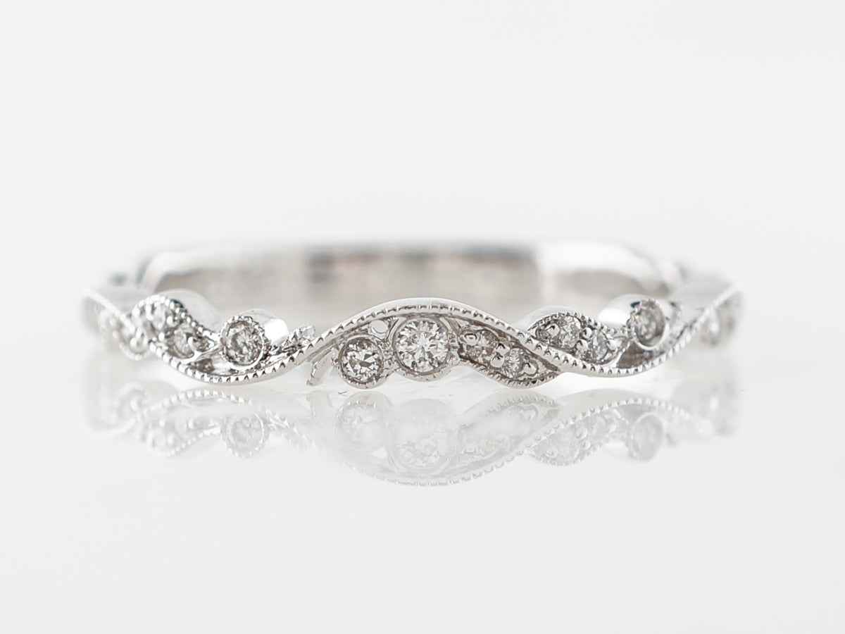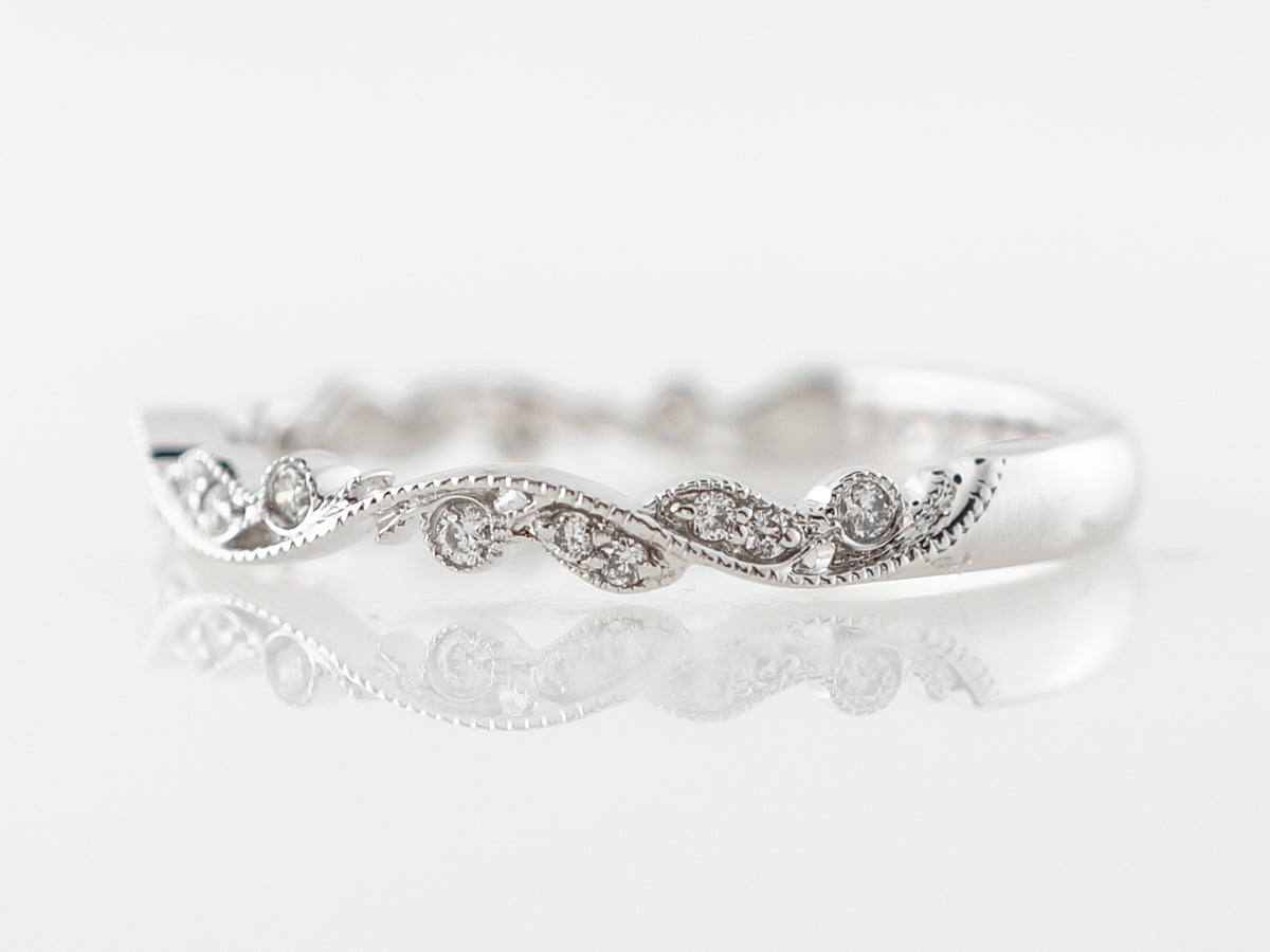 Vintage Style Diamond Band Diamonds in White Gold. This modern diamond wedding band features a fabulous flowing design that weaves through .13 carats of round brilliant cut diamonds and is set in 14 karat white gold. Milgrain detail beautifully separates little clusters of diamonds that also have milgrain work on their bezels. These elements create a unique look that give a very fluid and elegant feel to the ring.