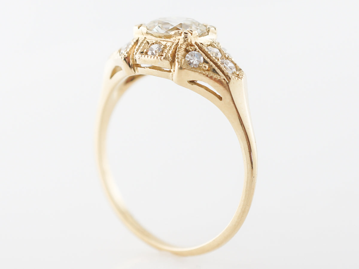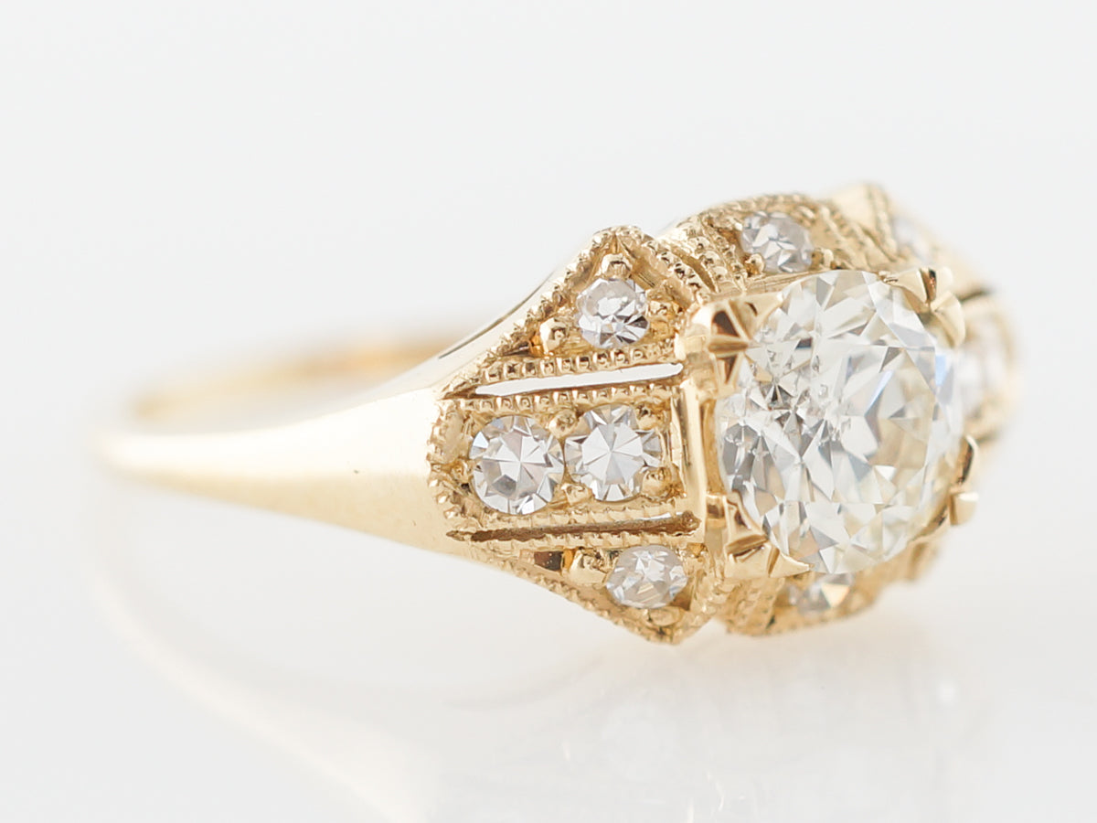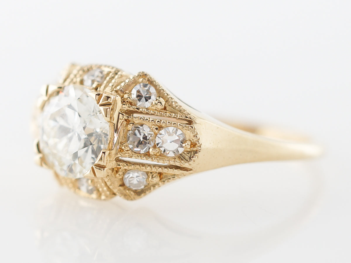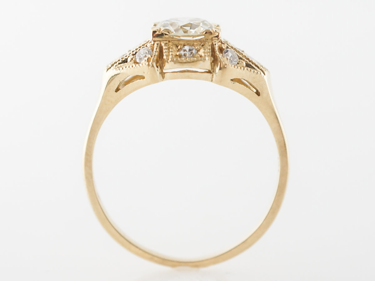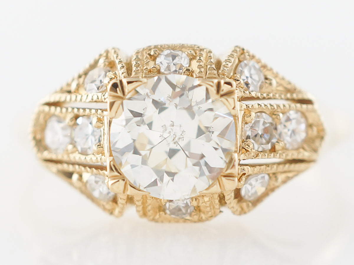 Vintage Style Diamond Engagement Ring in Yellow Gold. This vintage style 18 karat yellow gold diamond engagement ring is set with a .81 carat round brilliant prong set in the center. The center diamond is accented with .23 carats of white round brilliant diamonds bead set into the mounting. The diamonds are all accented with a milgrain edge detail.