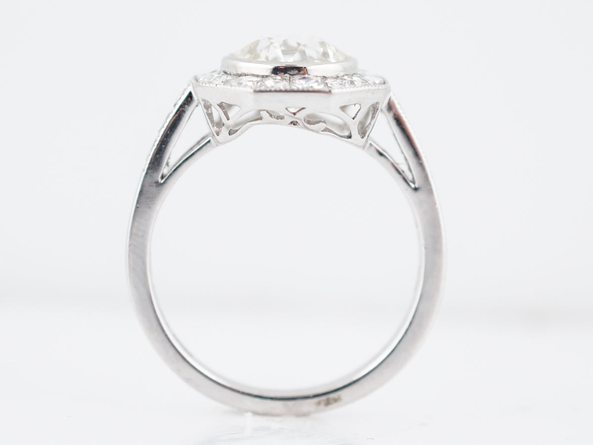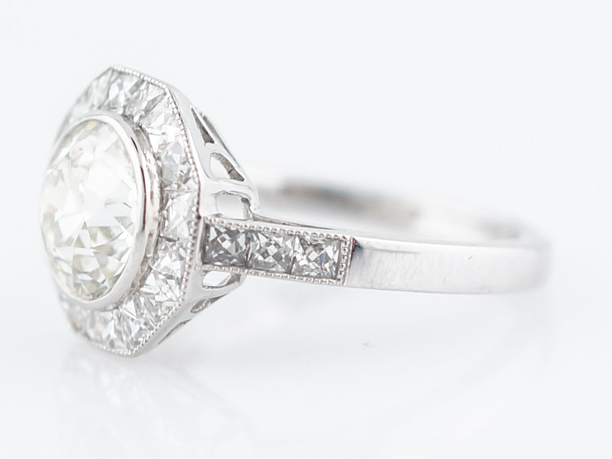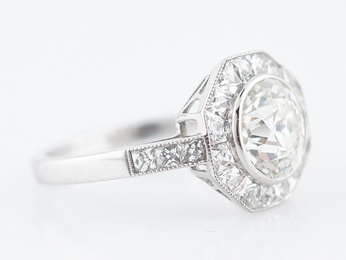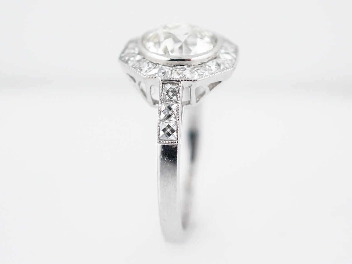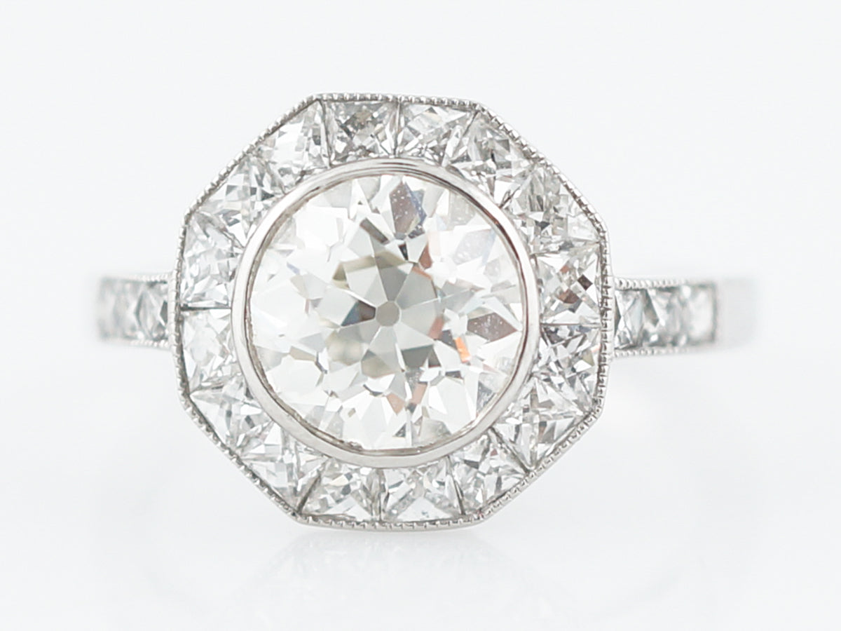 Vintage Style Diamond Halo Engagement Ring in Platinum. This stunning modern diamond ring sparkles from every angle. The bezel set center diamond is a gorgeous 1.89 old European cut diamond. This large stone is surrounded by almost two and half carats of rare french cut diamonds. The french cut diamonds lend to the overall geometric shape of the ring. The under carriage features beautiful filigree lattice work and beautiful milgrain detail borders the diamonds. This modern creation is a throw back to the best of what the art deco period had to offer!
