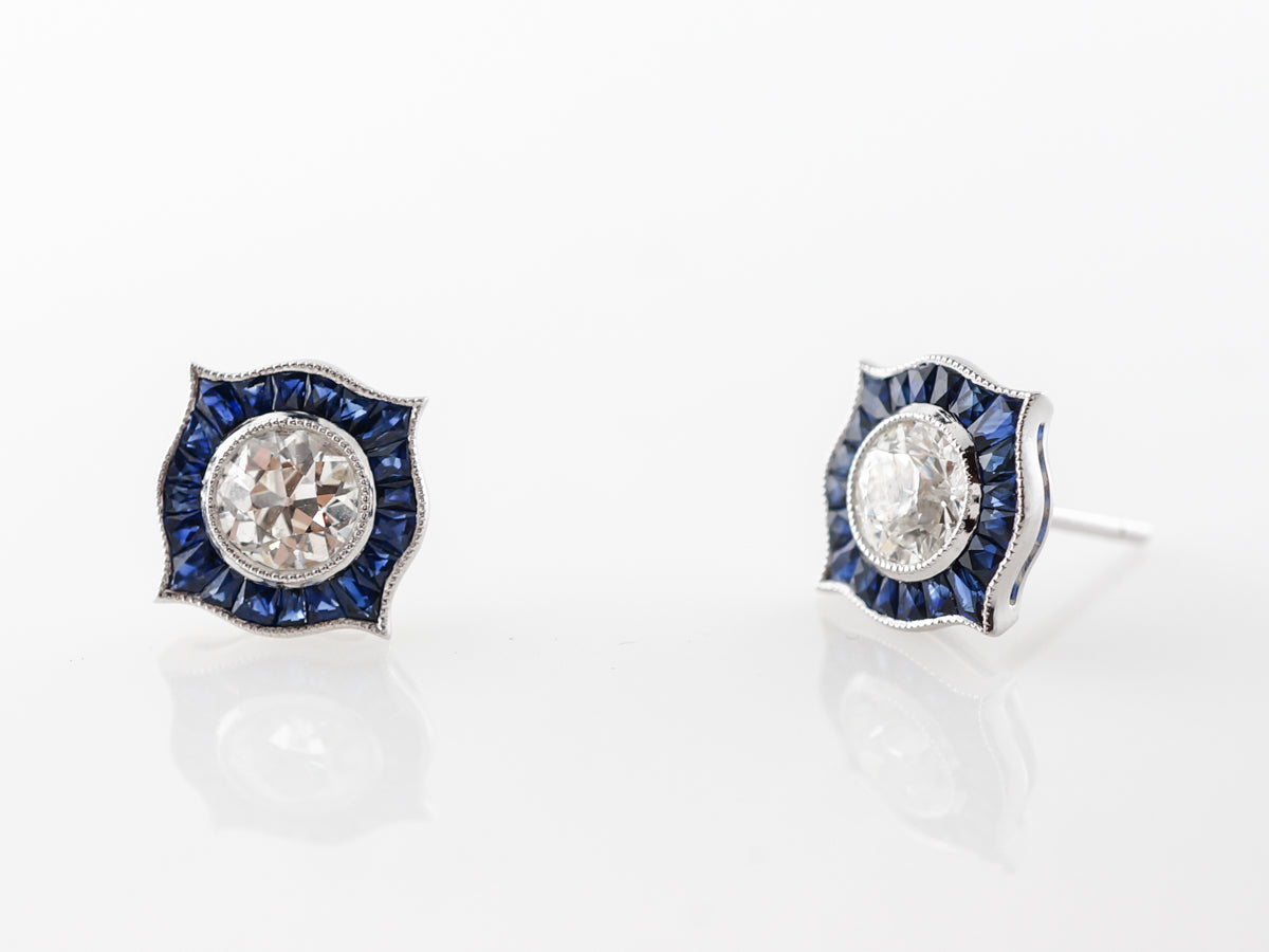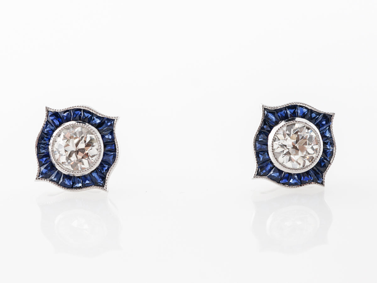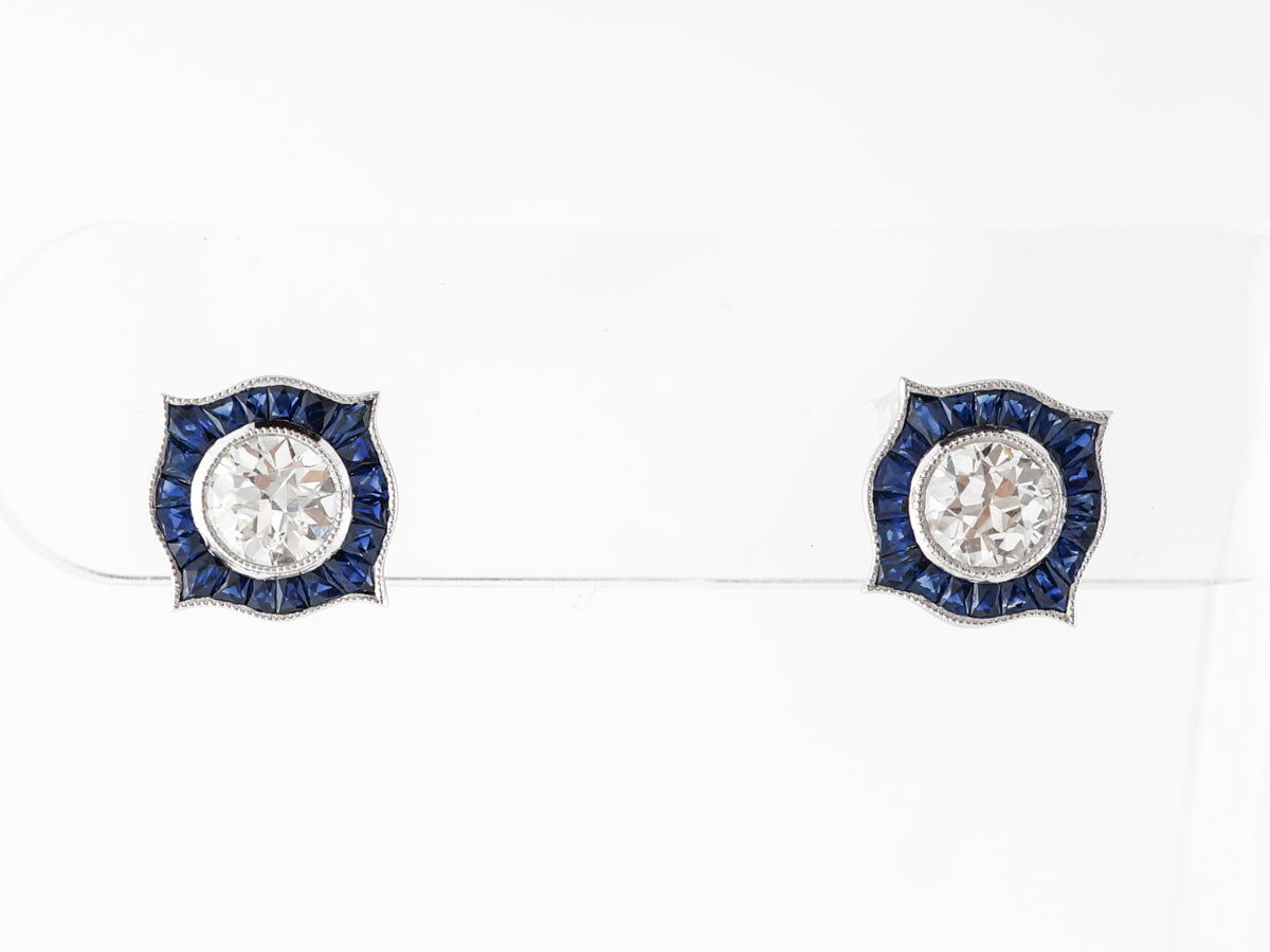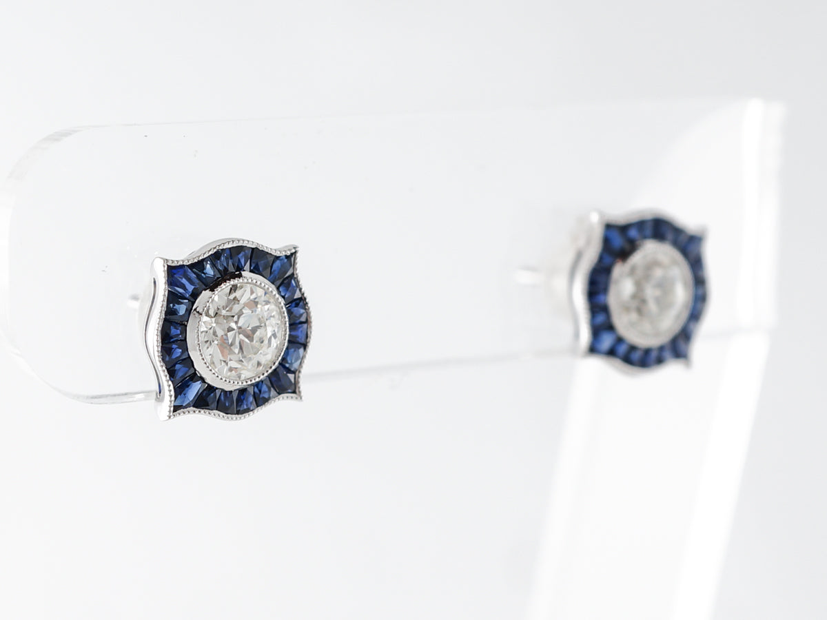 Vintage Style Diamond Stud Earrings w/ Sapphire Accents