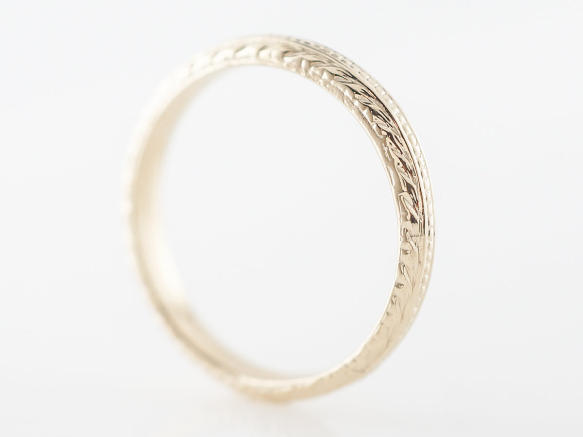 Vintage Style Engraved Wedding Band in Yellow Gold. This modern wedding band is a reproduction of an art deco engraved wedding band. Finished in 14k yellow gold, the band features a repeating wheat pattern on the outside edges split by milgrain down the center. This would pair wonderfully with a yellow gold engagement ring.