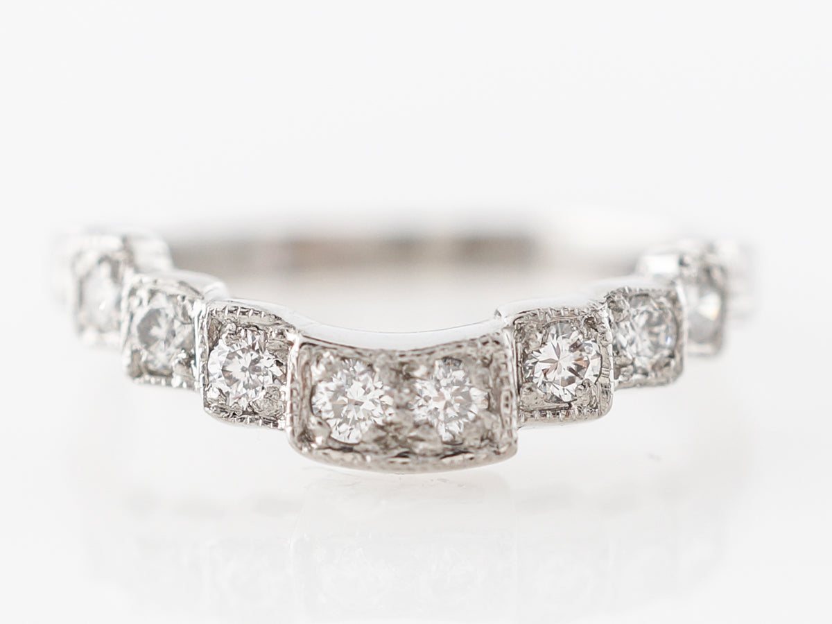 Vintage Style Ring Guards w/ Diamonds in Platinum. These vintage style diamond ring guards provide an enhanced frame to any diamond engagement rings. Created in platinum the curved diamond bands are set with round diamonds bead set into square decorative stations. The total diamond weight for both bands is .48 carats adding brilliance to any engagement ring.