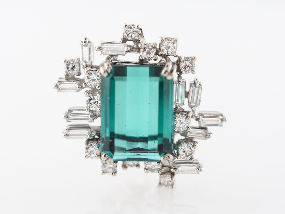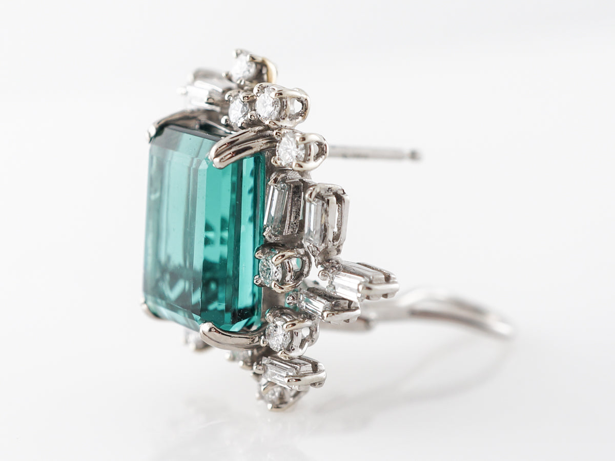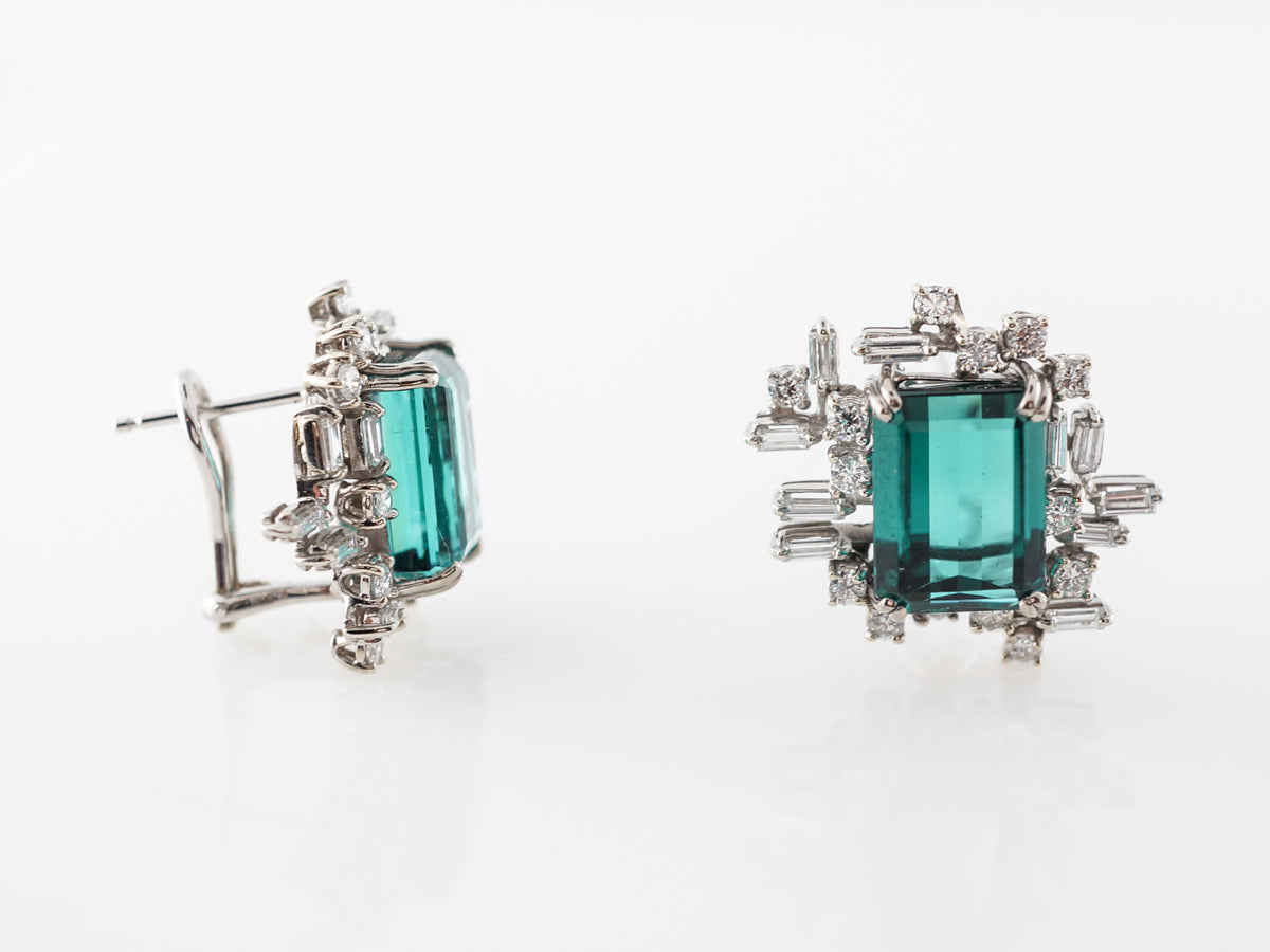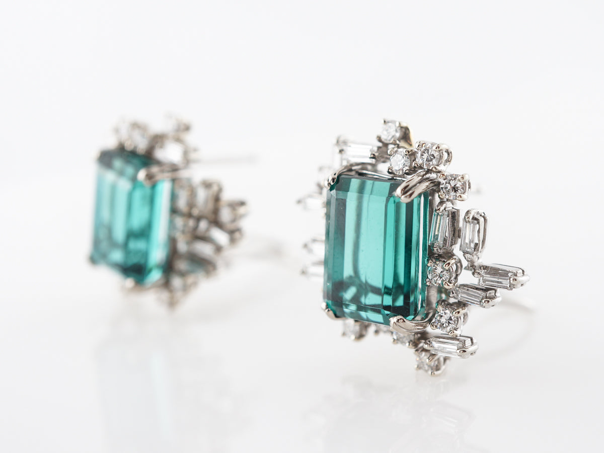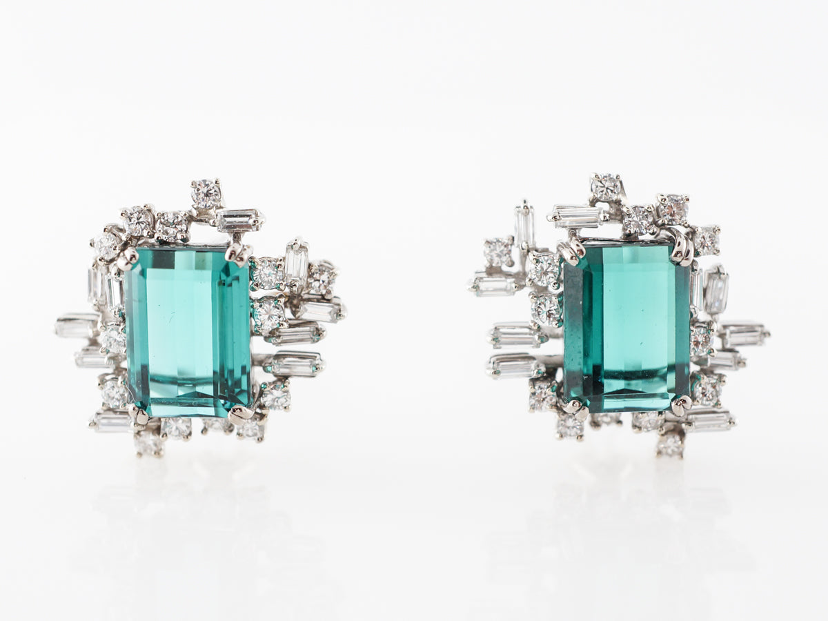 Vintage Tourmaline Diamond Earrings in 14k.  These mid-century earrings feature 7.01 carats of Indicolite blue tourmaline and 2.04 carats of diamonds and are set in 14 karat white gold. The rare blue tourmalines are prong set on the corners above a chaotic cluster of round brilliant and baguette cut diamonds. The chaos and asymmetry of the diamond layout adds such an interesting depth as they are anchored to the emerald cut primary stones. The earrings are secured with an omega back.