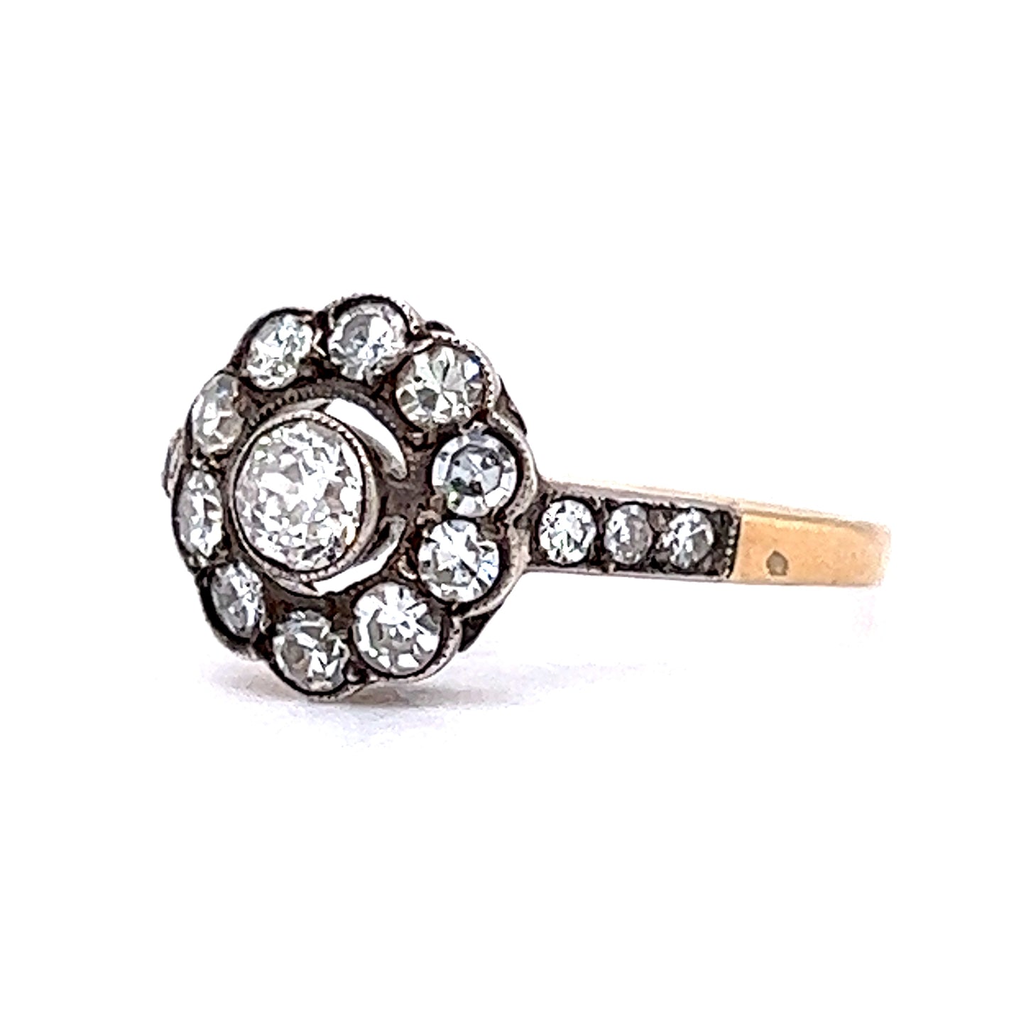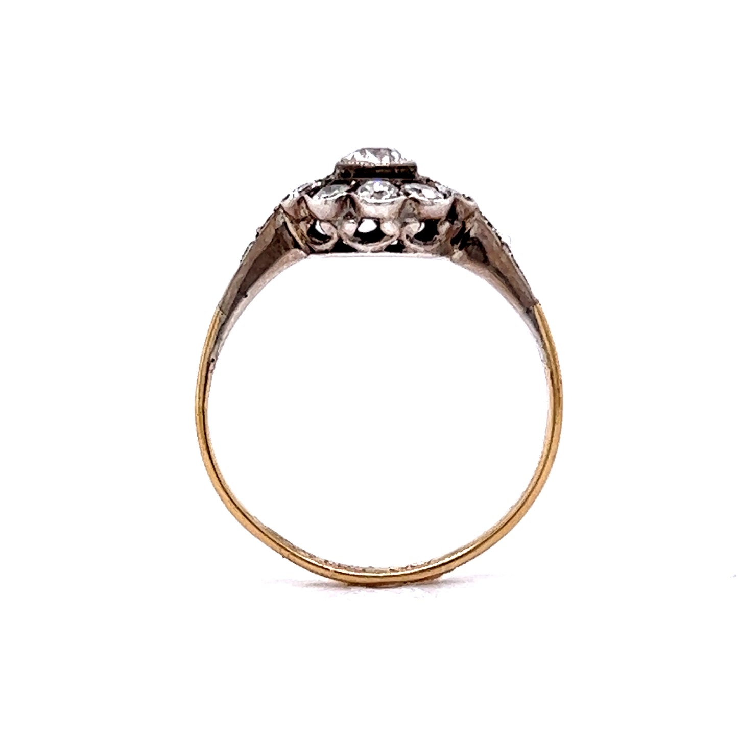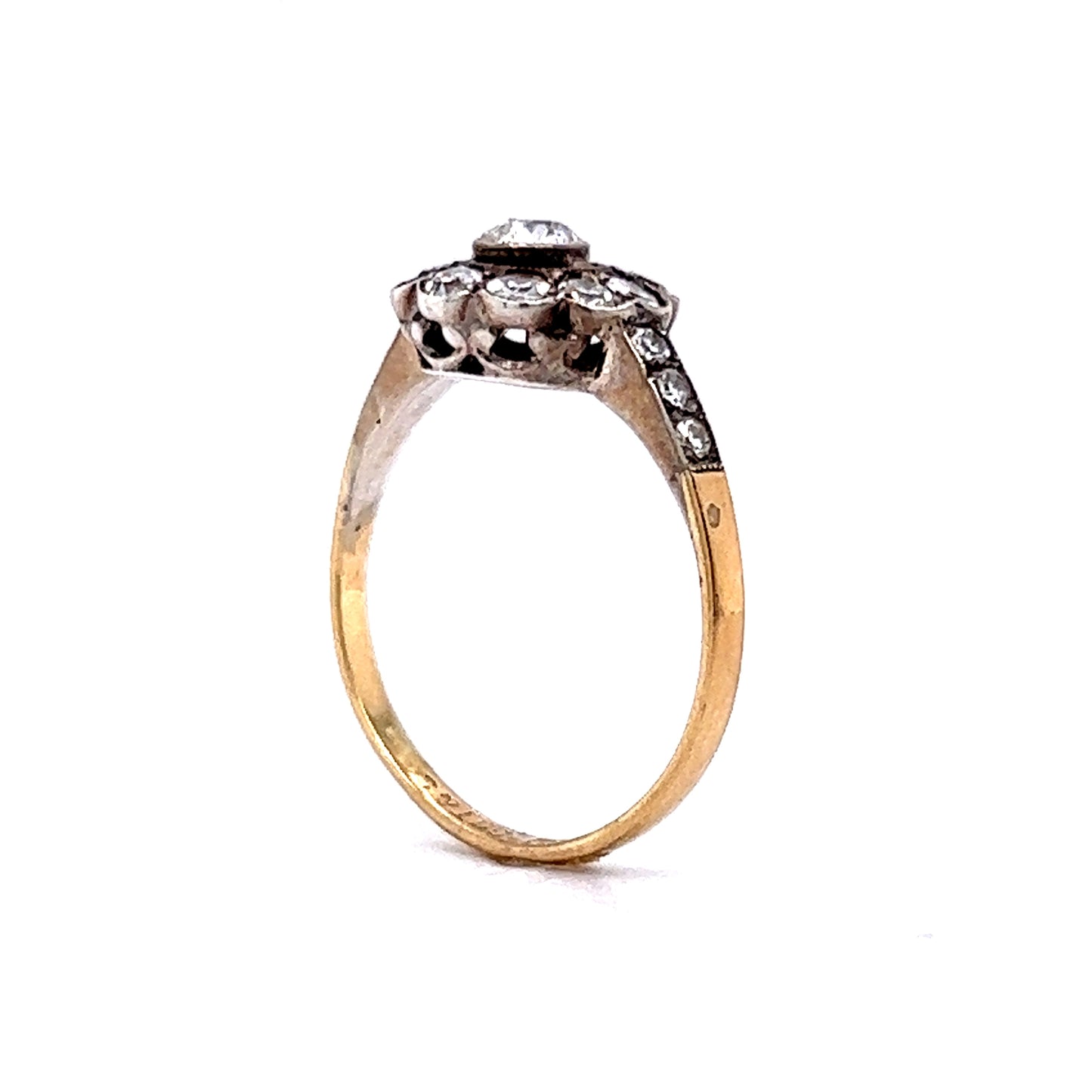 Vintage Victorian Diamond Cluster Engagement Ring in Yellow Gold. This vintage Victorian diamond cluster engagement ring features an Old European cut bezel set inside a floating diamond halo. The size of the single cut diamonds in the halo, in relation to the center stone, was very popular in the Victorian period. This delicate ring offers a two tone look with both colors of 9k gold. The shoulders are dressed will single cut diamonds for added dazzle and a total diamond weight of .56 carat.