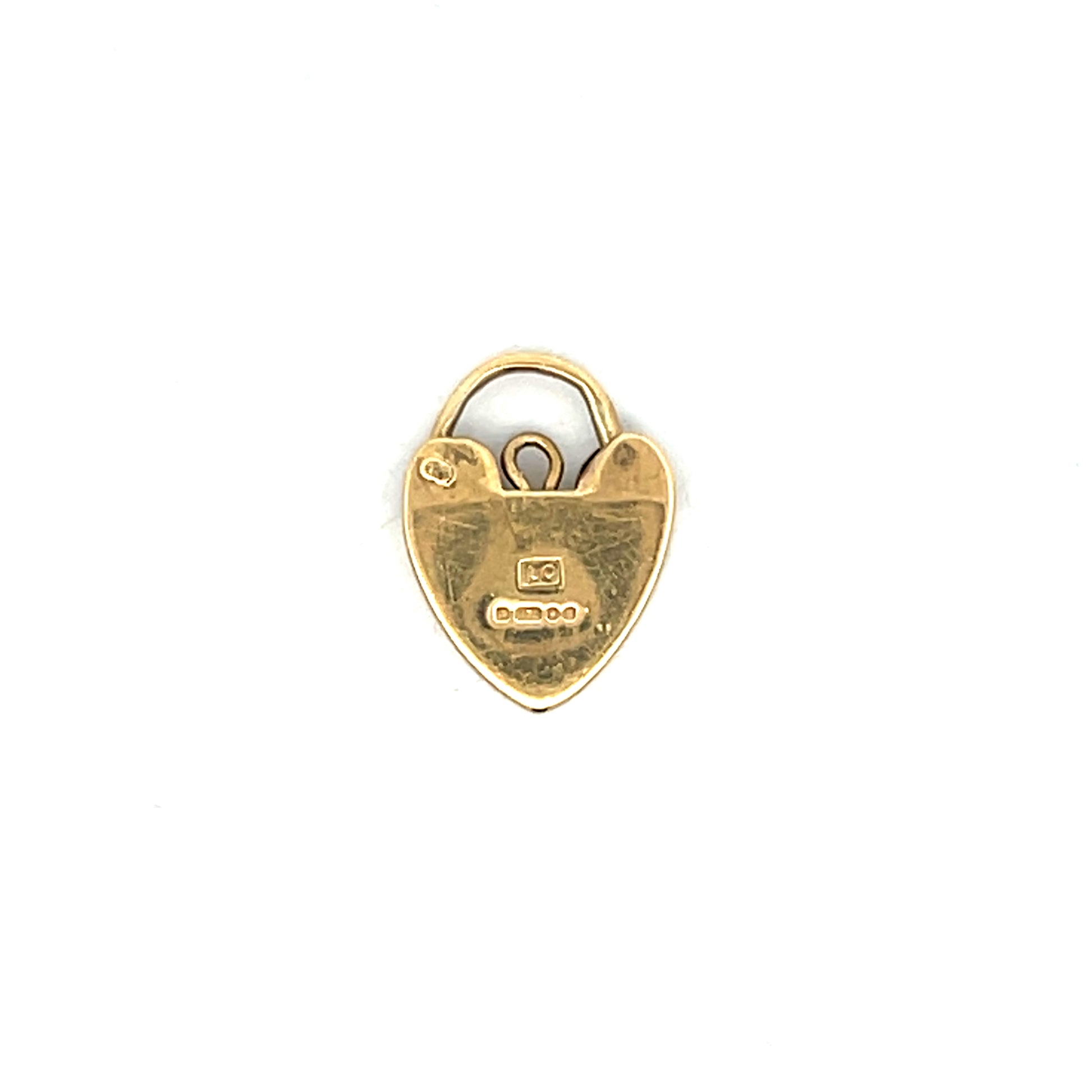 The 9K gold composition was common in British jewelry and contains 37.5% pure gold mixed with other metals for durability. Victorian details include decorative scroll work and dimensional shaping that gives the heart depth rather than a flat profile. The lock design includes a keyhole opening on the front, and the charm can be added to existing bracelets or worn as a pendant.
