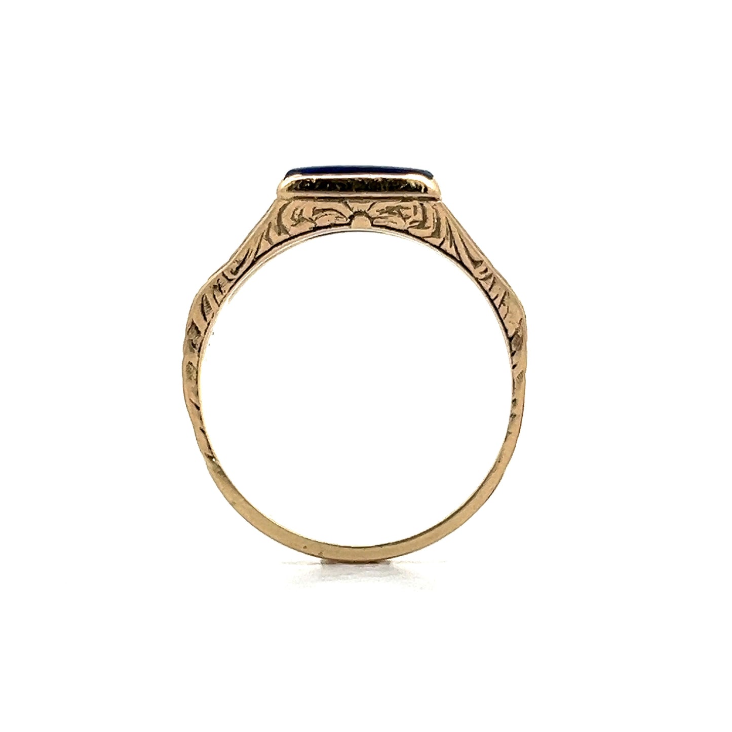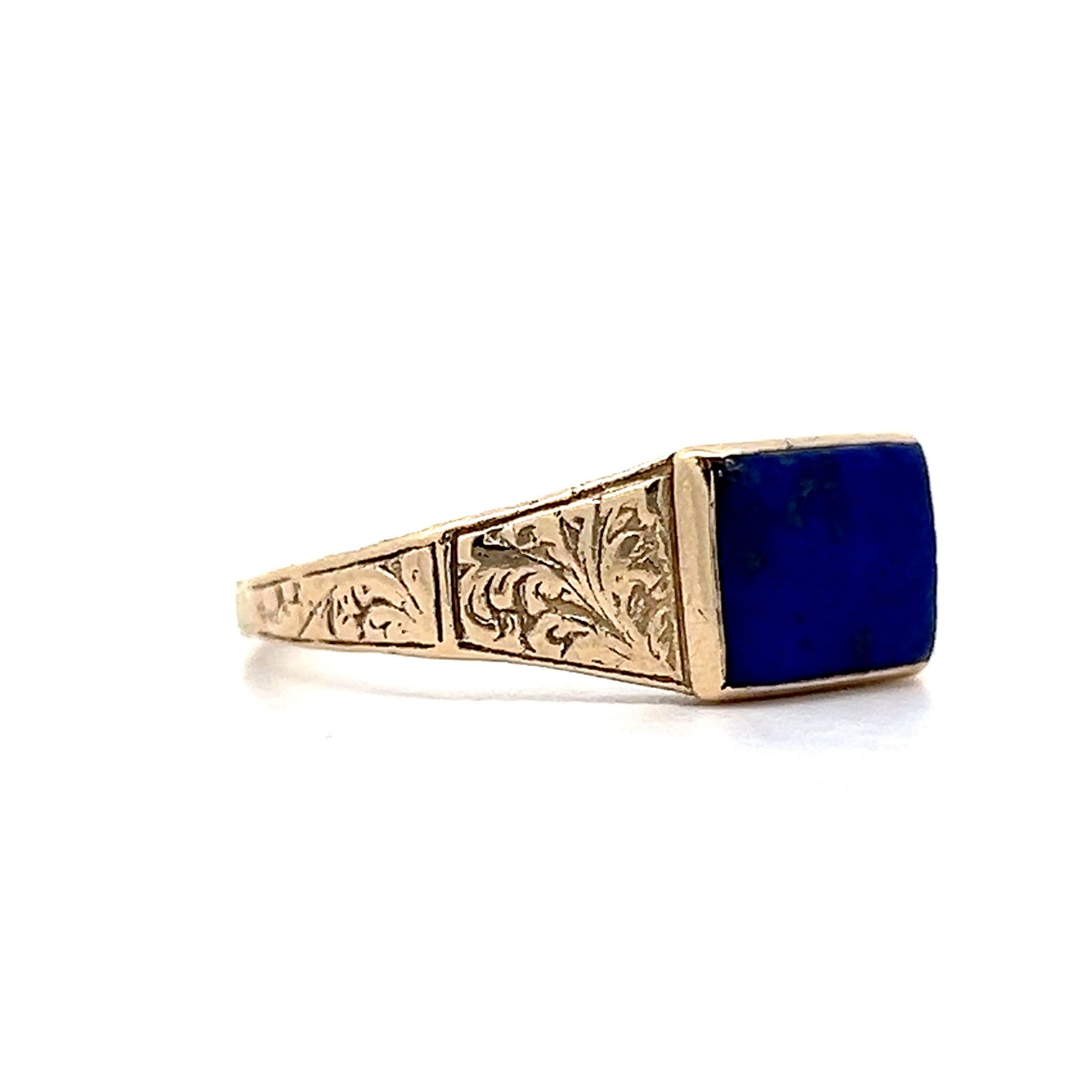 Introducing a timeless piece for the modern gentleman. This Victorian era men's ring features an ornate engraved bezel in highly polished 14 karat yellow gold. The cabochon cut Lapis Lazuli takes center stage, showcasing its deep blue hue and smooth surface. The polished yellow gold band is accented with decorative shoulders, adding a touch of sophistication to this antique design. A perfect combination of elegance and masculinity, this ring is a must-have for any jewelry collection. Add a touch of Victorian charm to your wardrobe with this engraved Lapis Lazuli ring.