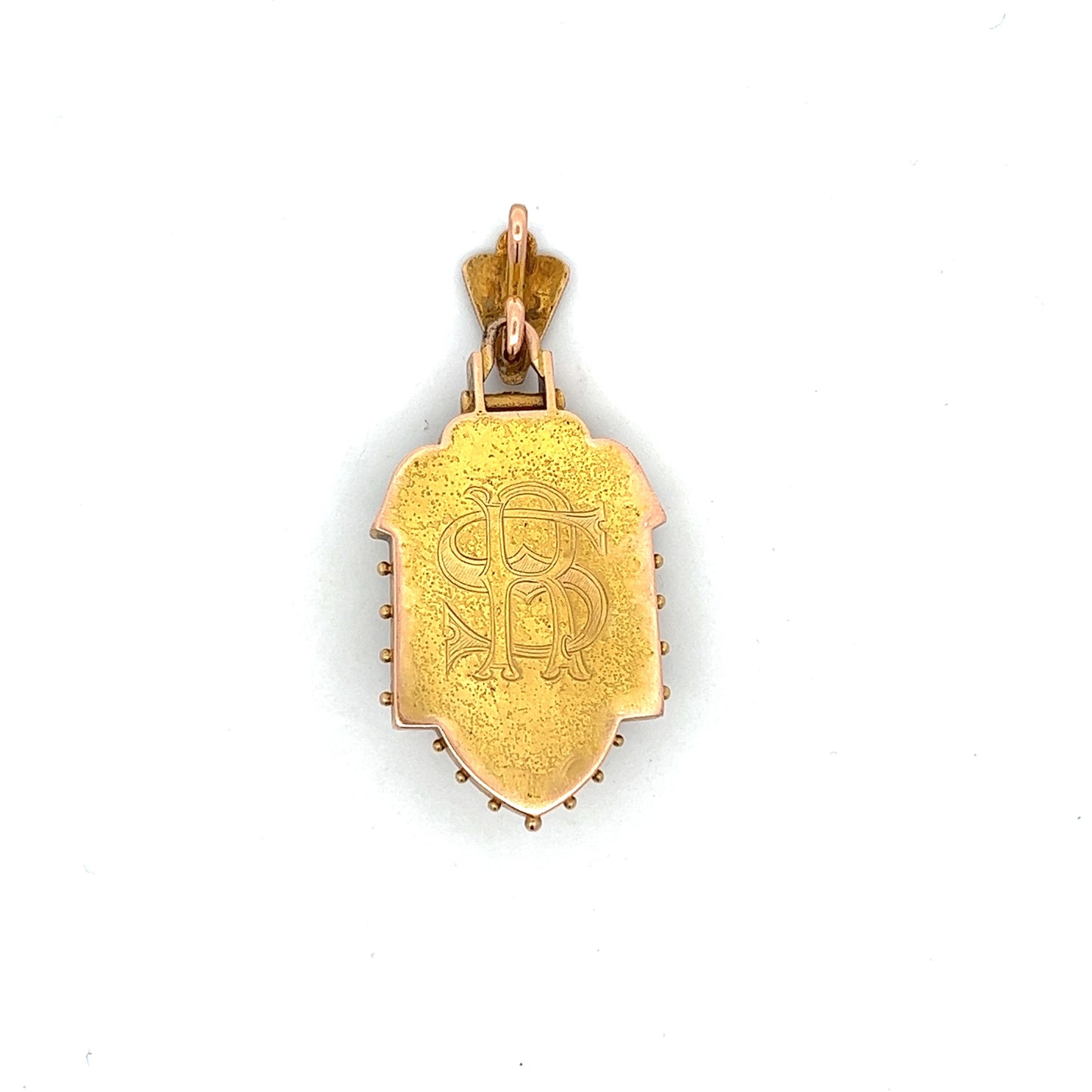 Crafted in 14 karat yellow gold, this locket pendant features a stunning Etruscan Revival design, complete with intricate details and ornate gold beads along the exterior. The center of the locket is adorned with delicate seed pearls, measuring 1.5mm in size. The locket opens to reveal a space for a memento or photo, making it a meaningful and sentimental accessory. The back of the locket is engraved with the initials 'S R', adding a personal touch to this Victorian piece. Finished with a scalloped bail, this locket pendant has a beautiful gold patina.
