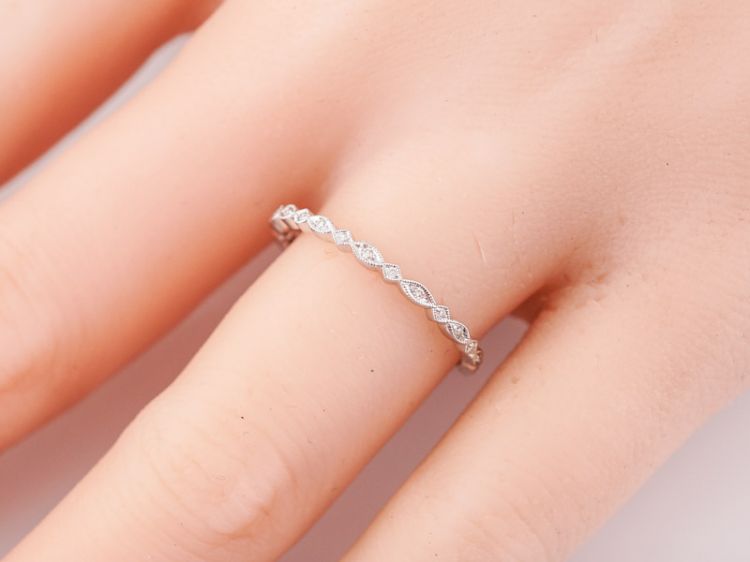 This Modern wedding band is made with 14k white gold. This ring features bead set diamonds in stations that alternate in size and shape. The stations cover three quarters of the band and each is bordered by crisp milgrain detail.