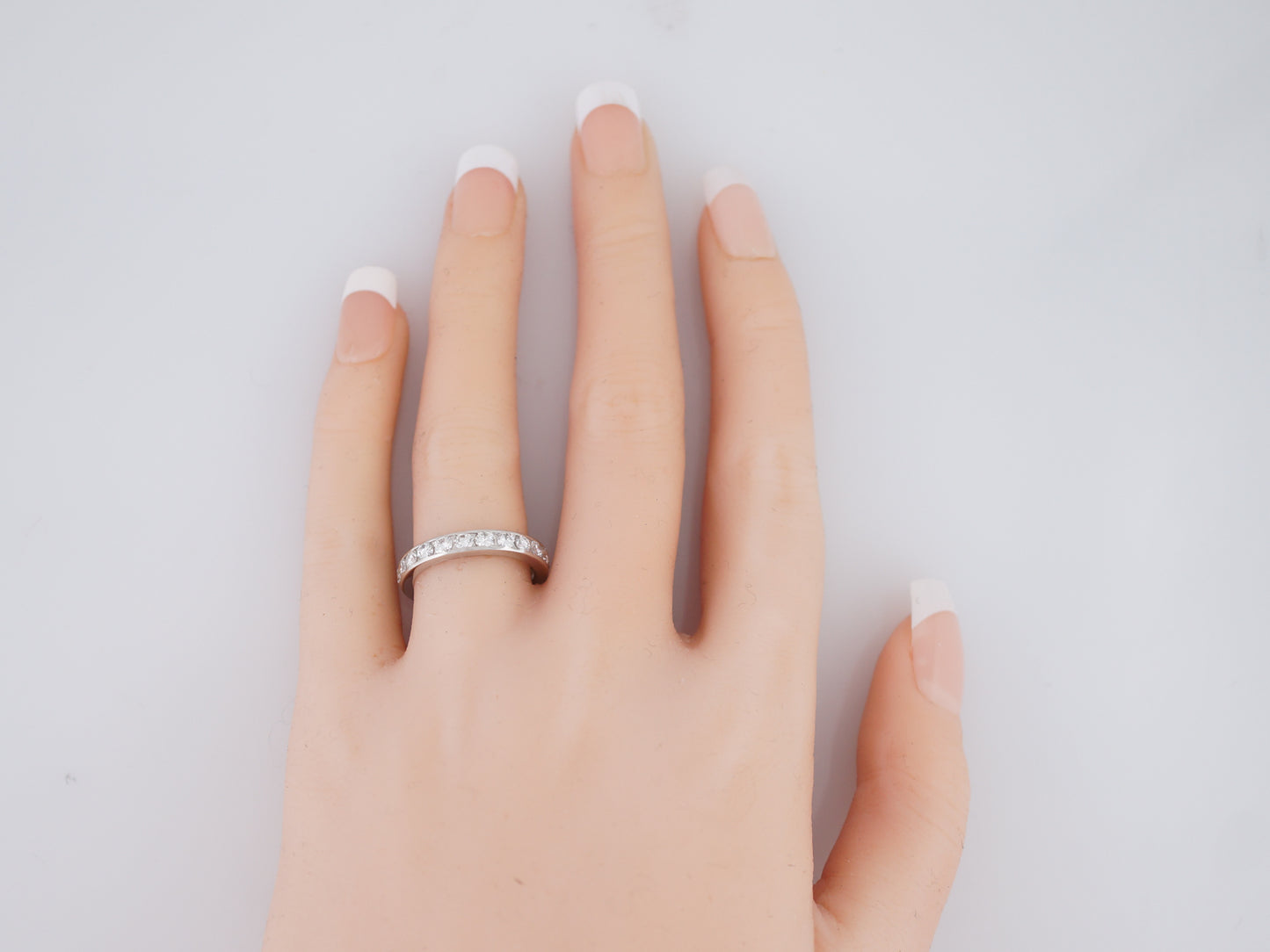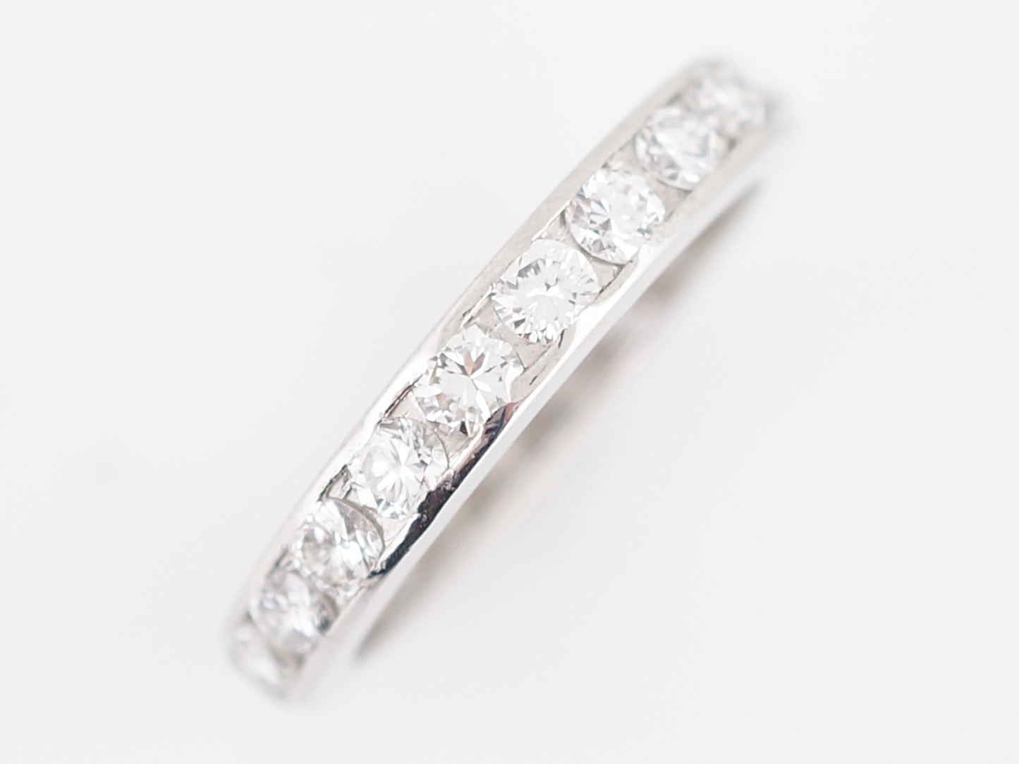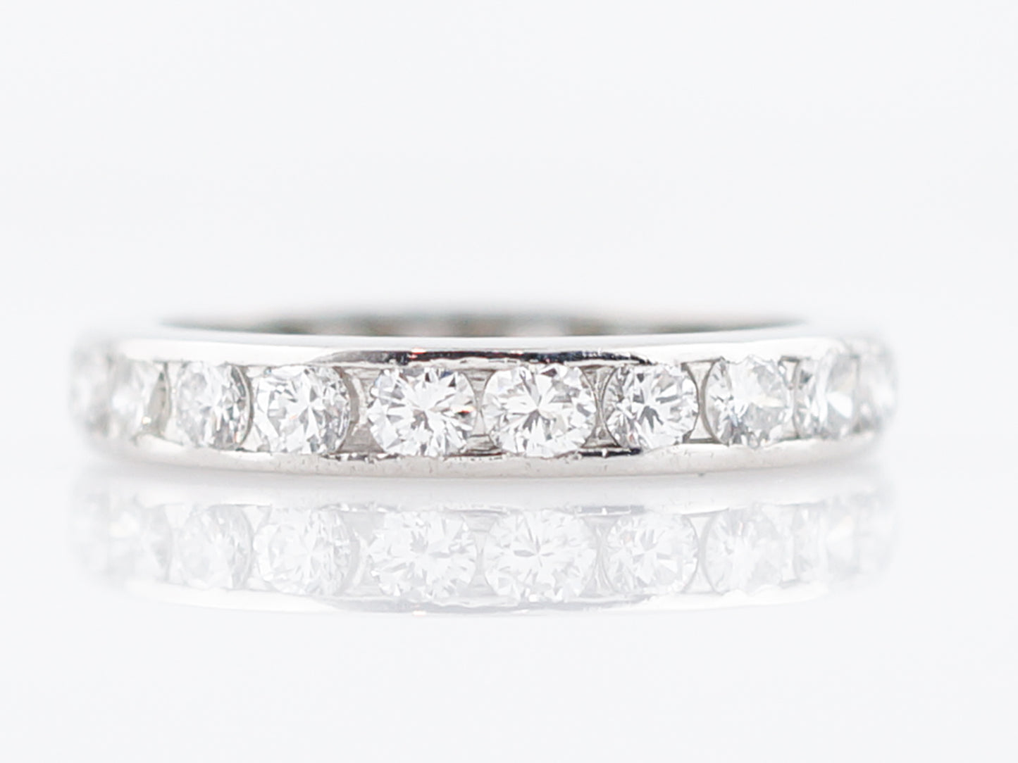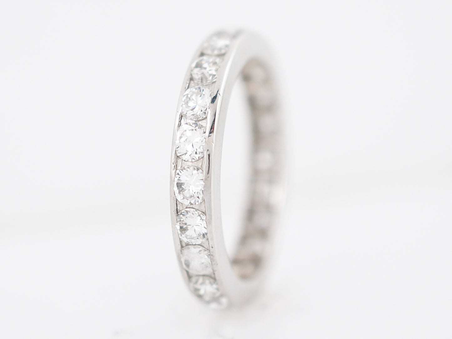 This Modern Era, eternity band style ring is an instant classic. Twenty-two (22) round brilliant cut diamonds are channel set in platinum, weighing 1.60 carats total. This ring is an excellent edition to an engagement ring or a beautiful stand alone piece.
