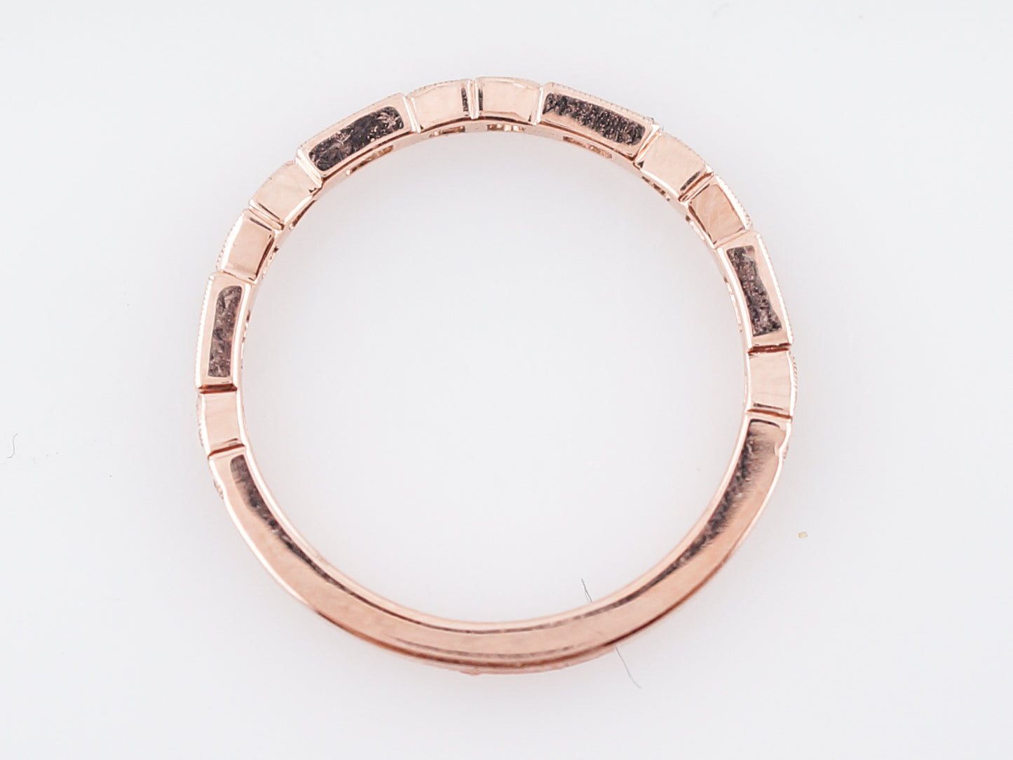 This Modern wedding band is made with warm 14k rose gold. This ring has diamonds covering two thirds of the band. The diamonds are a series of alternating baguettes and round diamonds. The round diamonds are set into triangular stations giving the band an interesting geometric pattern. Each diamond is trimmed in milgrain detail. This ring would make a lovely wedding band and would also be a cool addition to a ring stack.