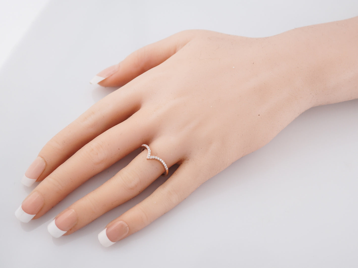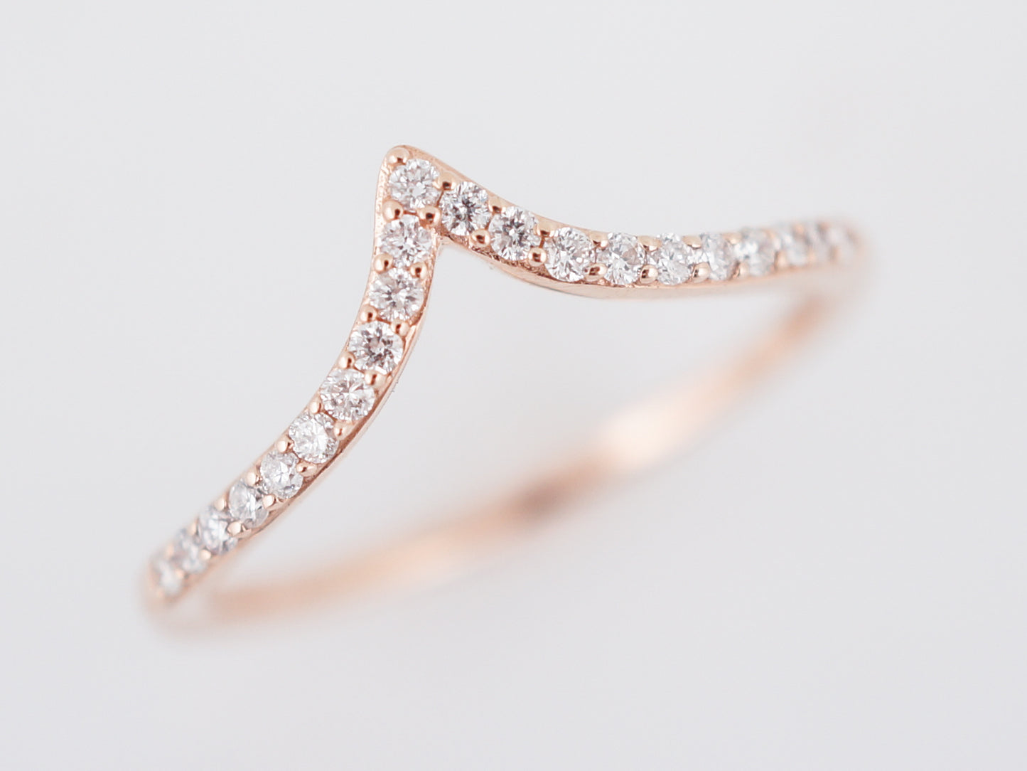 This v-shaped diamond band is an excellent modern twist to a traditional style. Set with .15 carats of round brilliant diamonds, this 14 karat gold ring is great on its own or paired with an engagement ring. Simple yet interesting, its hard not to love this style.