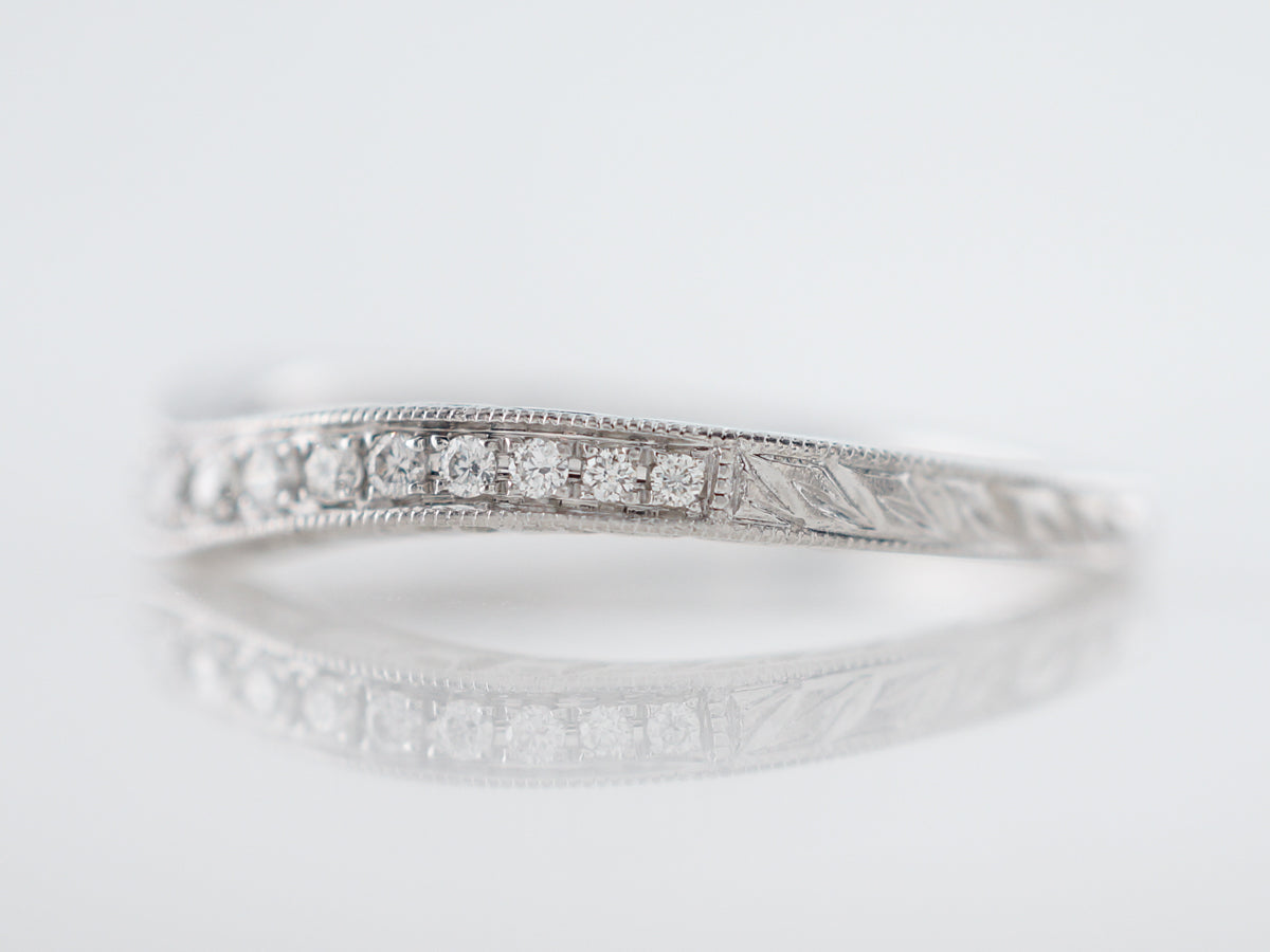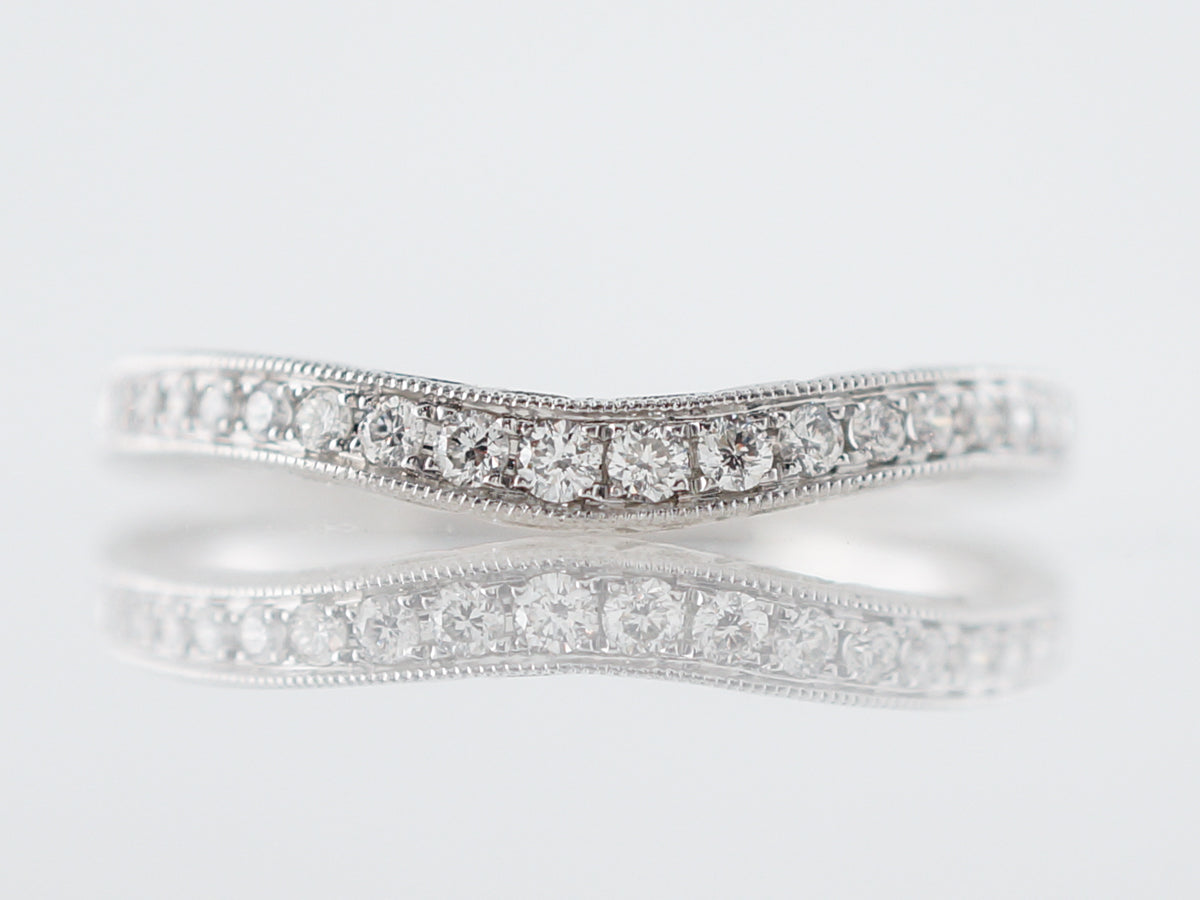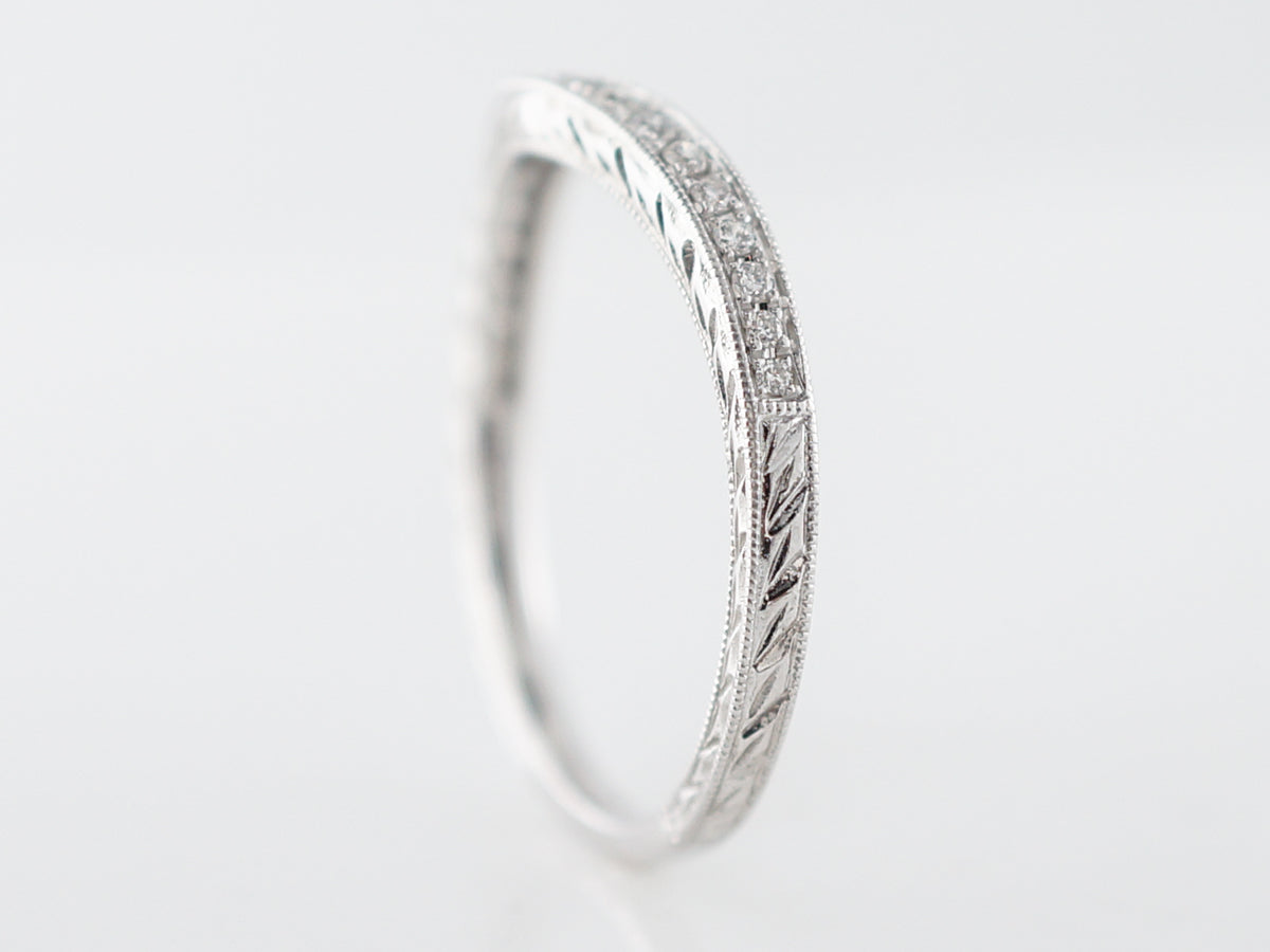 This modern diamond wedding band is made with round brilliant cut diamonds. This ring has eighteen (18) diamonds for a total of .17 total carat weight. This band is made with bright 14k white gold and has a curved shape that nestles around an engagement ring.
