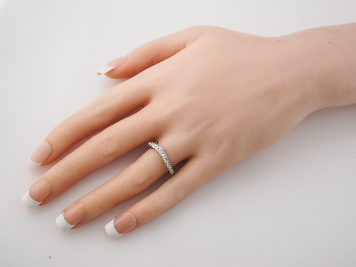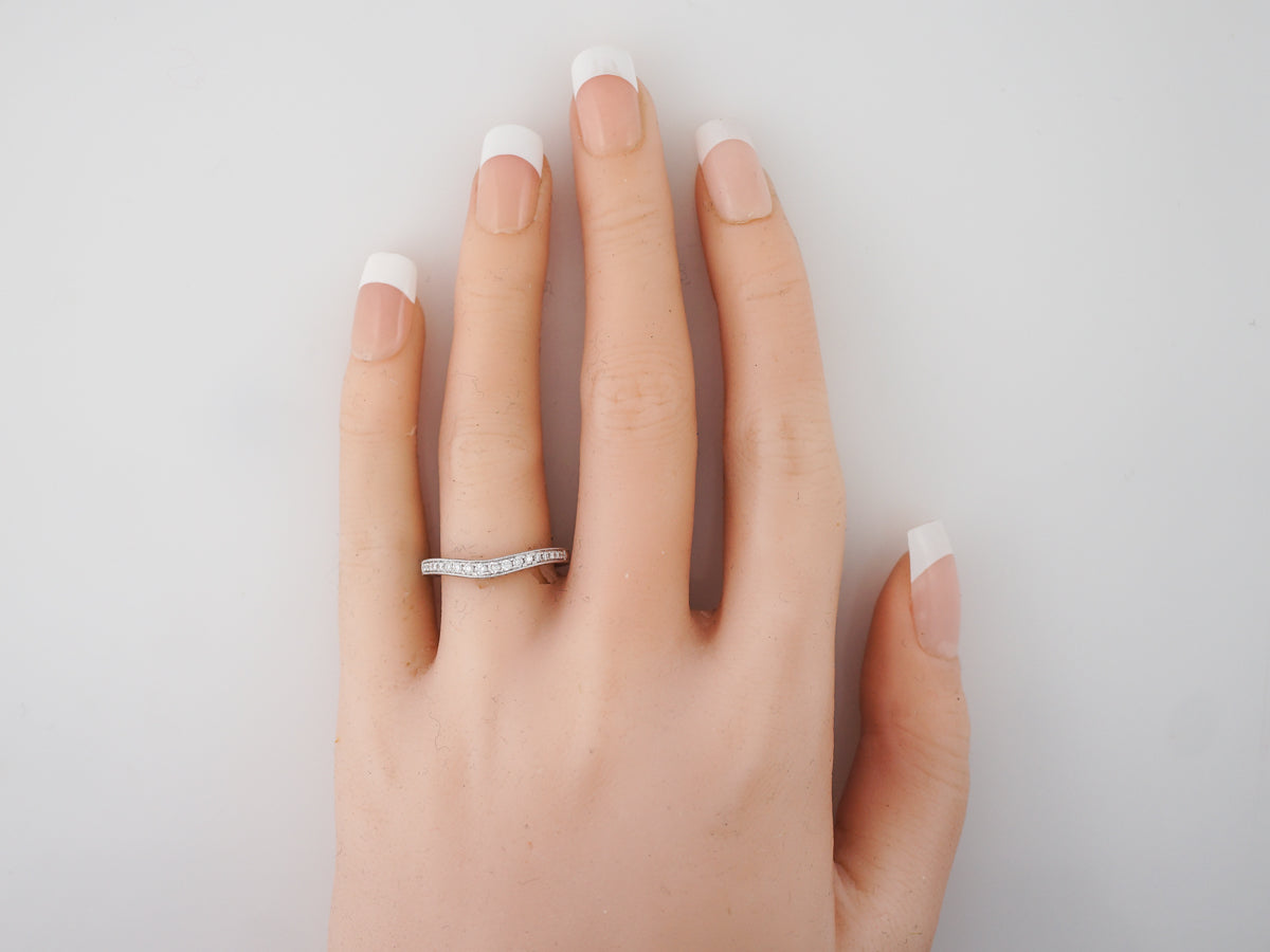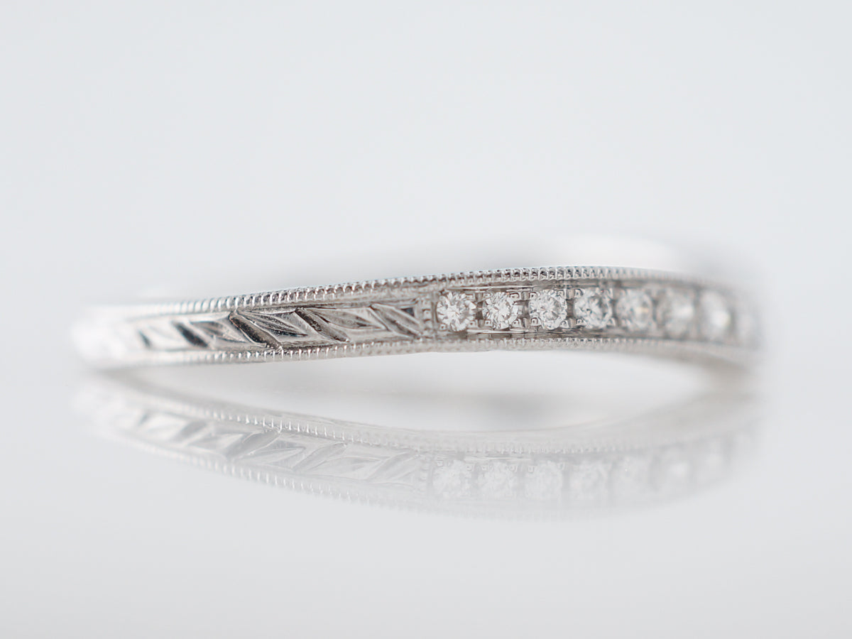 This modern diamond wedding band is made with round brilliant cut diamonds. This ring has eighteen (18) diamonds for a total of .17 total carat weight. This band is made with bright 14k white gold and has a curved shape that nestles around an engagement ring.
