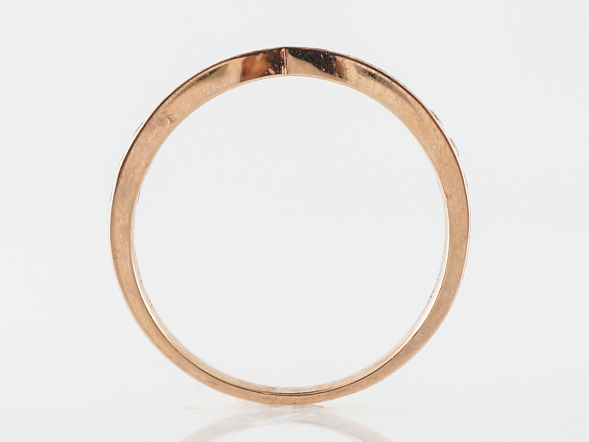 This unique wedding band features twelve round brilliant cut diamonds set across the face. The diamonds are prong set in 14k rose gold and the top of the band is pinched in, allowing the band to snuggle in next to an engagement ring. A wonderful ring to pair with a rose gold engagement ring or even a white metal if your looking to mix and match tones.