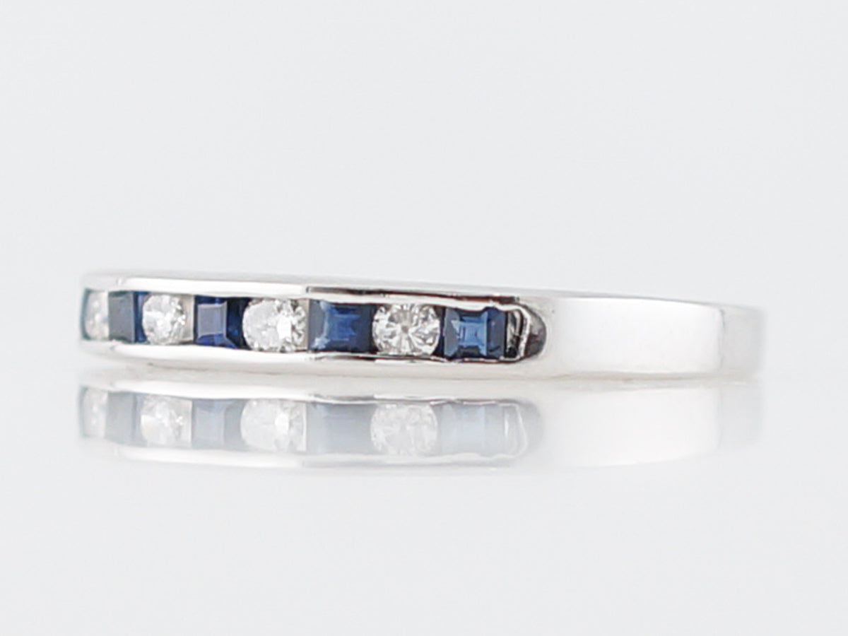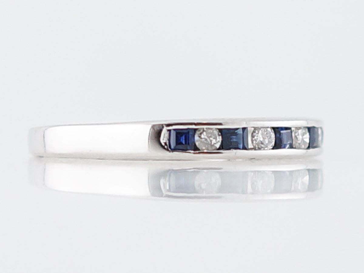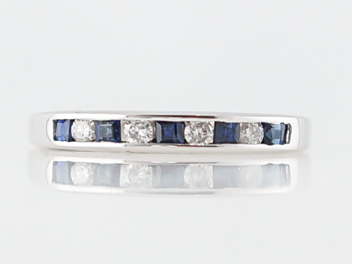 This modern sapphire and diamond wedding band is channel set in 18k white gold with alternating sapphires and round brilliant diamonds. The play of color is gorgeous and this band would pair well with a diamond or sapphire engagement ring.