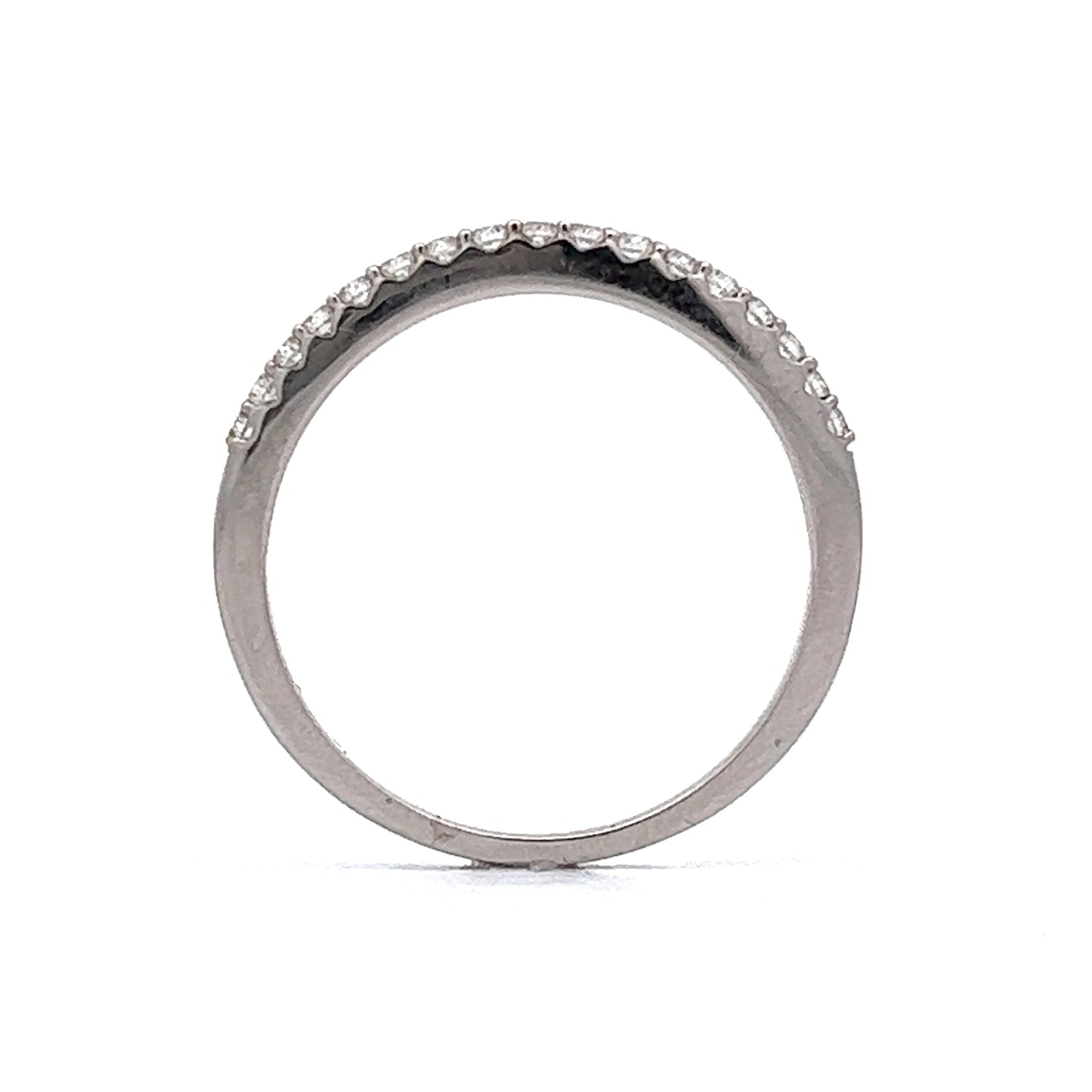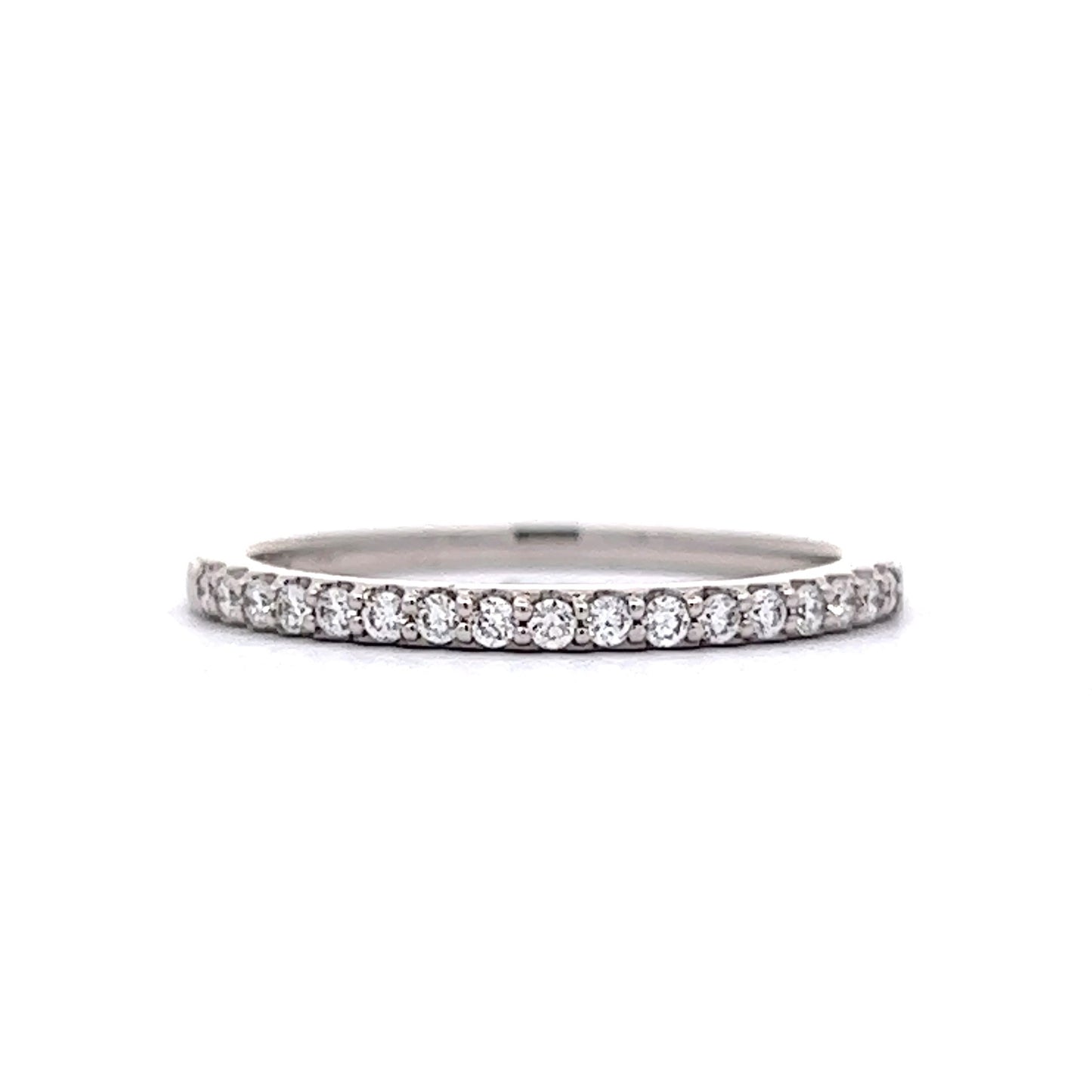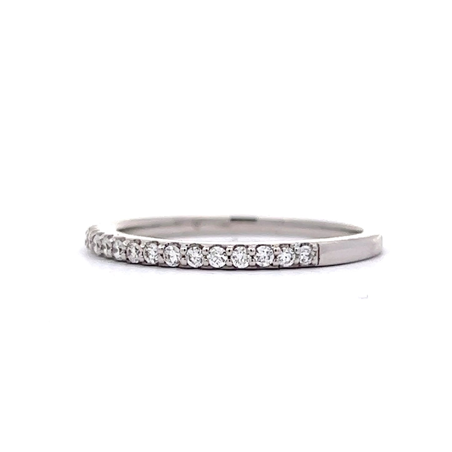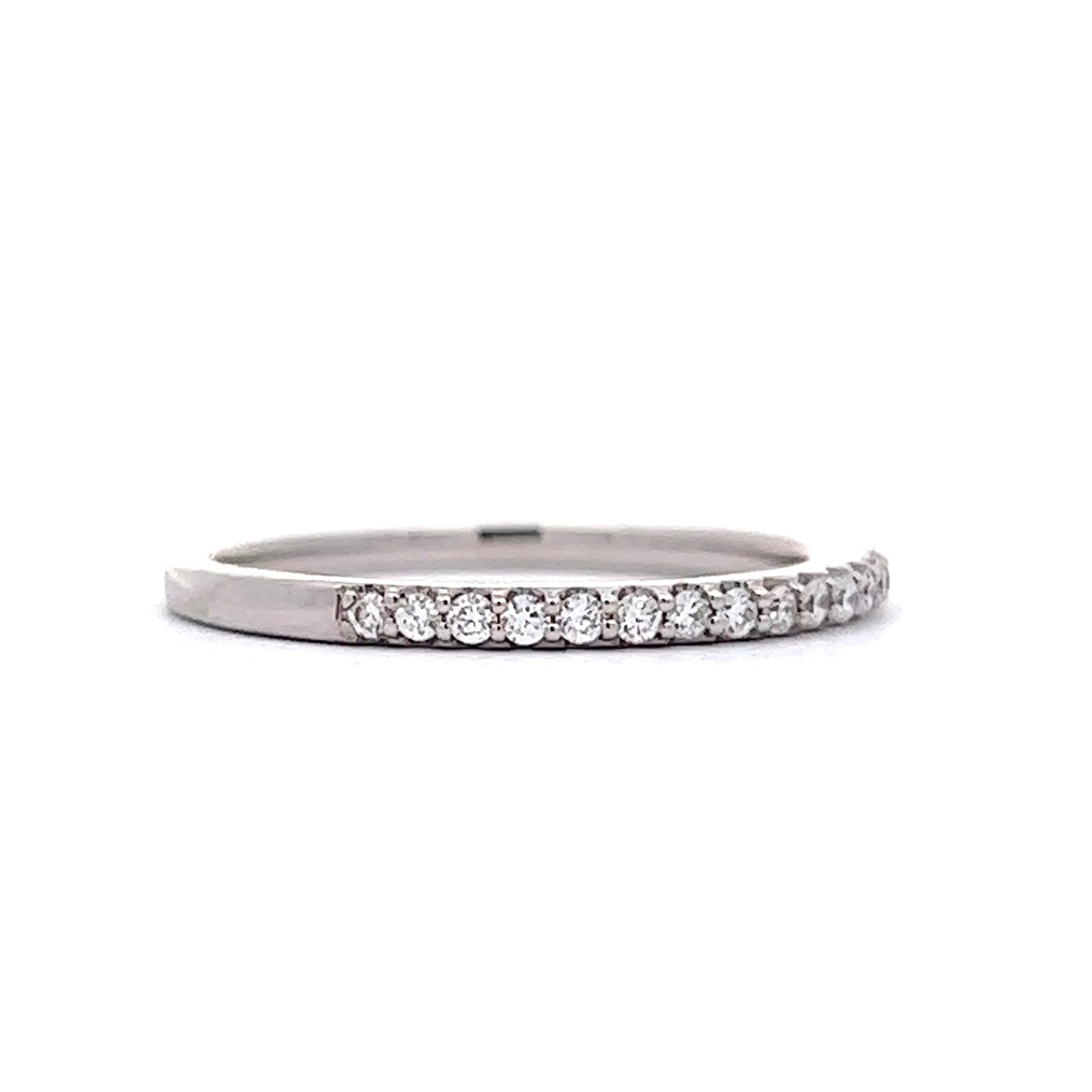 This diamond wedding band features seventeen (17) prong set diamonds set in 14 karat white gold. The diamonds are set half way around the length of the band and provide a beautiful shimmer from every angle. This band would pair well with most any antique or modern engagement ring or stack.